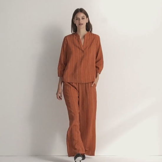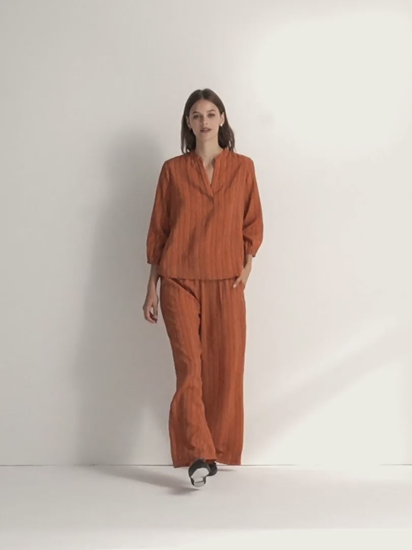 Blusa de cuello mao en forma de pico con manga francesa y puño con goma elástica. Blusa estampada en una raya muy diluida que le aporta a la prenda un corte limpio y versátil para looks urbanos y funcionales. Regular fit.