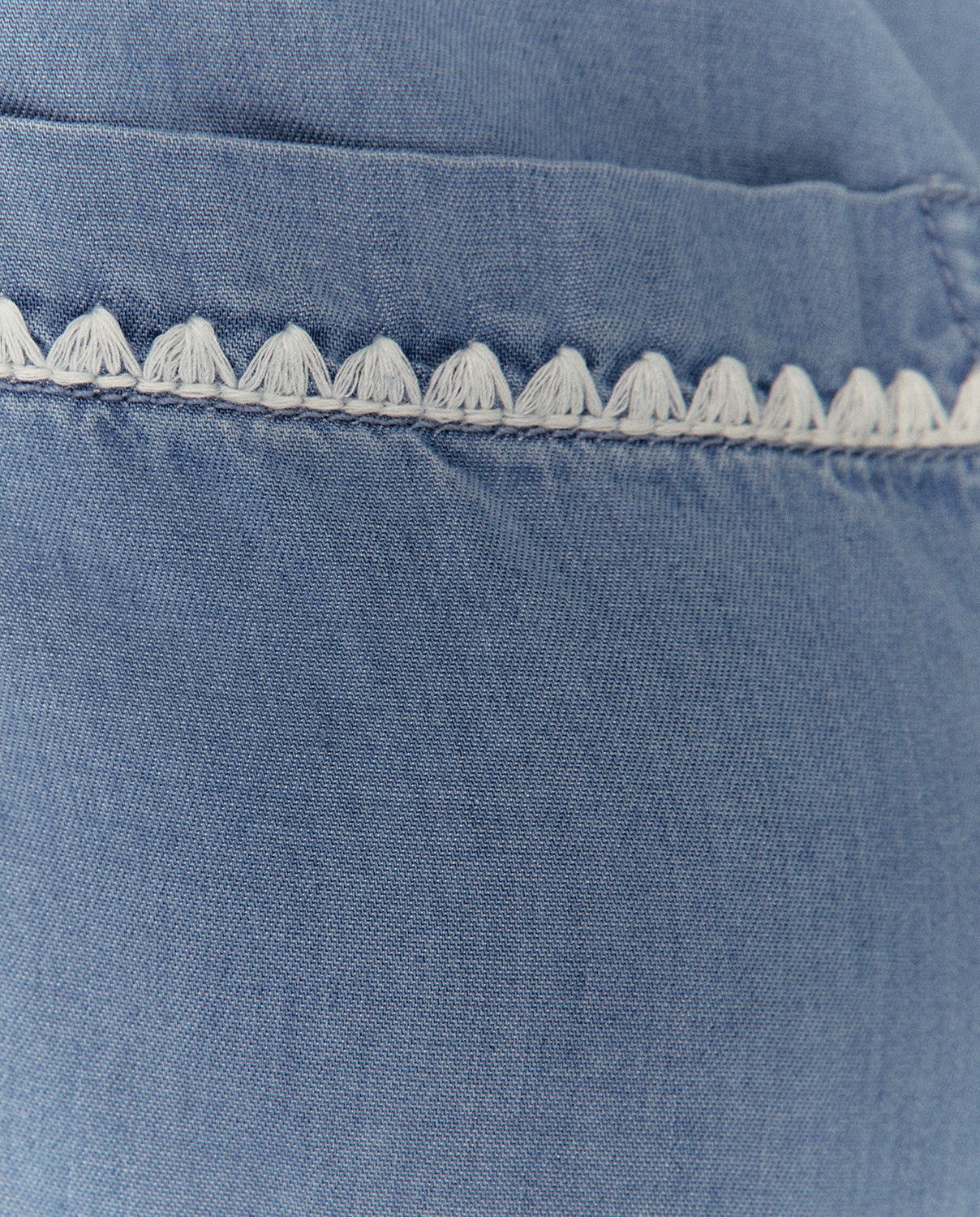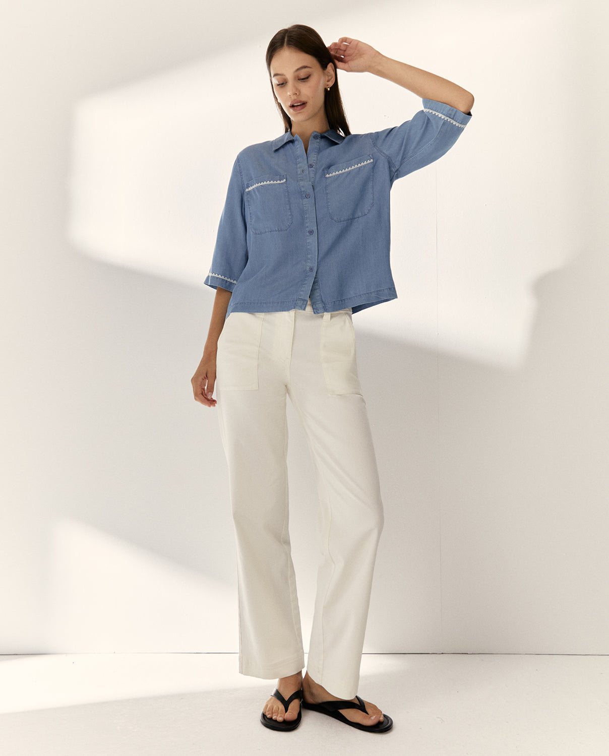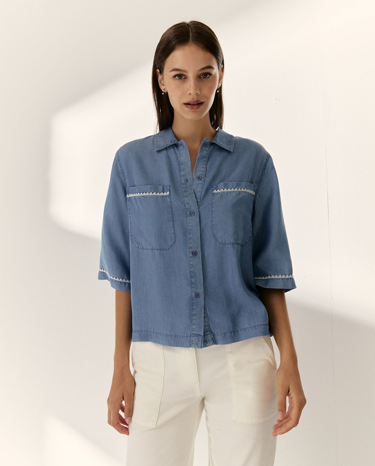 Camisa confeccionada en tejido de lyocell, con cuello camisero y manga corta a codo. Cierre frontal con botones y bolsillos en pecho. Detalle de cinta ondulada a contraste en manga y bolsillos. Regular fit.