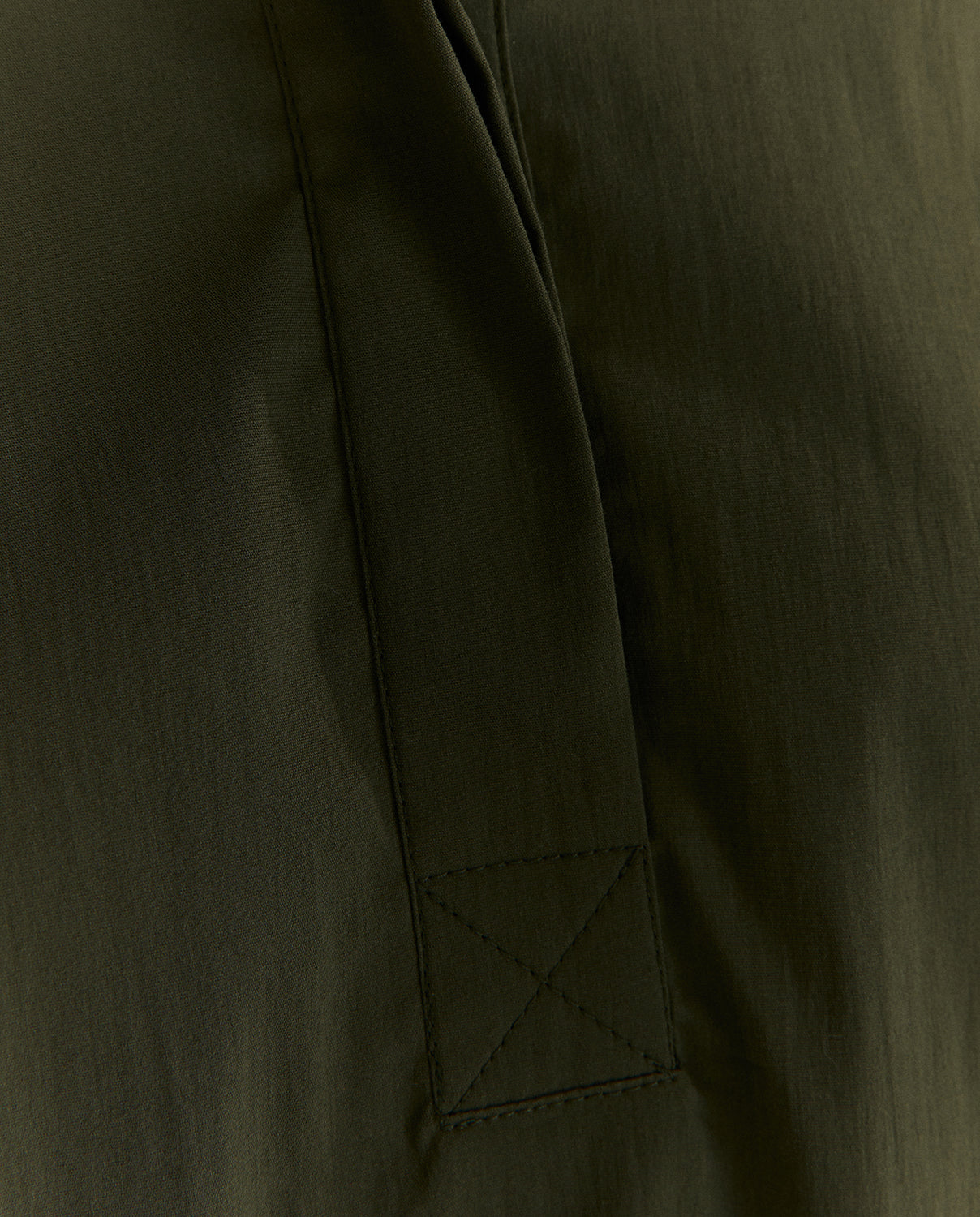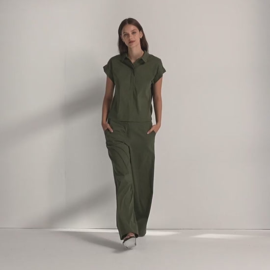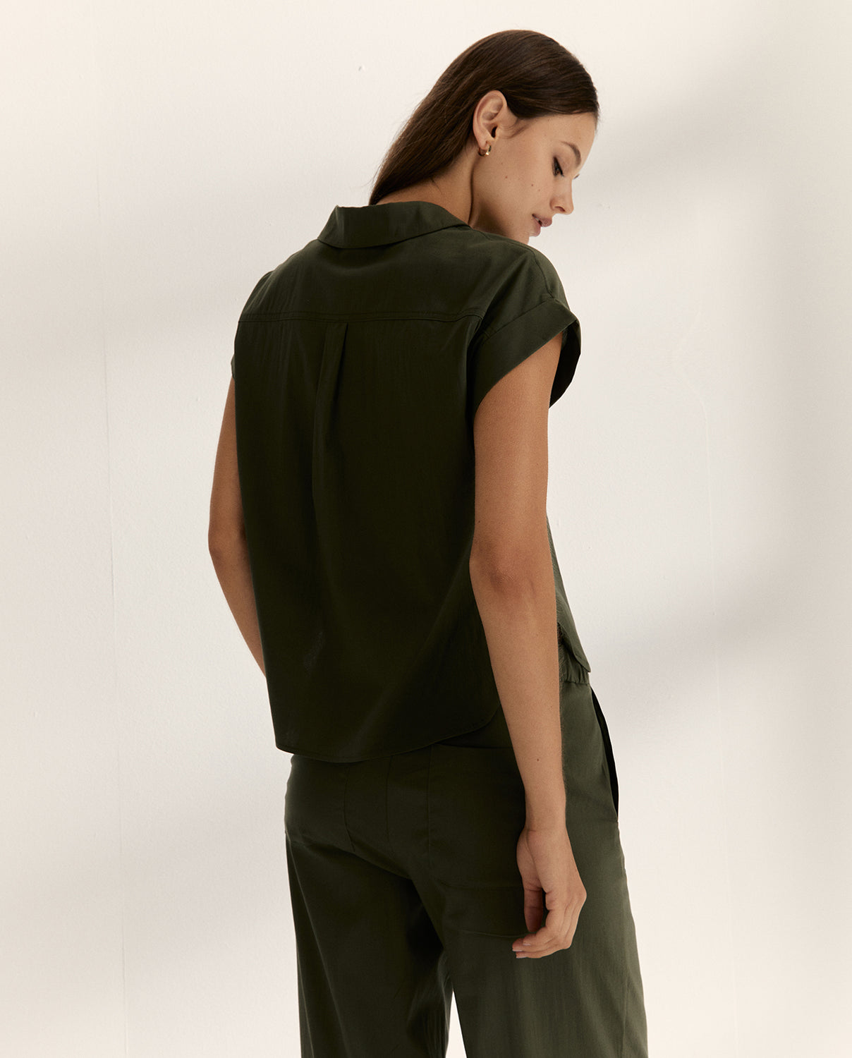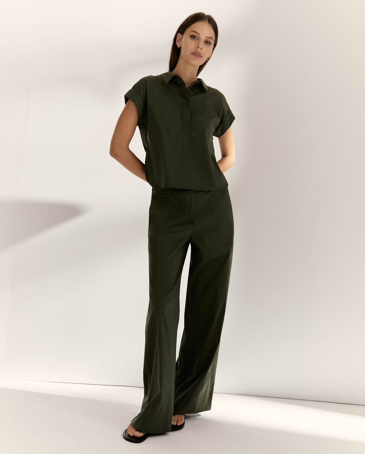 Camisa de popelín elástico de manga caída con vuelta y cuello camisero. Cierre frontal con tapeta y botones ocultos. Puedes encontrar su pantalón a conjunto y conseguir un total look muy confortable y femenino. Regular fit.