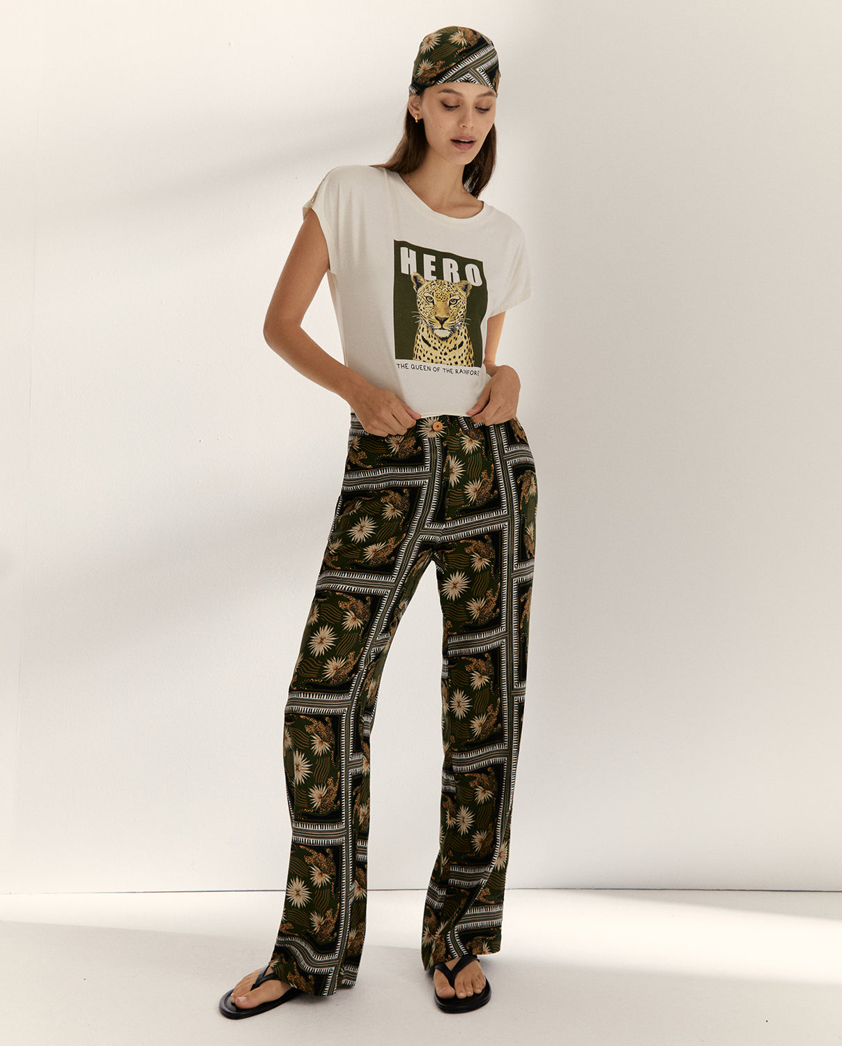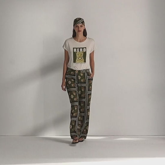 Camiseta de cuello redondo con manga caída, decorada con una cinta de paillettes en dorado que aporta una acabado diferencial. Presenta un dibujo frontal que añade un toque moderno y juvenil. Regular fit.