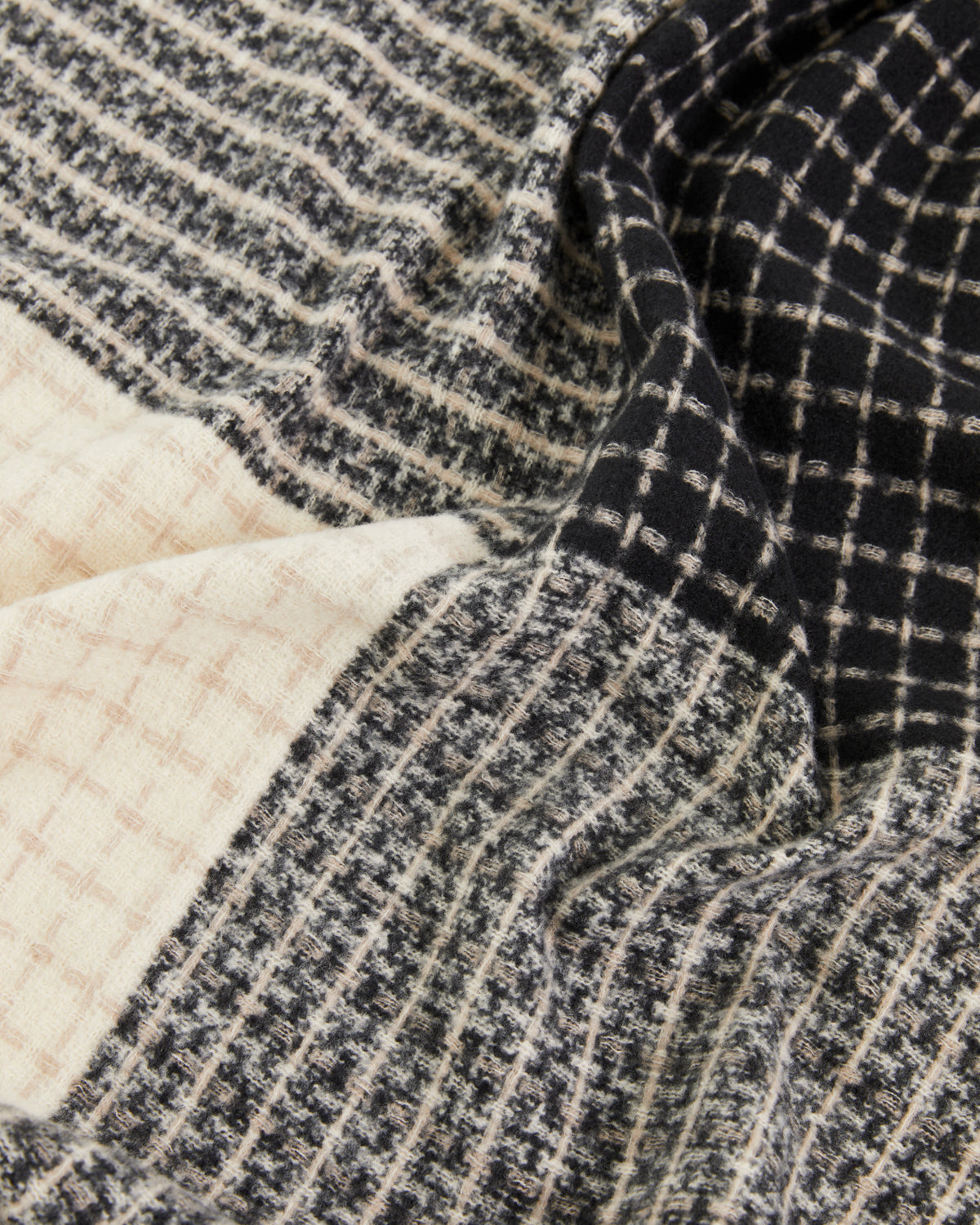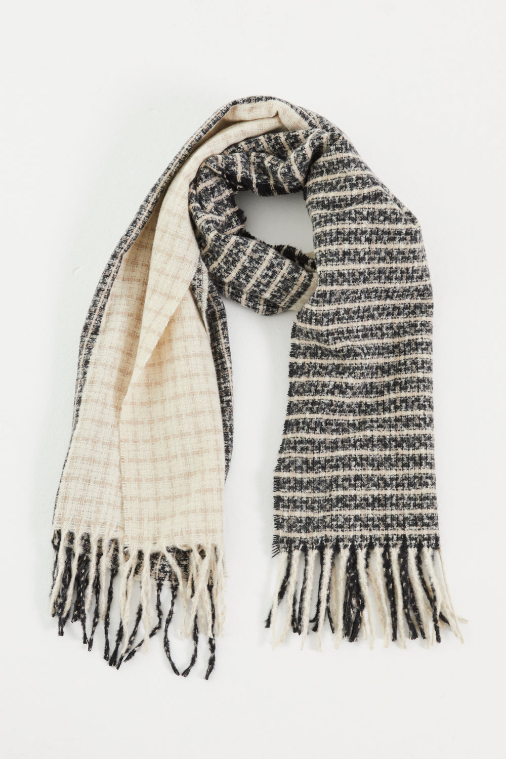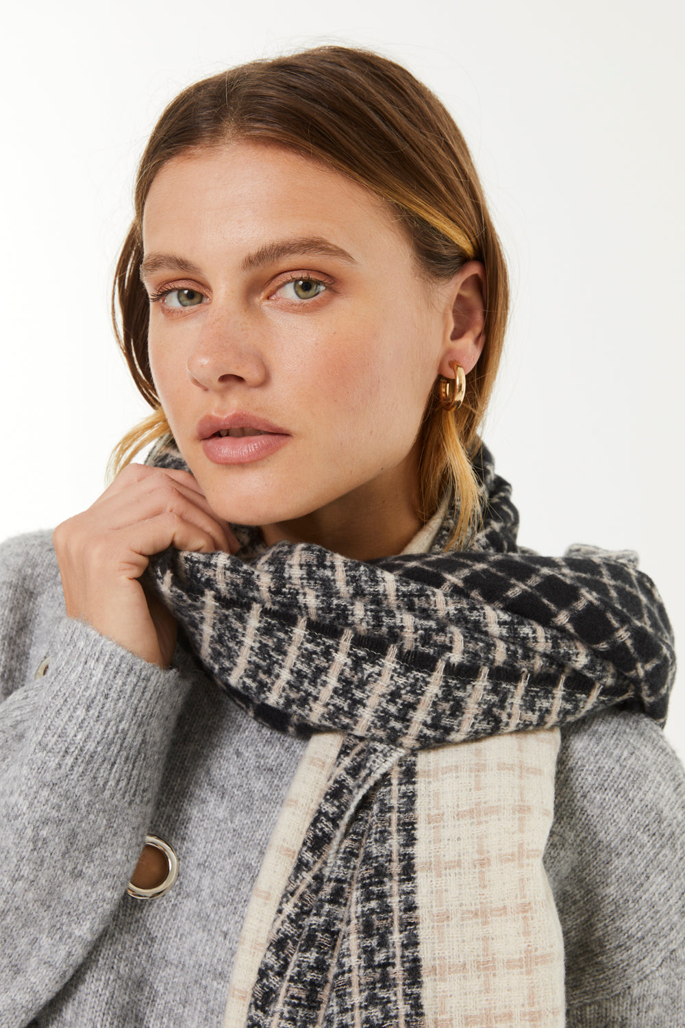Two-tone plaid print scarf with fringes. Ideal for complementing any look, this scarf is characterized by its softness and timeless style, making it a versatile piece for a variety of occasions.
