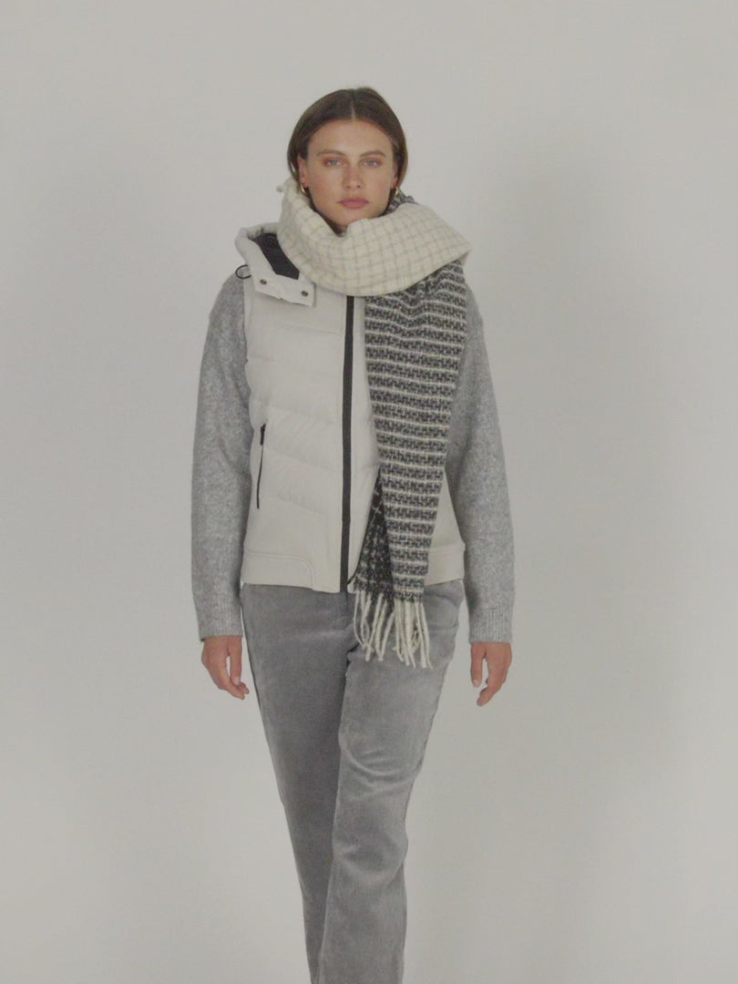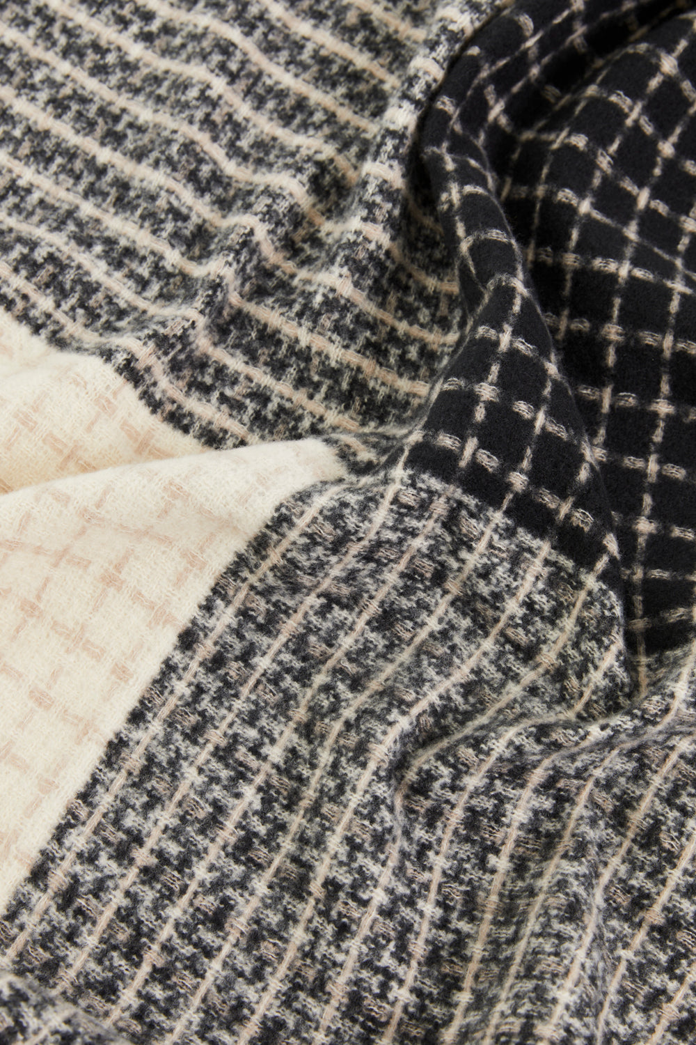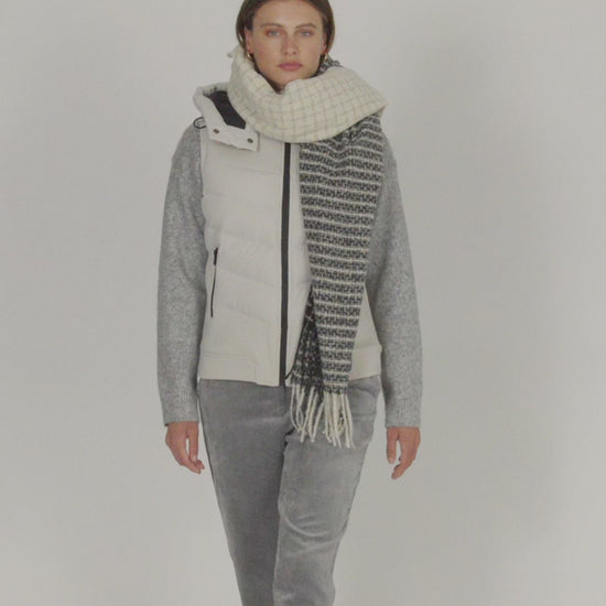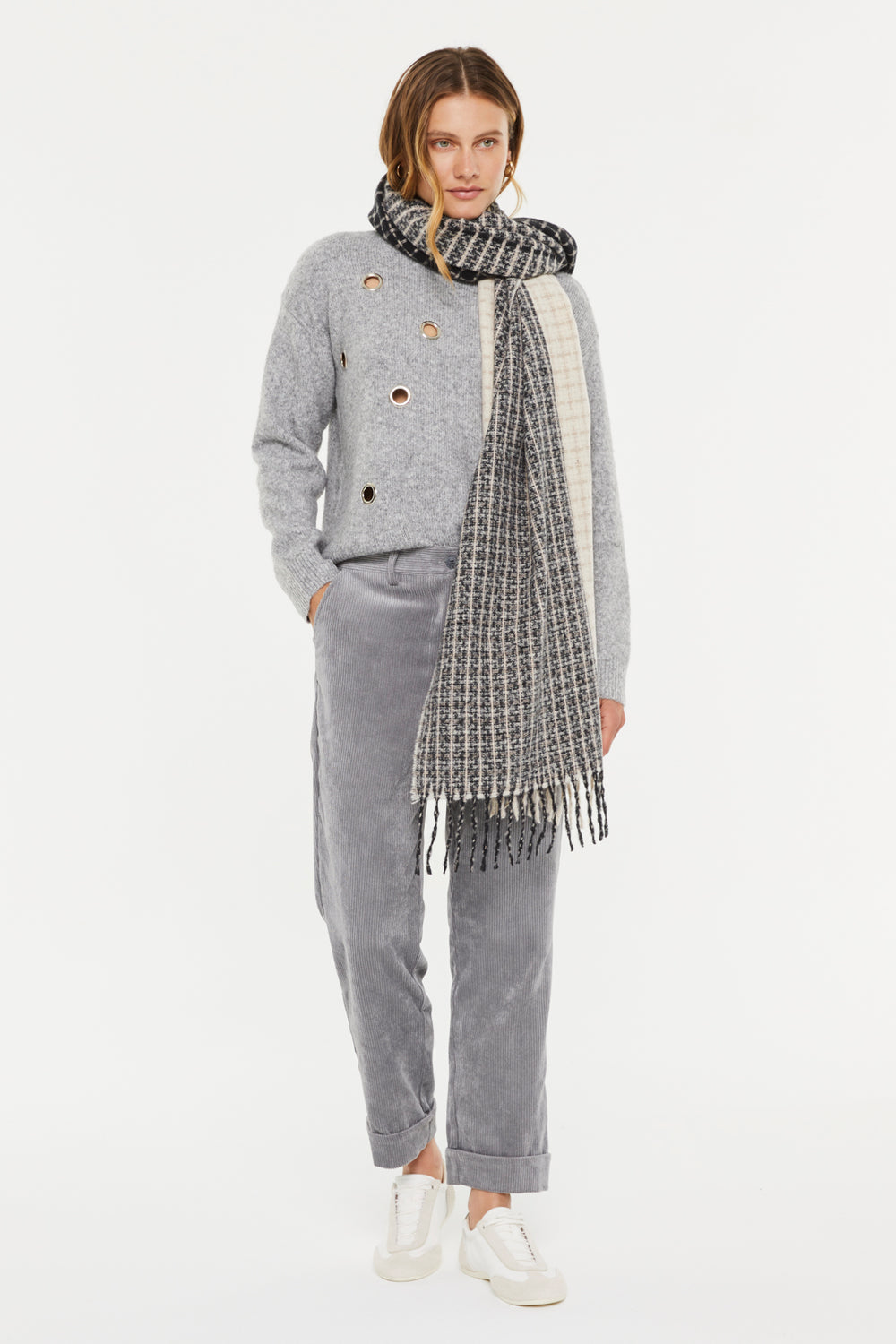 Two-tone plaid print scarf with fringes. Ideal for complementing any look, this scarf is characterized by its softness and timeless style, making it a versatile piece for a variety of occasions.