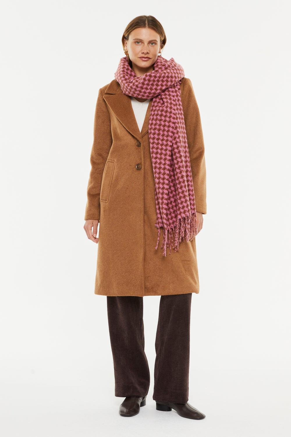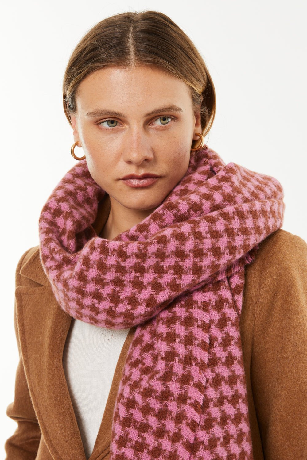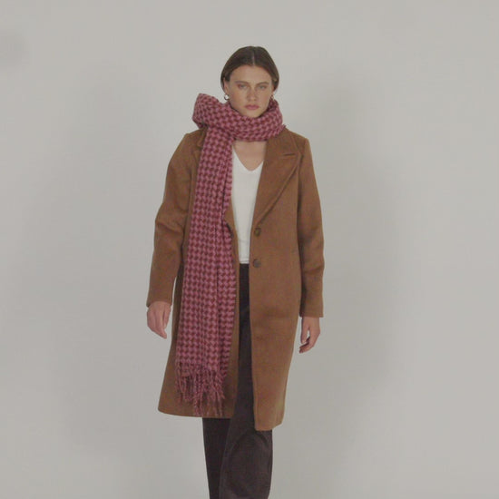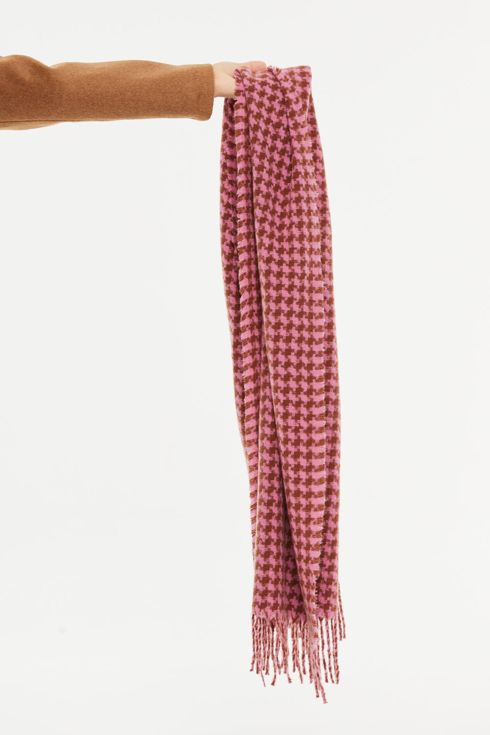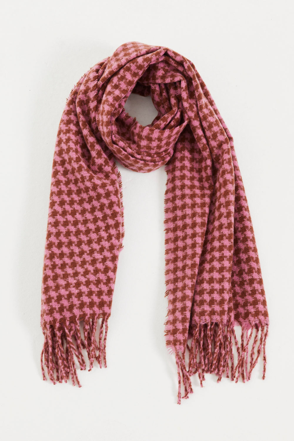 Pink houndstooth print scarf with long fringes. Ideal for complementing any look, this scarf is characterized by its softness and timeless style, making it a versatile piece for a variety of occasions.