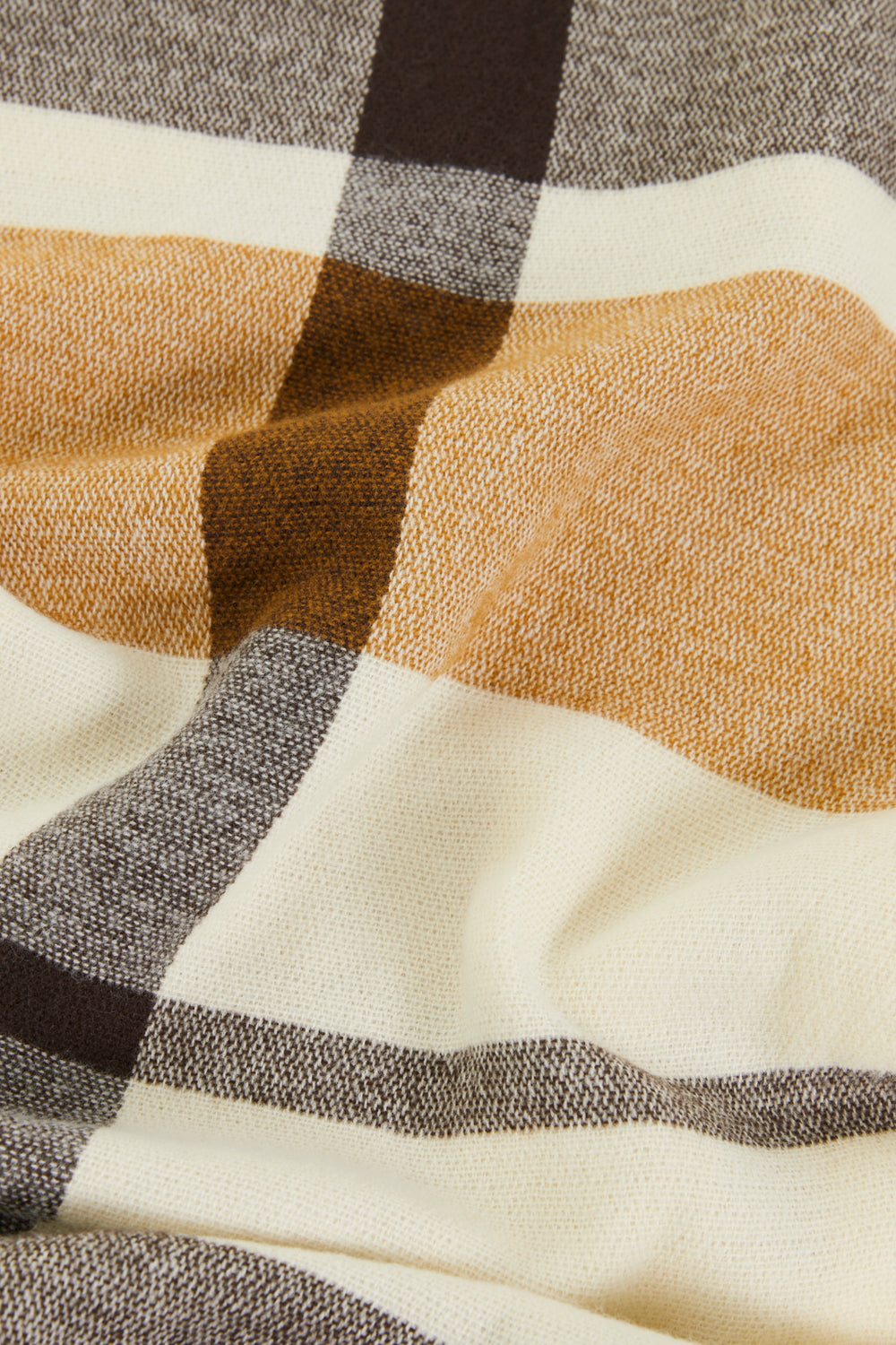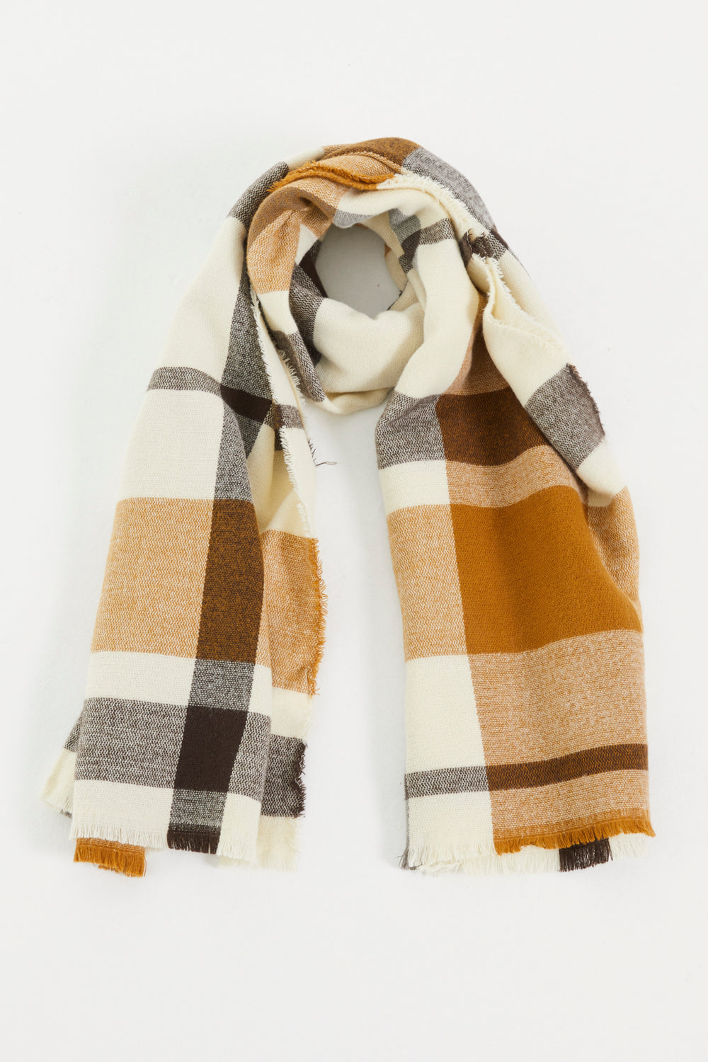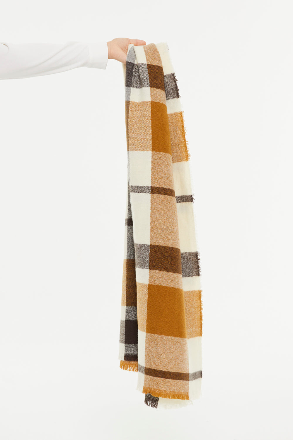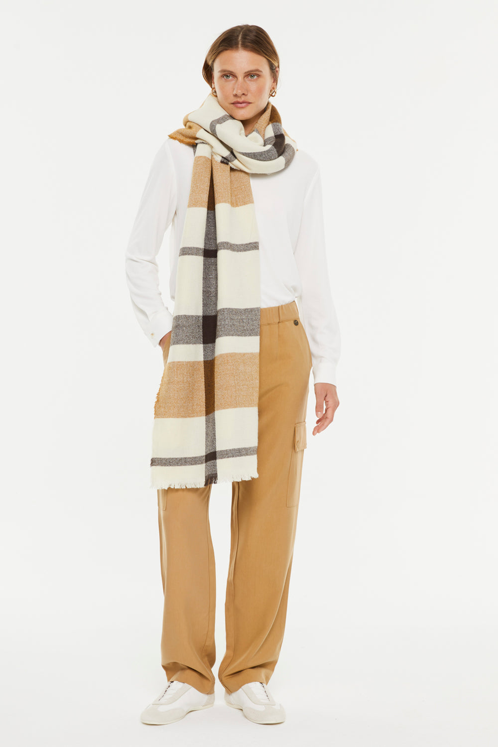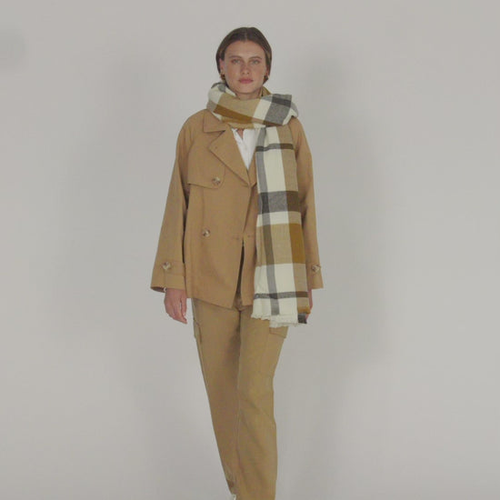 Brown plaid print scarf with short fringes. Ideal for complementing any of your looks. This scarf is characterized by its softness and timeless style, making it a very versatile piece.