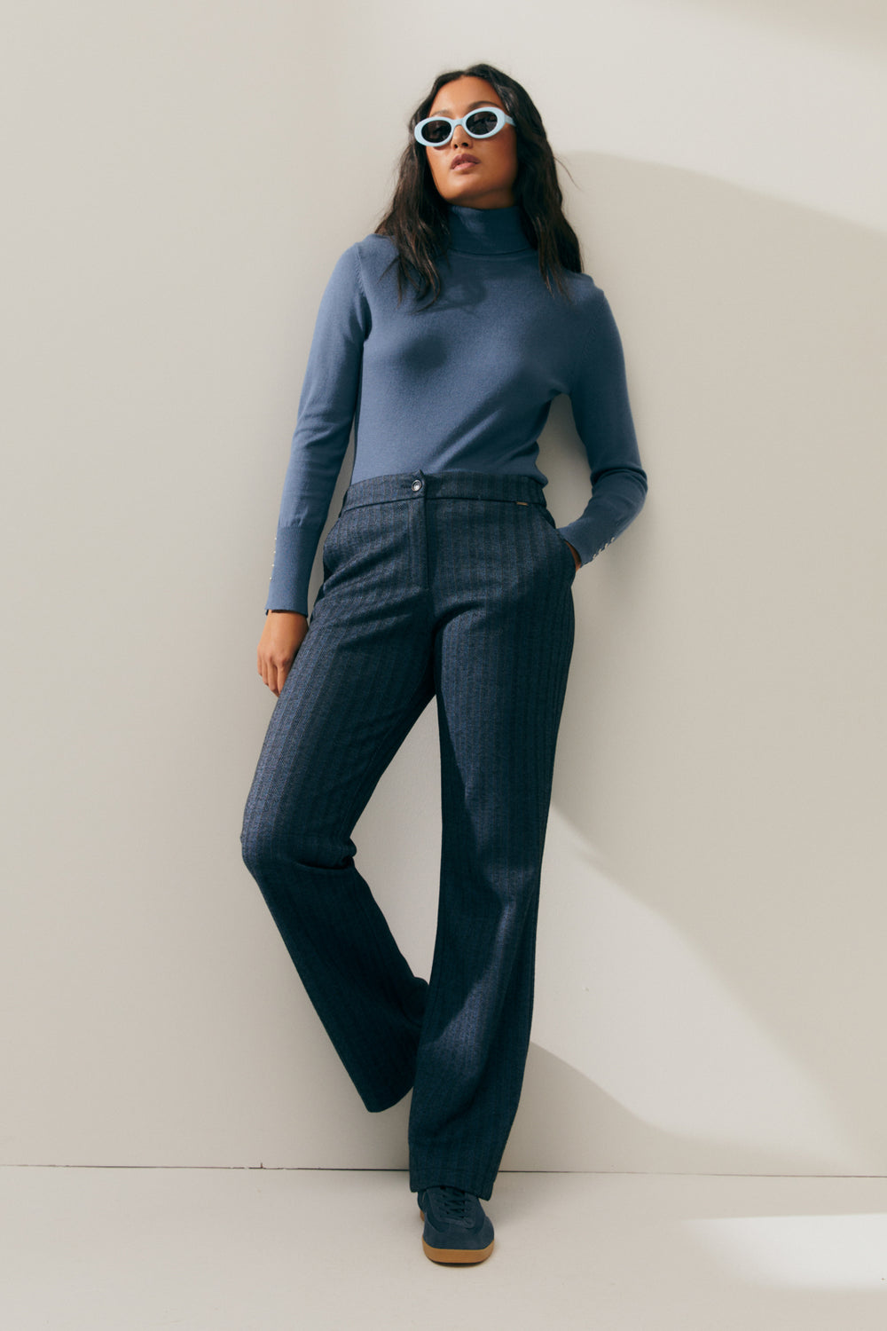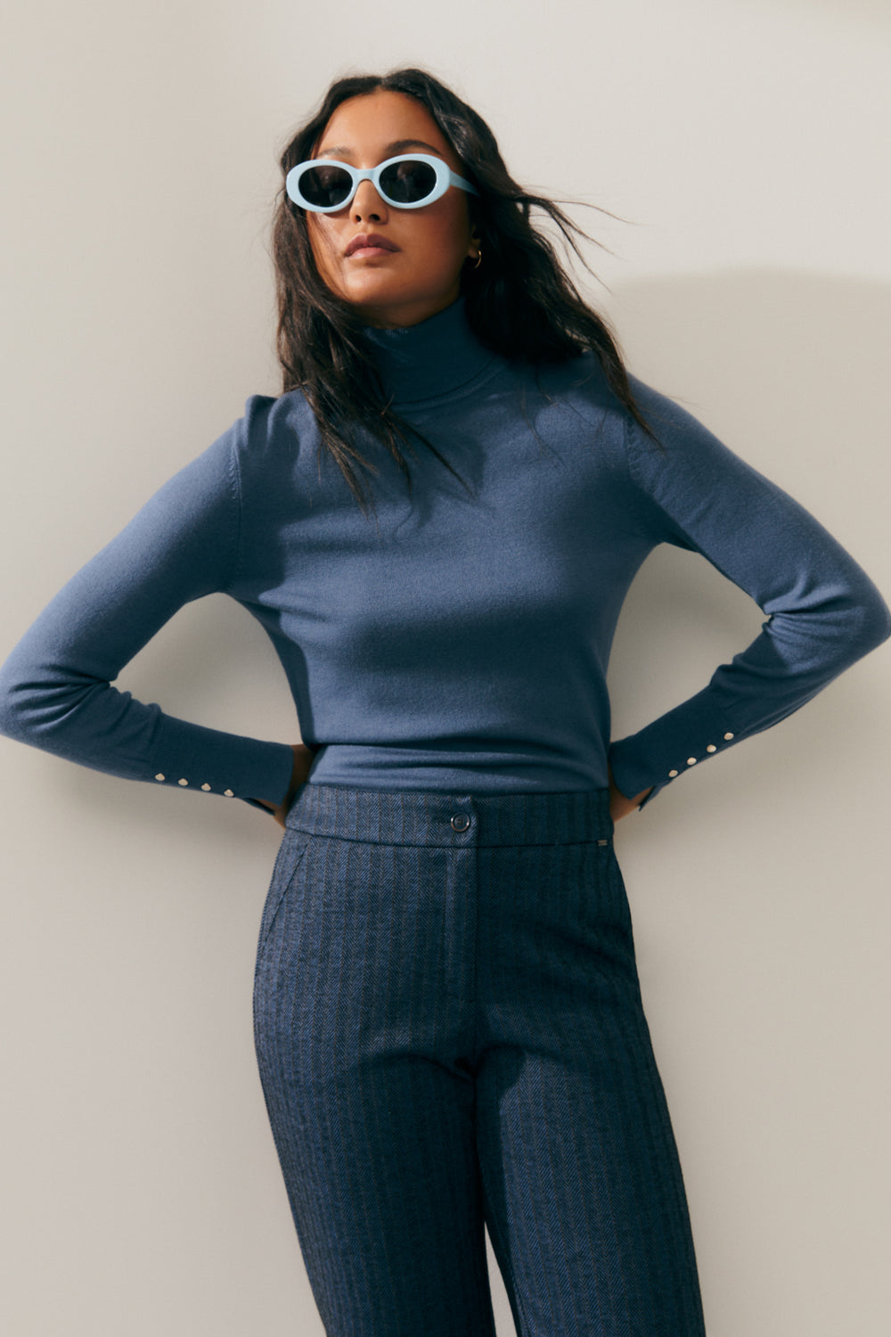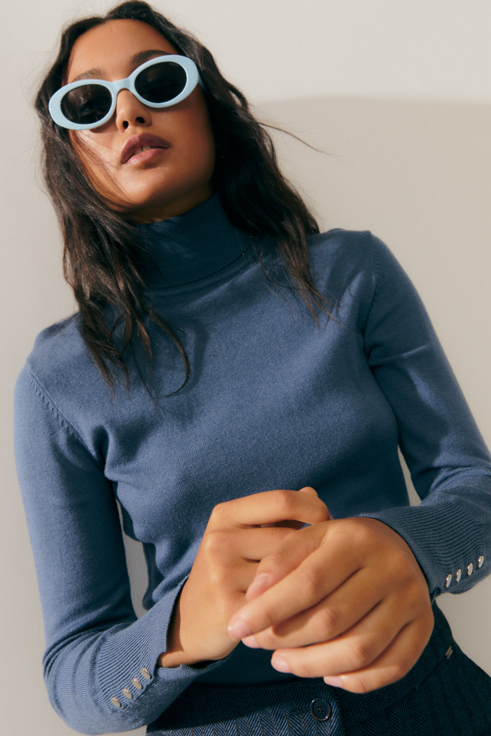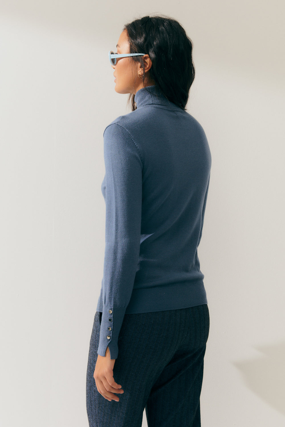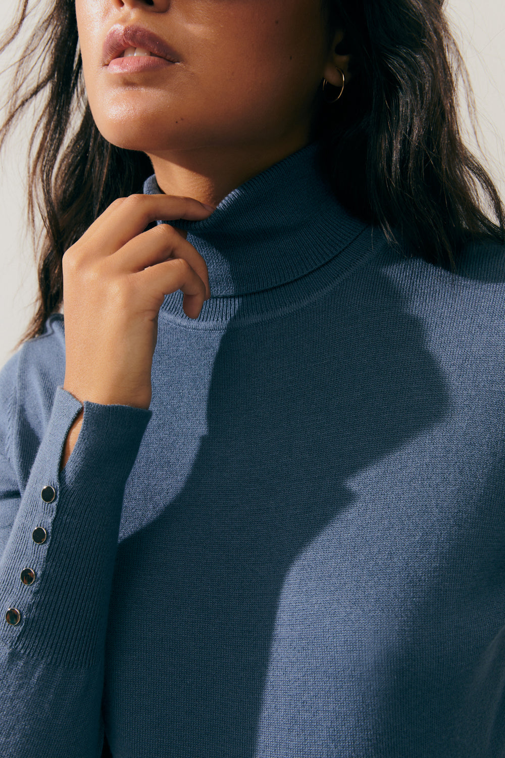 Basic fitted turtleneck sweater. Metal button detailing at the cuffs. This is a comfortable sweater with a timeless style that's a must-have in your wardrobe. It's the perfect sweater to pair with all your looks. Regular fit.
