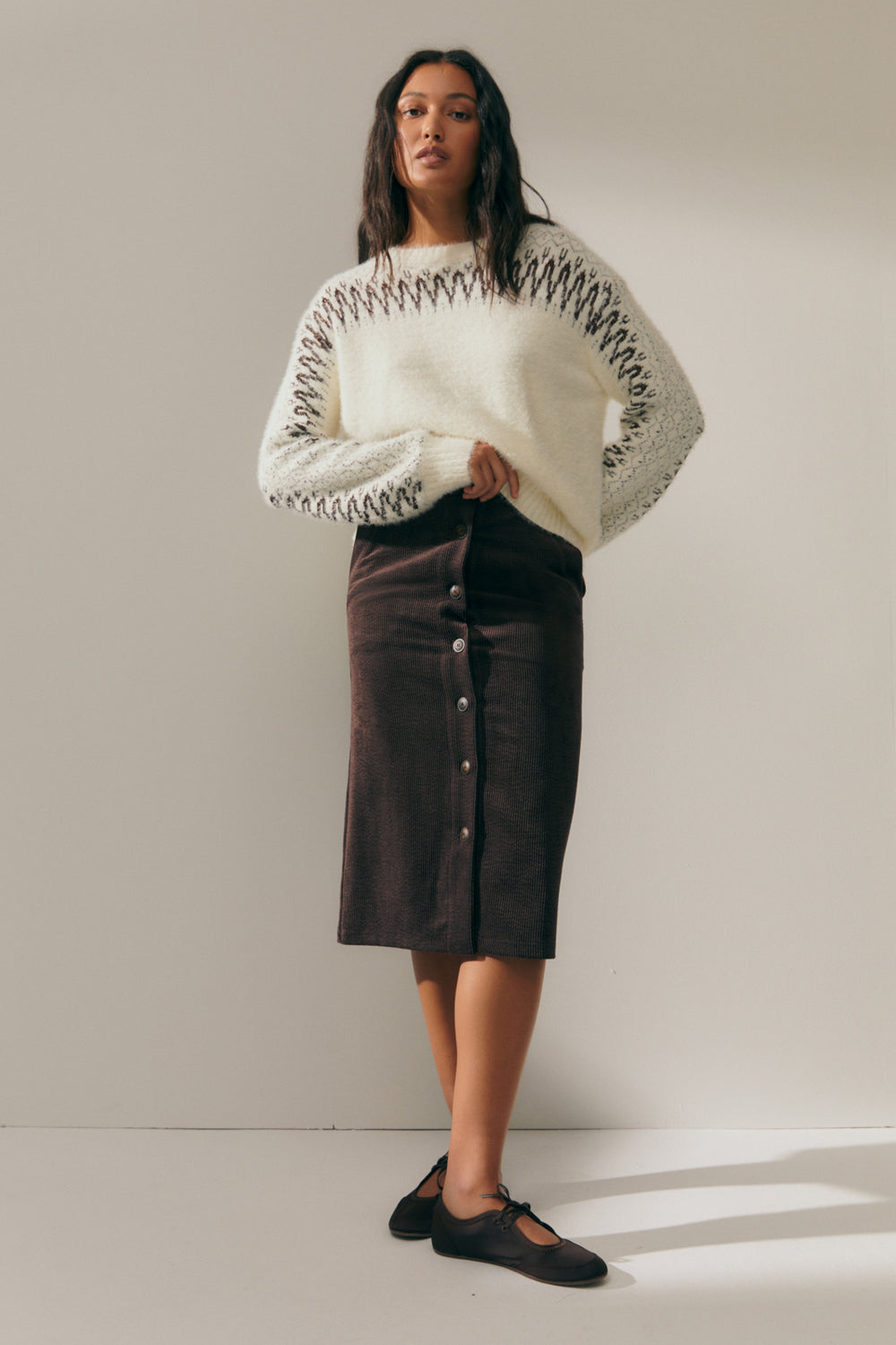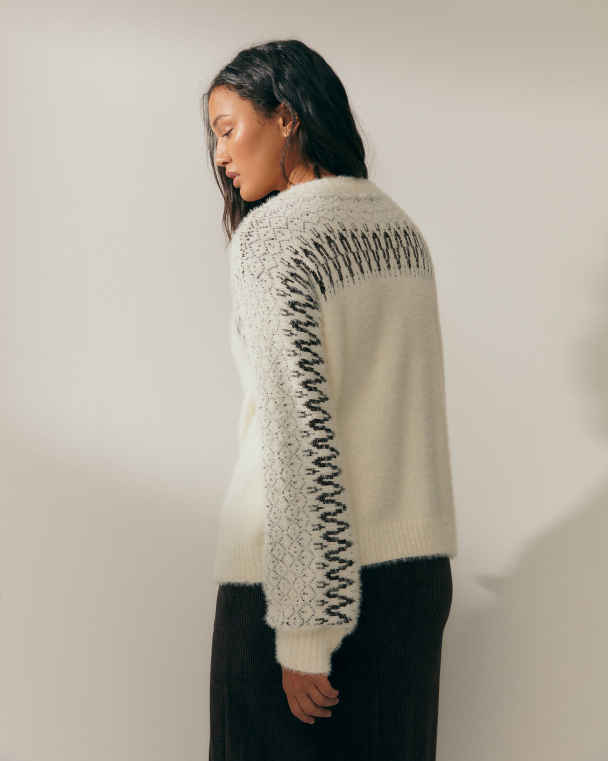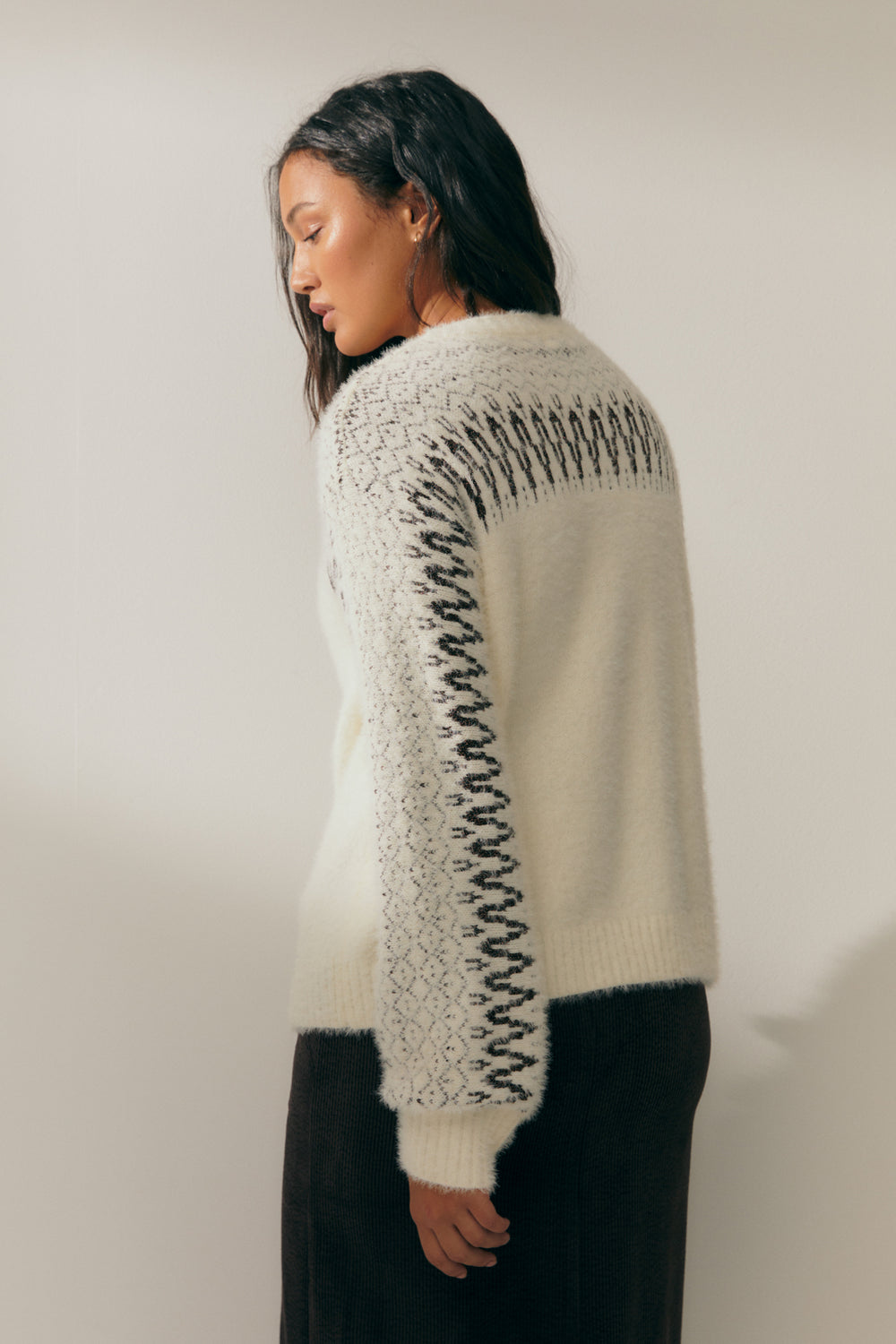 Faux fur jacquard sweater with metallic thread, round neck, and long sleeves. Regular fit.