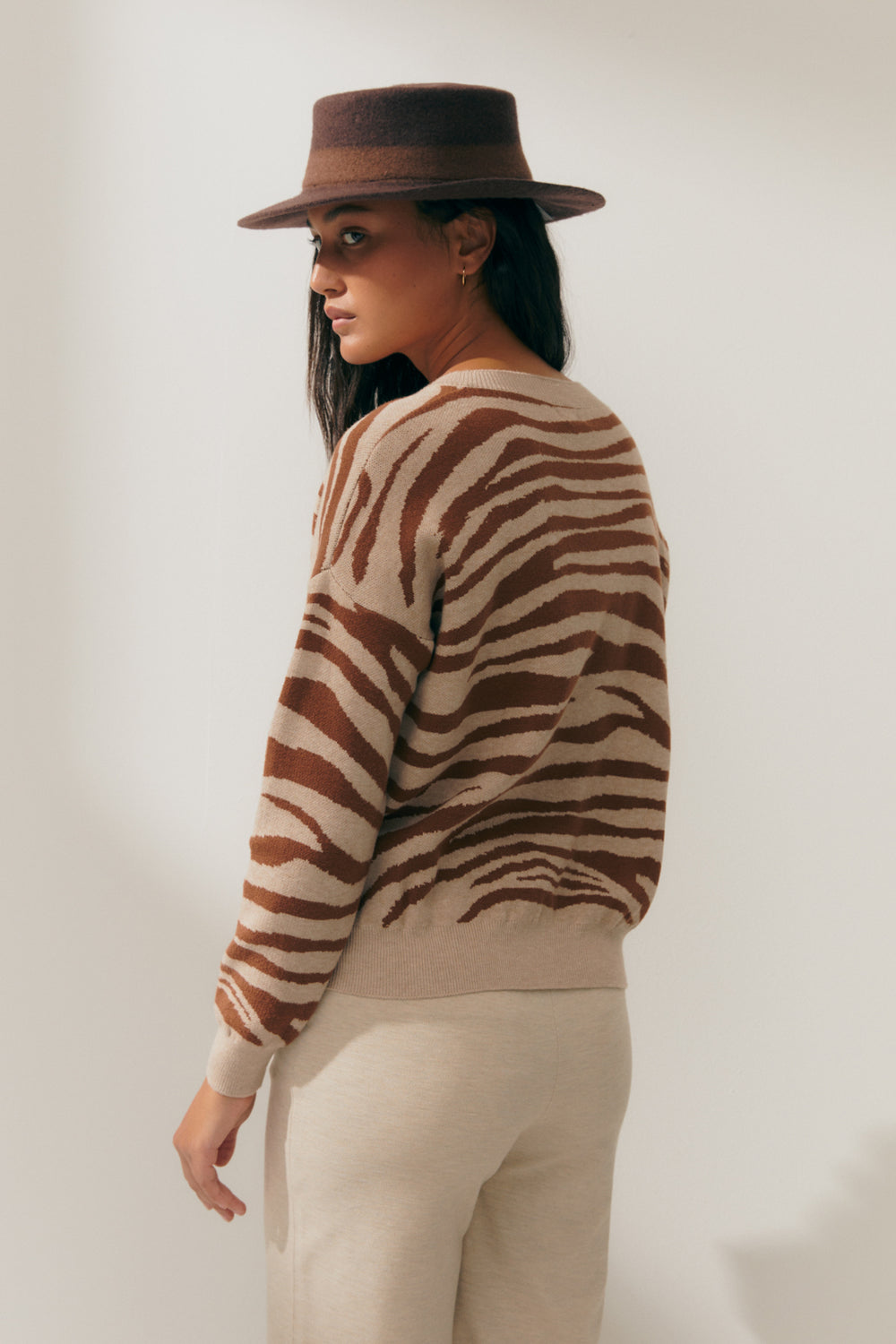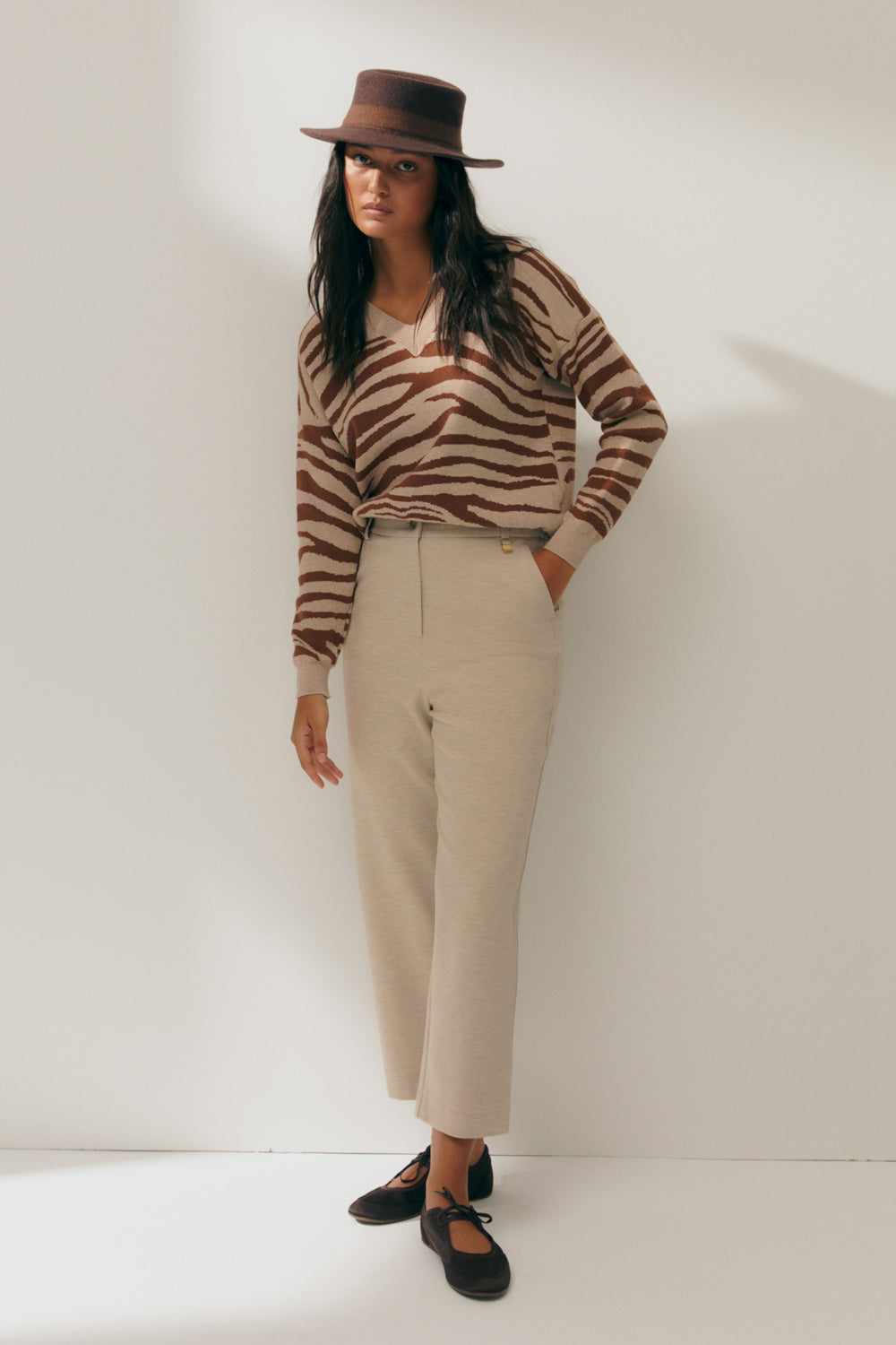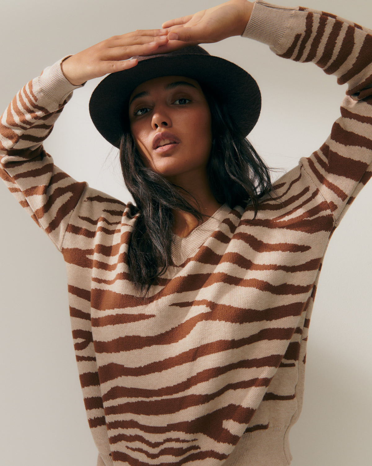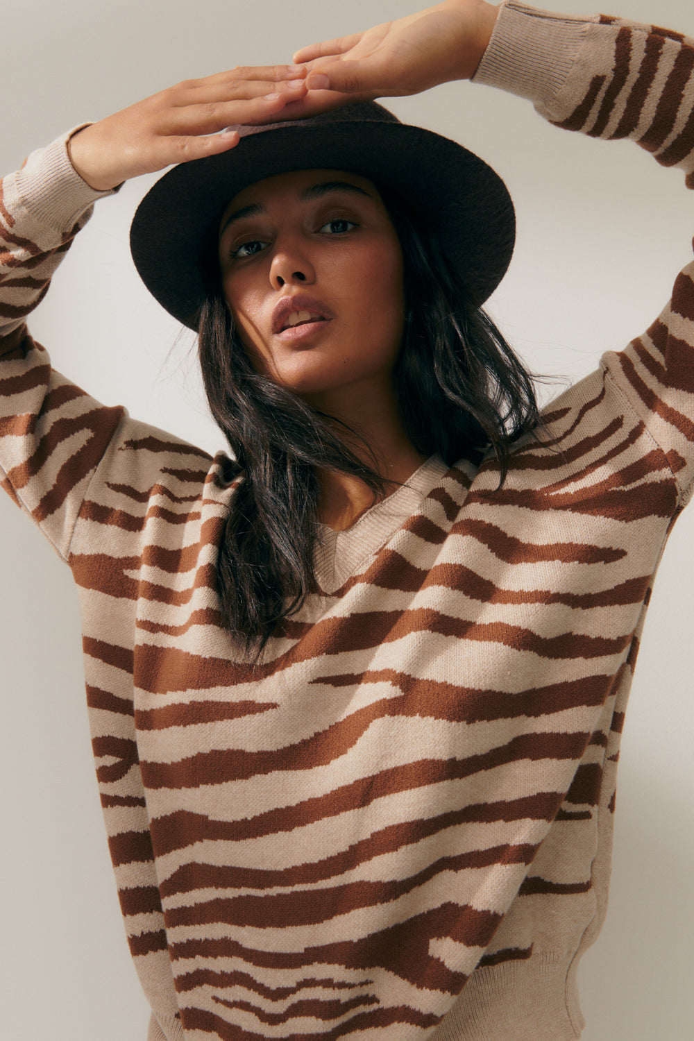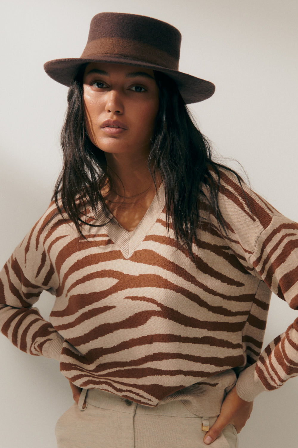 Animal print jacquard sweater with a V-neck and long sleeves. Wide ribbed construction on the neckline, cuffs, and hem. The animal print style is perfect for pairing with basics for a contemporary look. Regular fit.