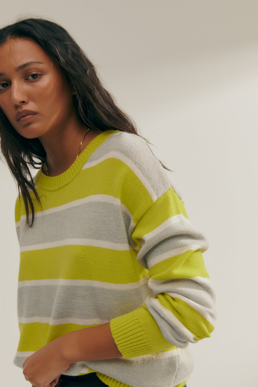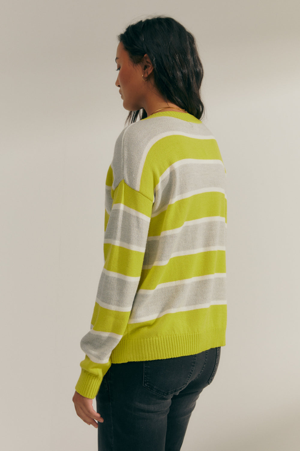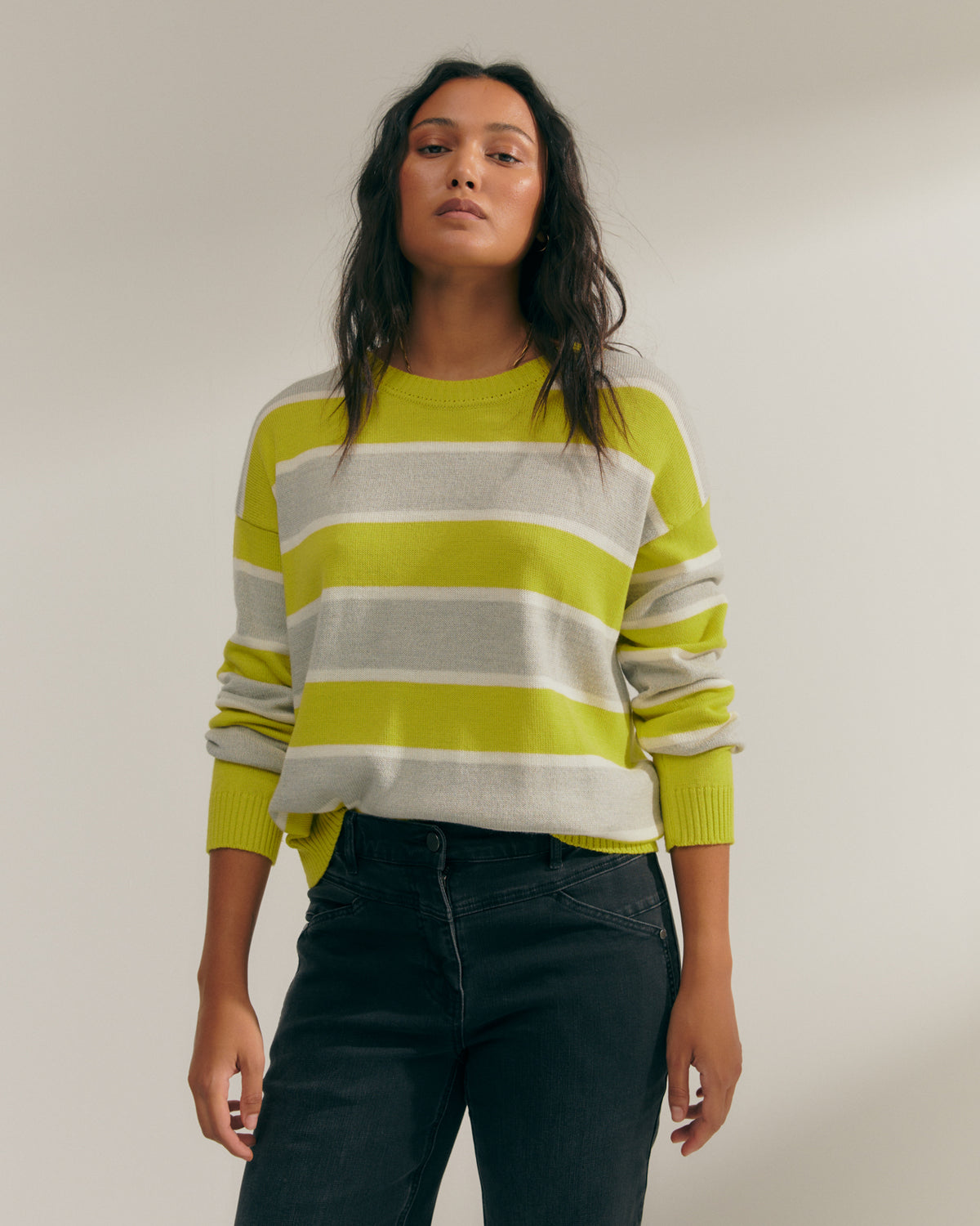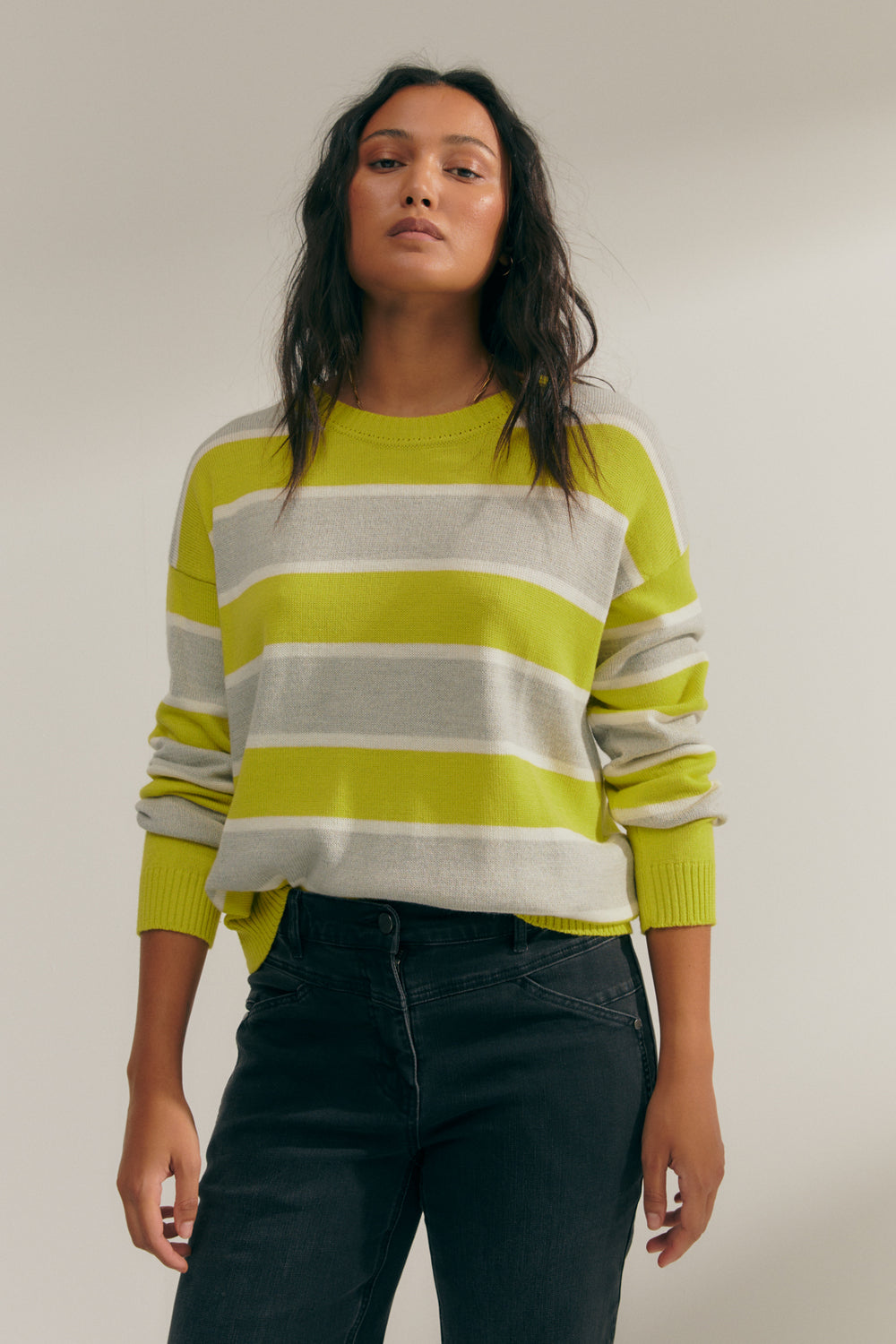 Long-sleeved, round-neck, tricolor striped sweater. Ribbed neckline, cuffs, and hem. A basic and versatile sweater that will help you create all kinds of looks. Regular fit.