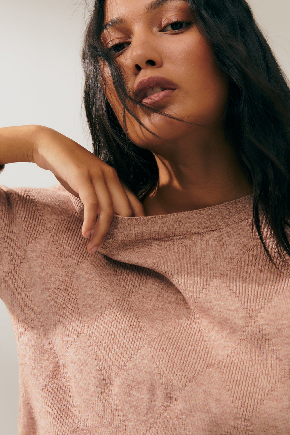 Diamond-pattern knit sweater with a round neck and long sleeves. Ribbed construction on the neckline, cuffs, and hem. Regular fit.