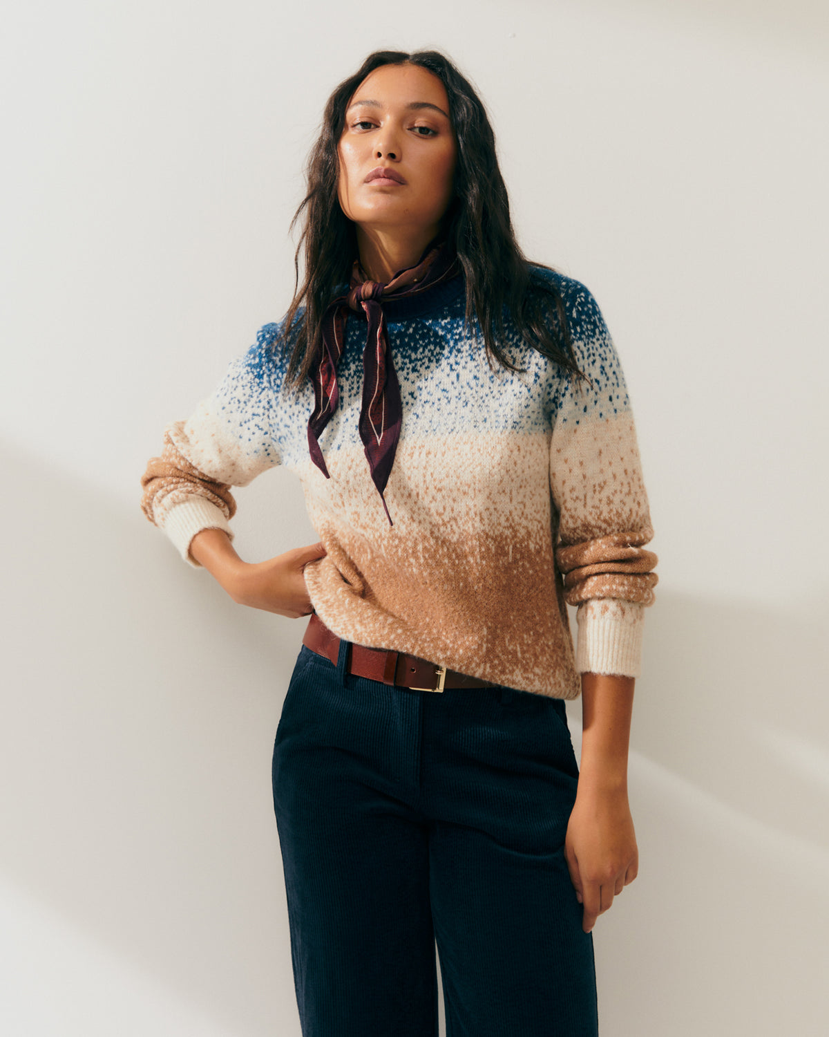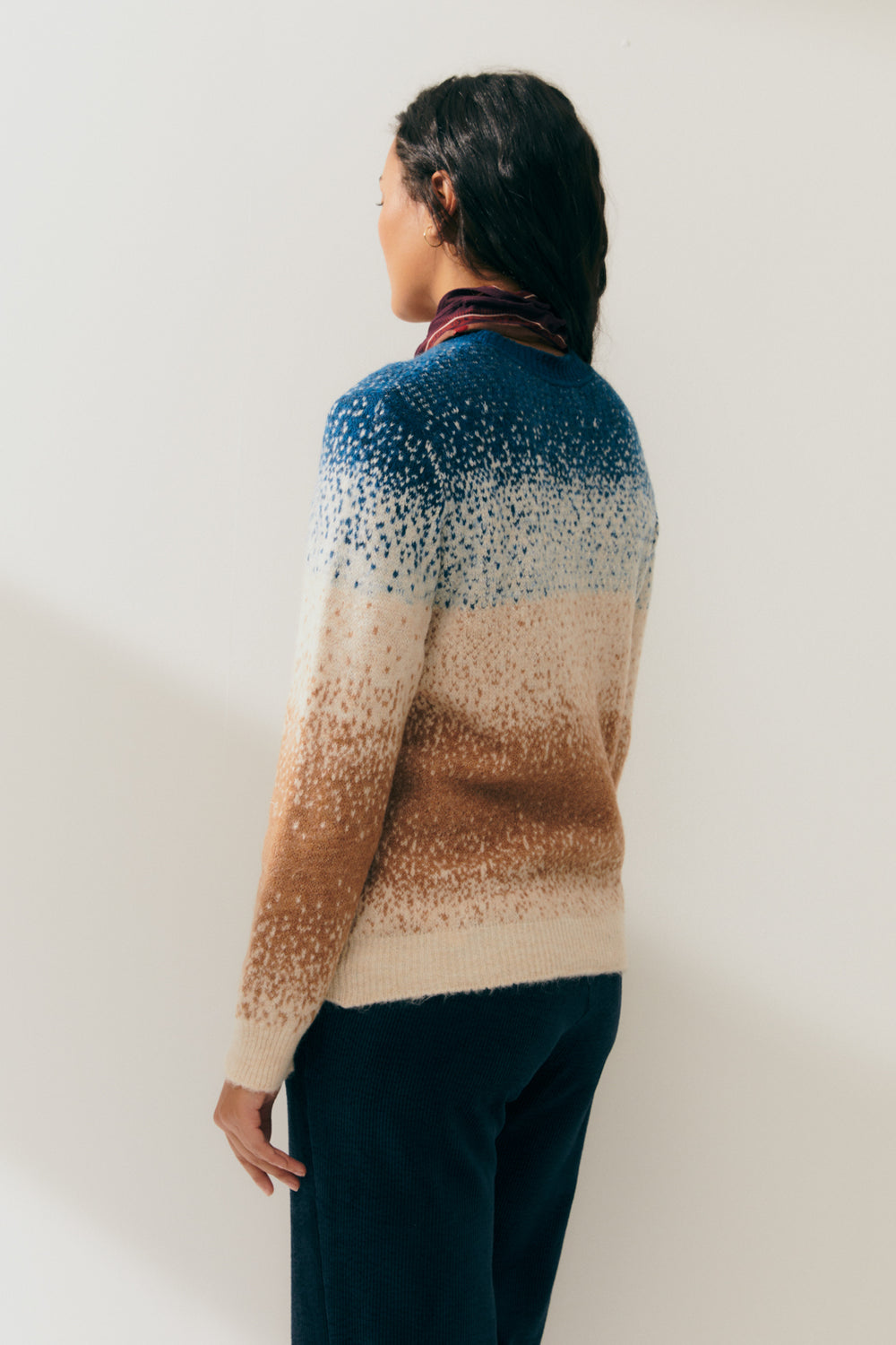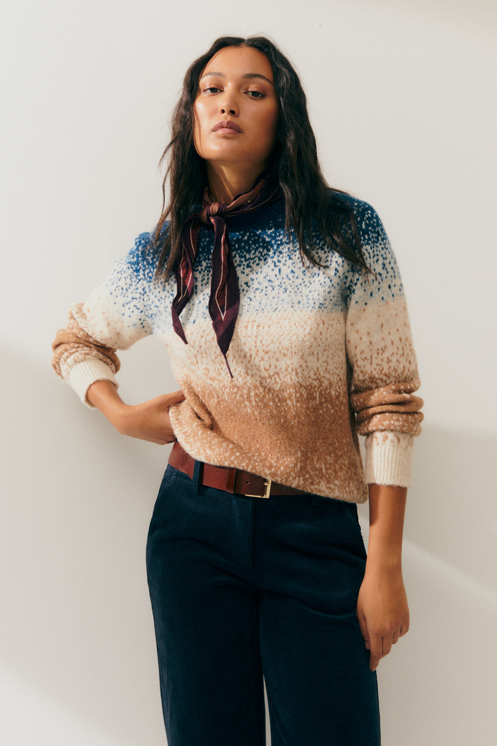 Long-sleeved, round-neck knit sweater. The color combination and blend of yarns play a central role, giving it a warm and special look. Regular fit.
