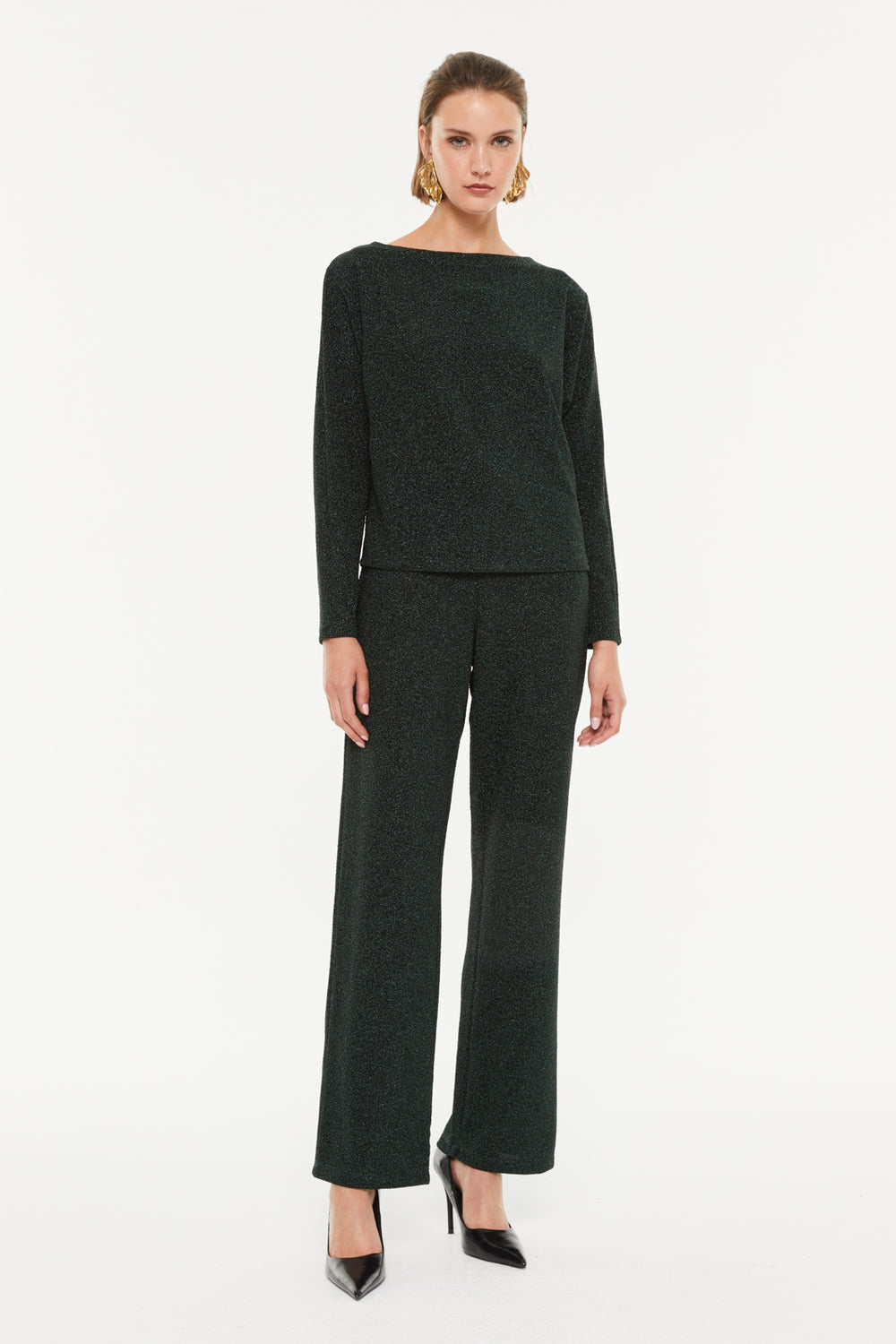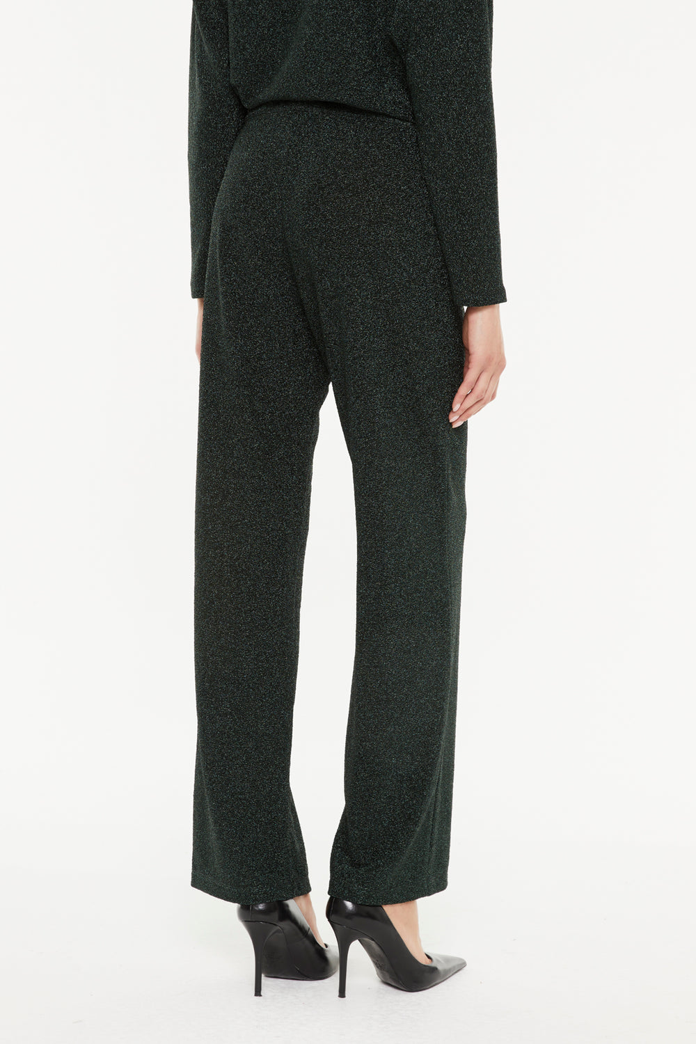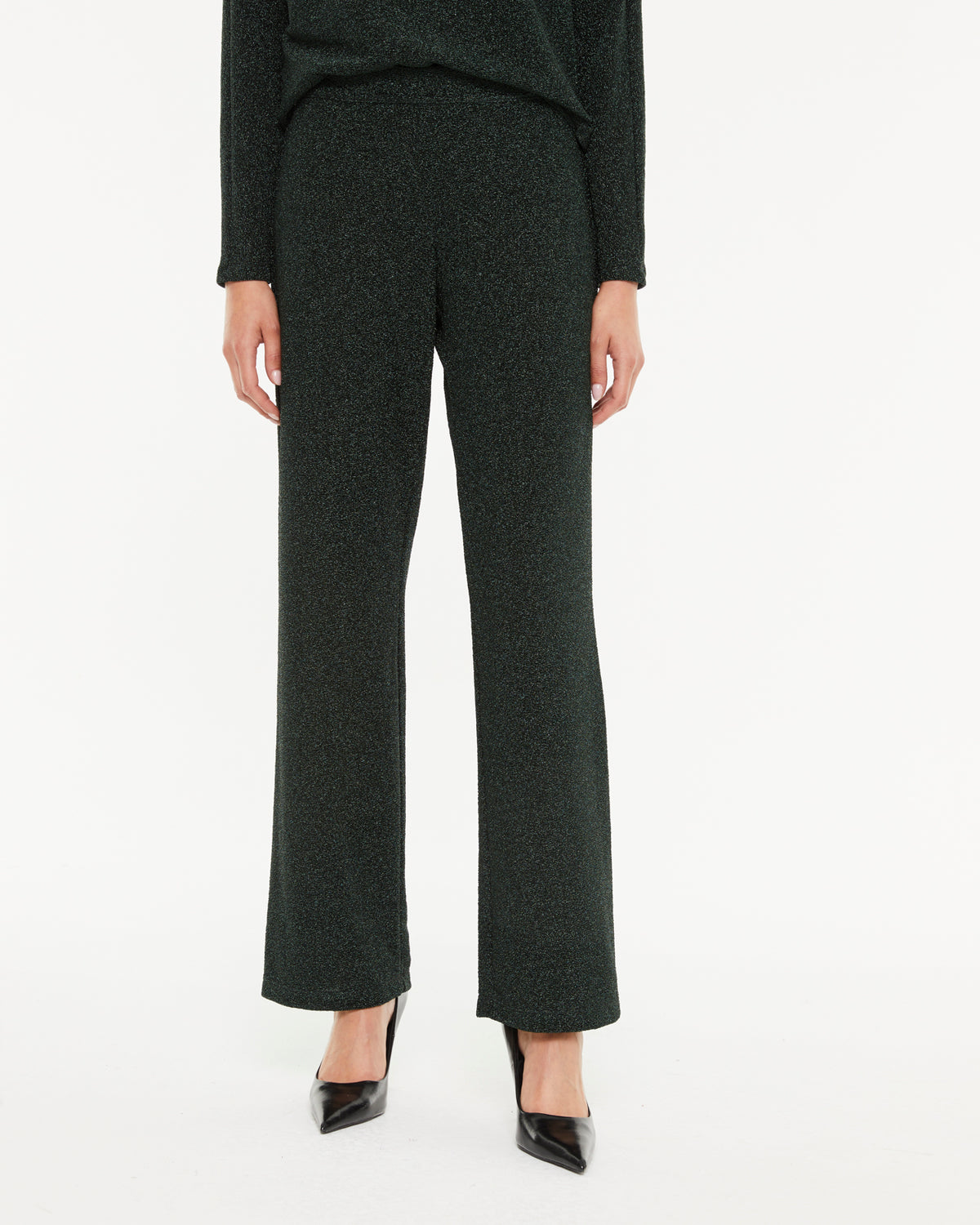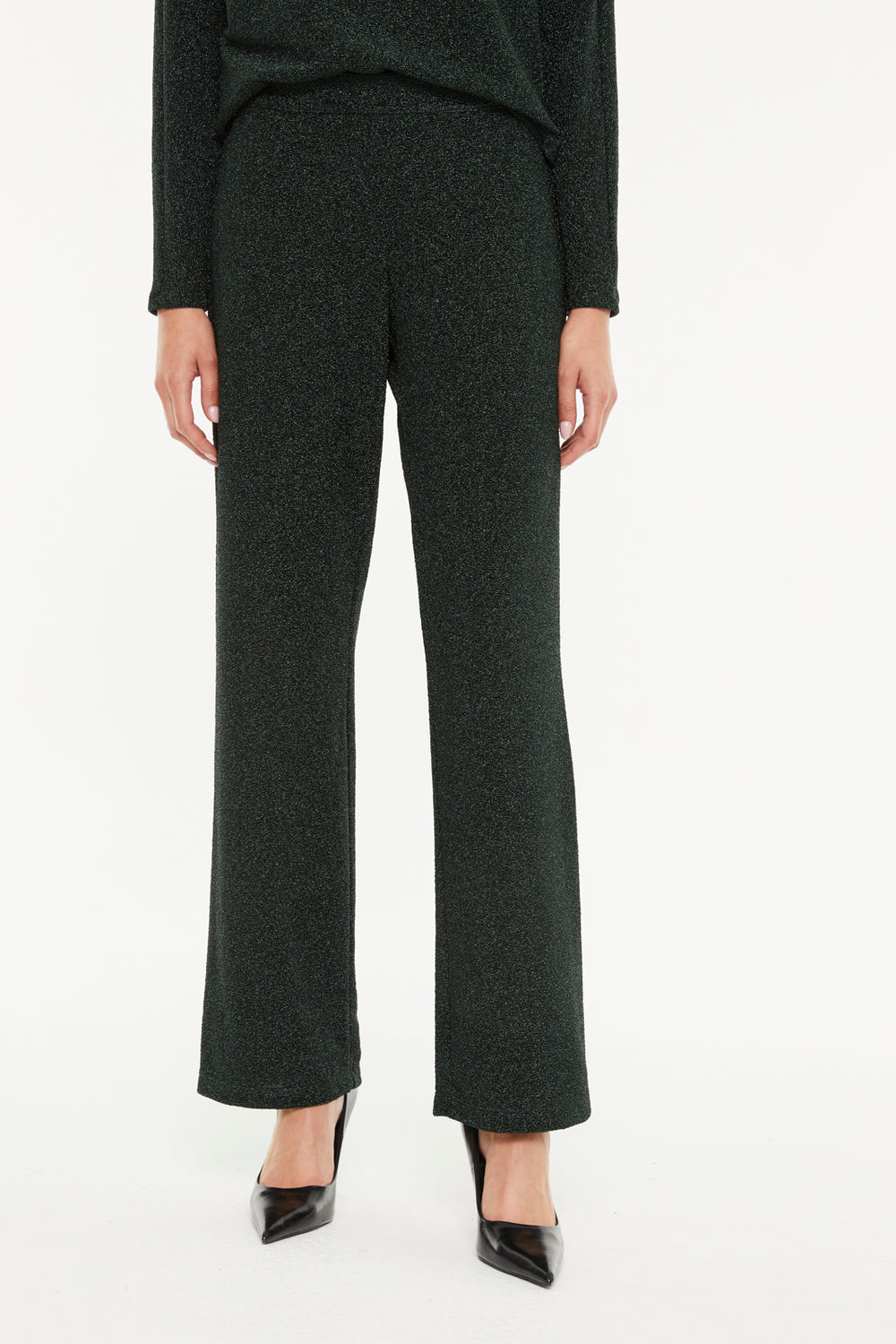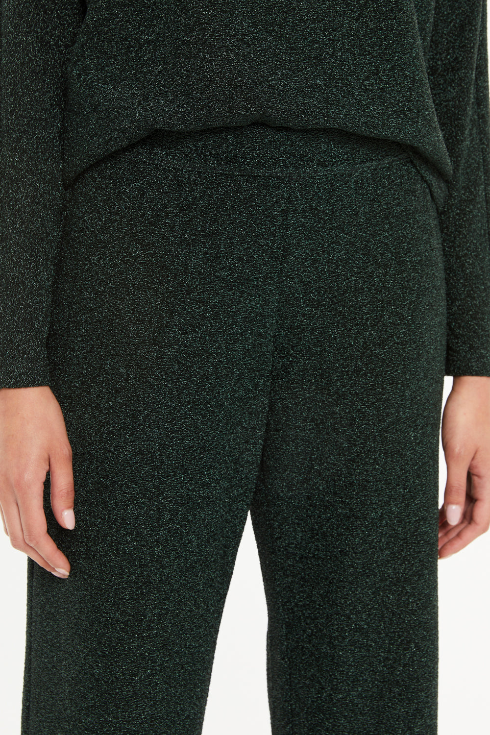 Wide-leg lurex knit pants with an elastic waistband. The fabric features metallic thread, giving the pants a soft, shiny touch. An elegant and comfortable piece to wear to any event.