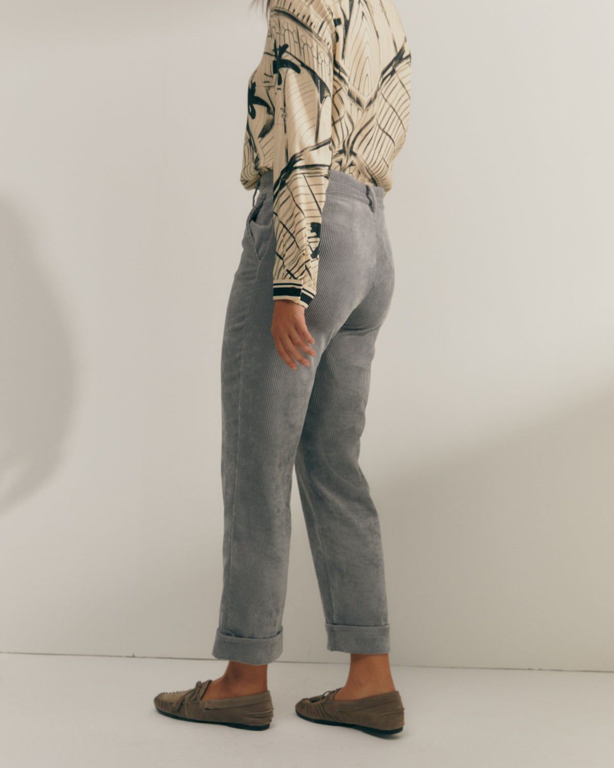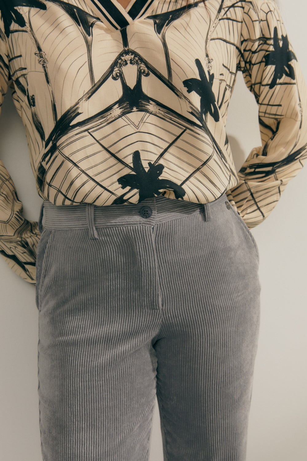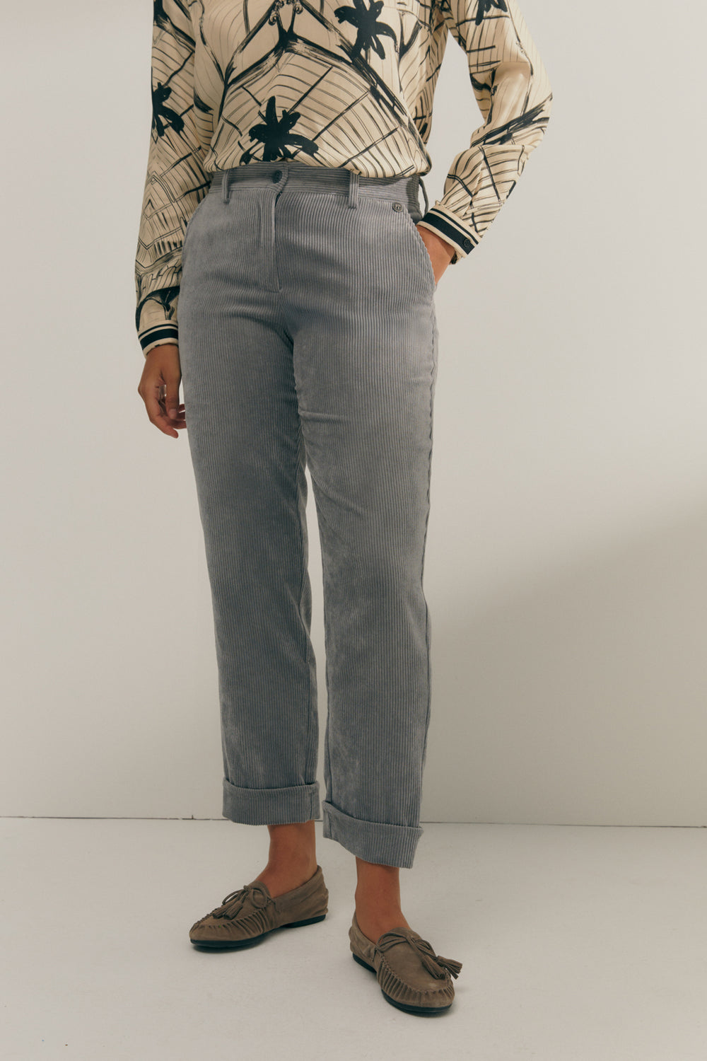 Straight-leg corduroy trousers with turned-up hems. Front side pockets. Zip and button closure. Elastic waistband at the back for added comfort.