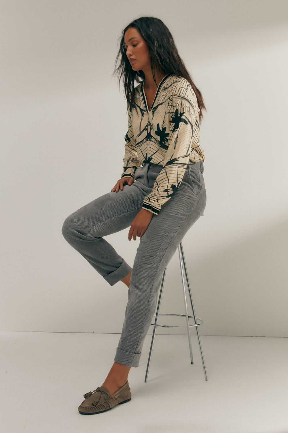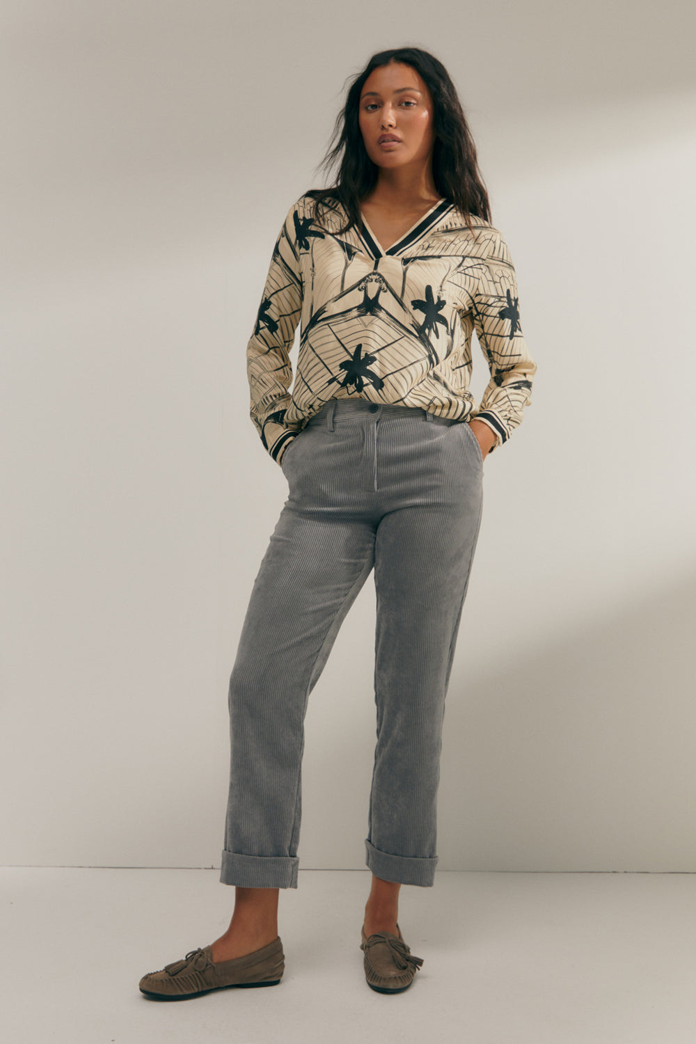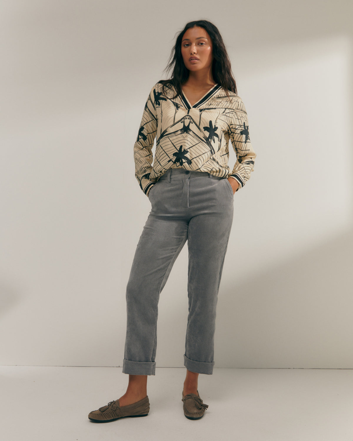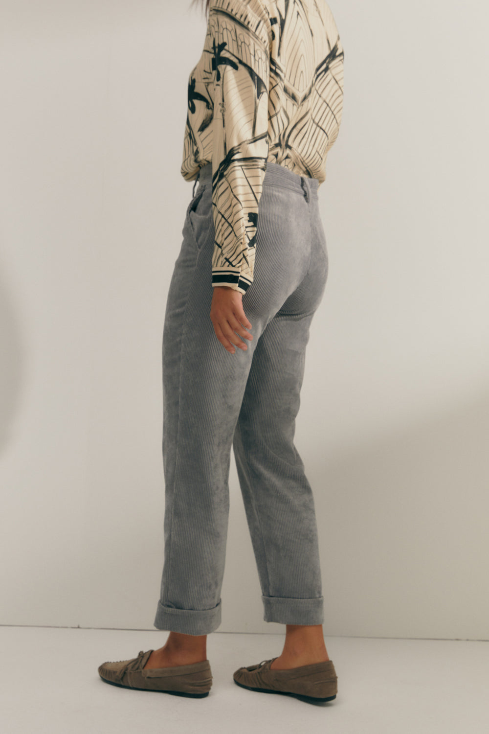 Straight-leg corduroy trousers with turned-up hems. Front side pockets. Zip and button closure. Elastic waistband at the back for added comfort.
