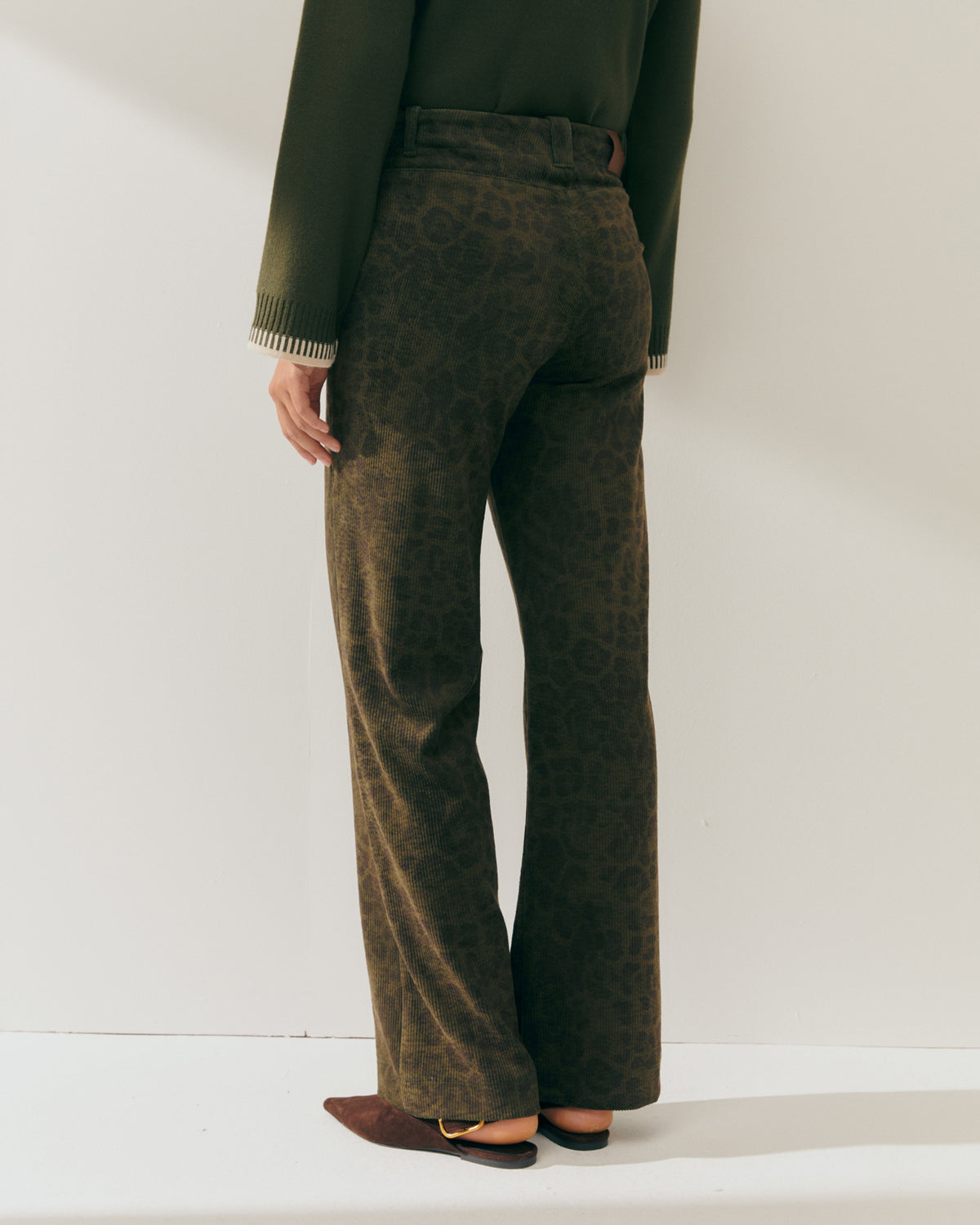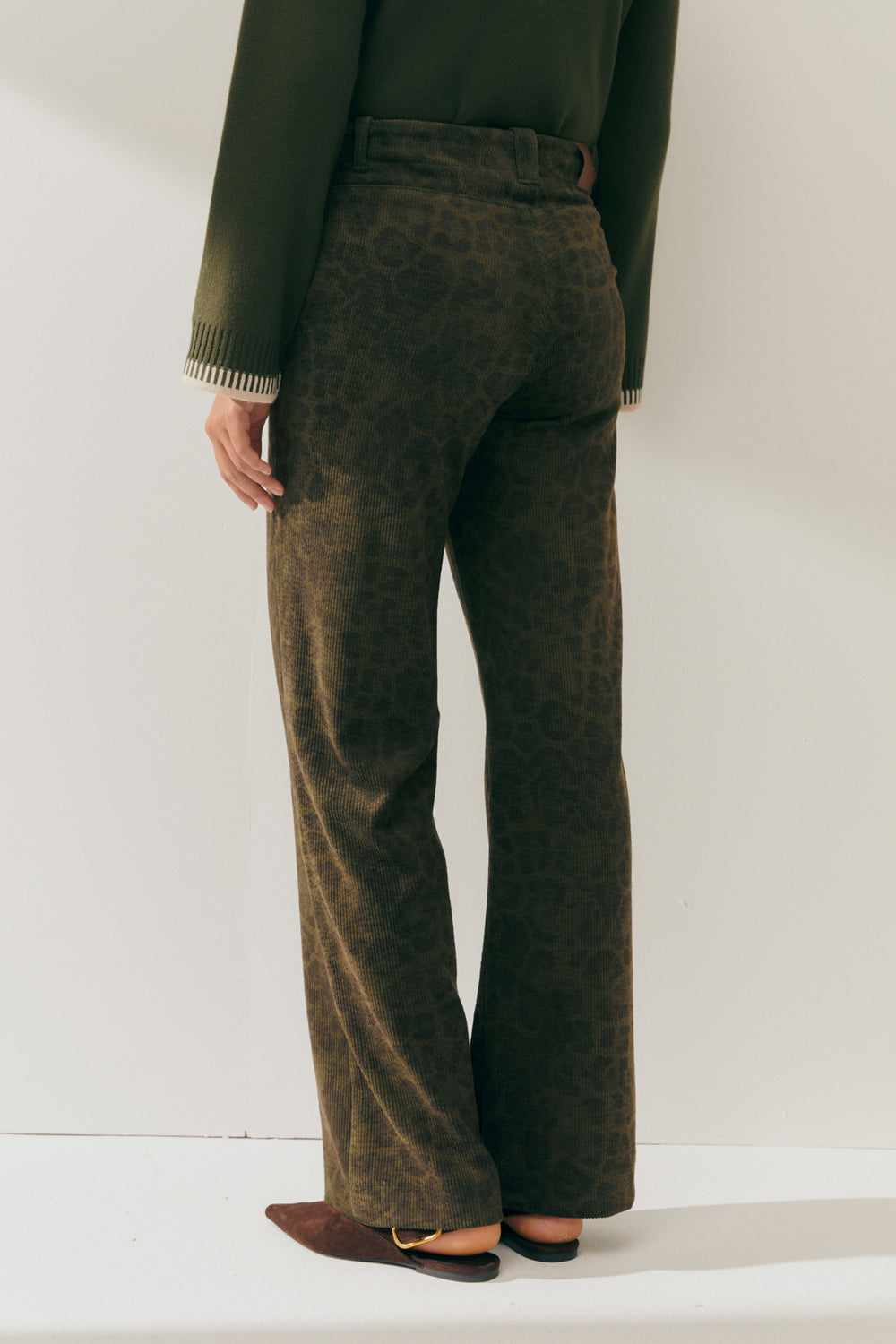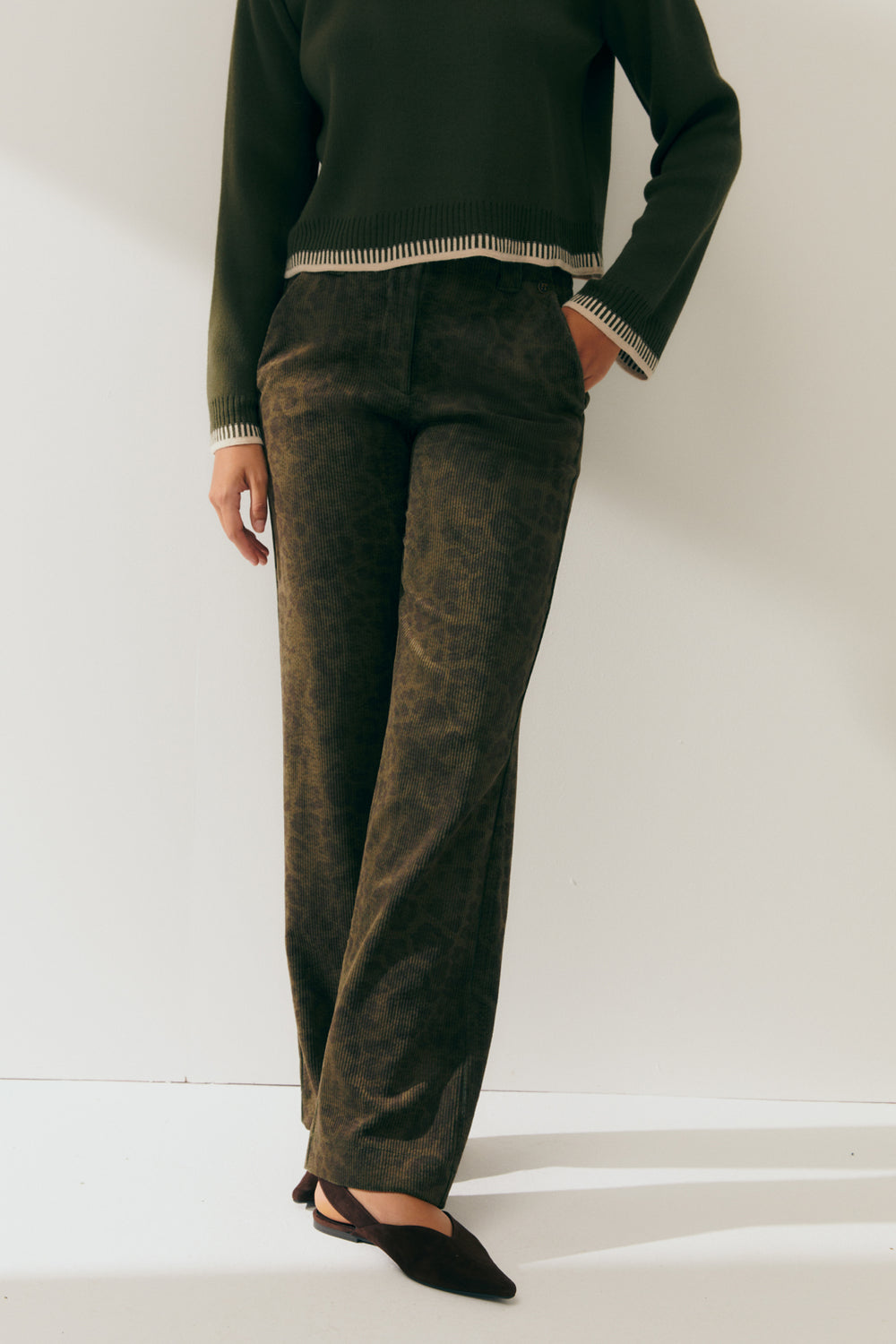 Straight-leg corduroy pants with an animal print, side pockets, and a back yoke. Zip and button closure. Animal prints are back in fashion this season.