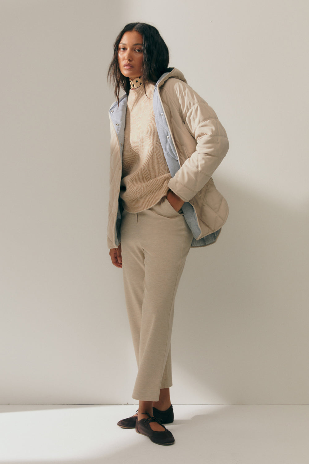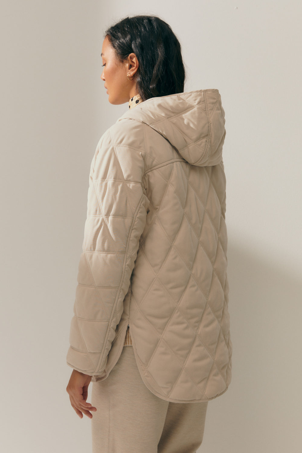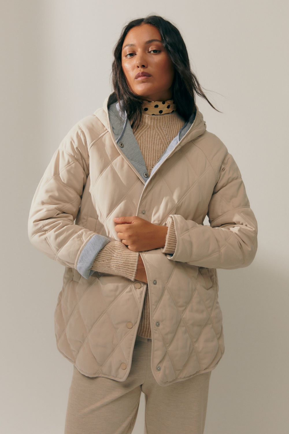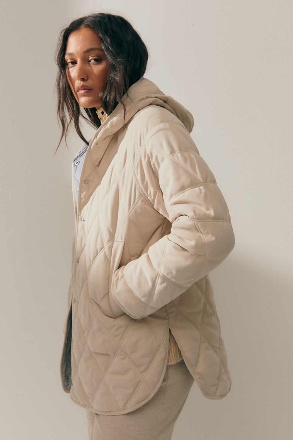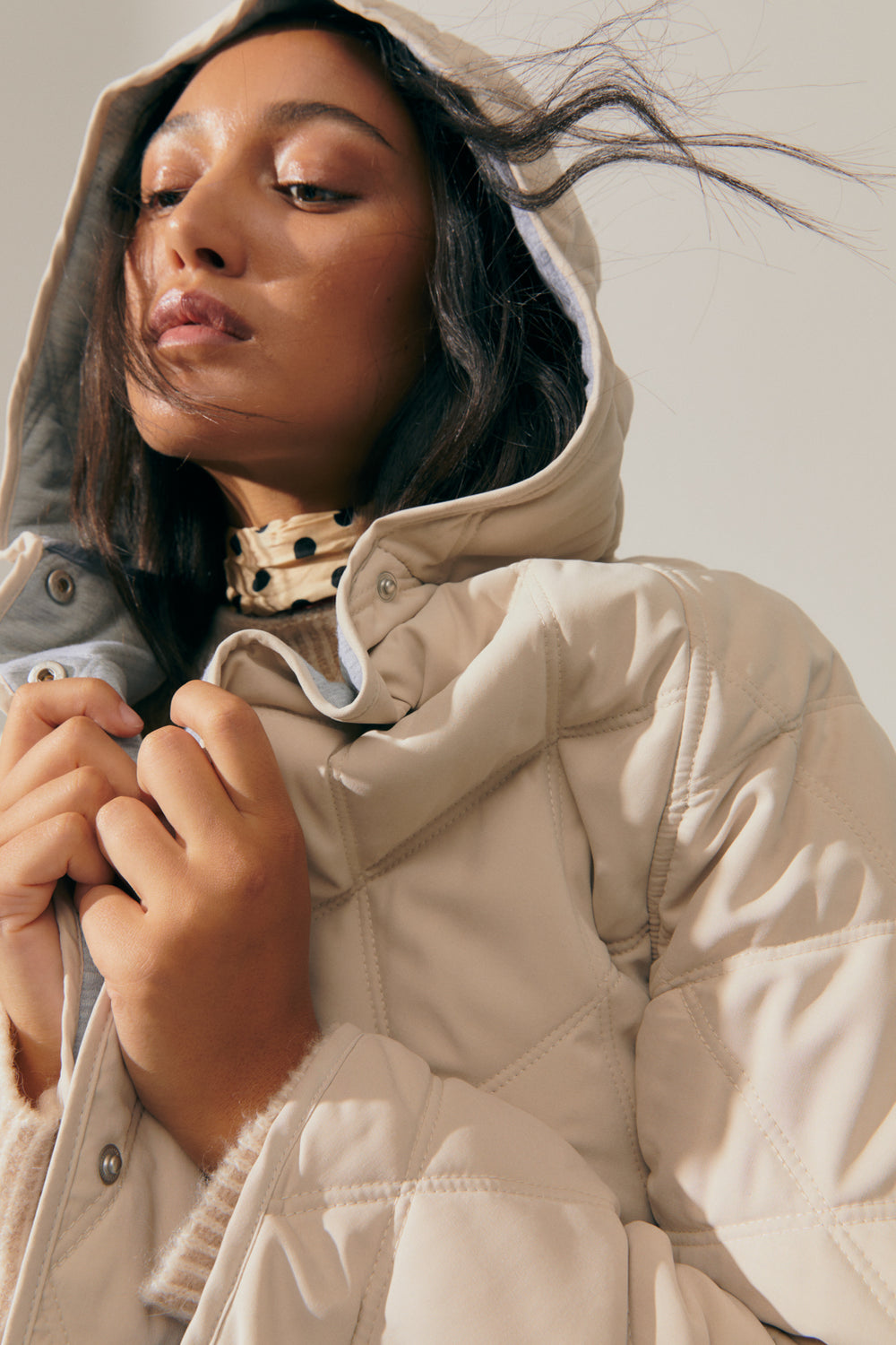 Sandwich-style quilted parka with welt pockets, hood, and rounded hems. Contrasting fleece interior. Front snap closure. Regular fit.