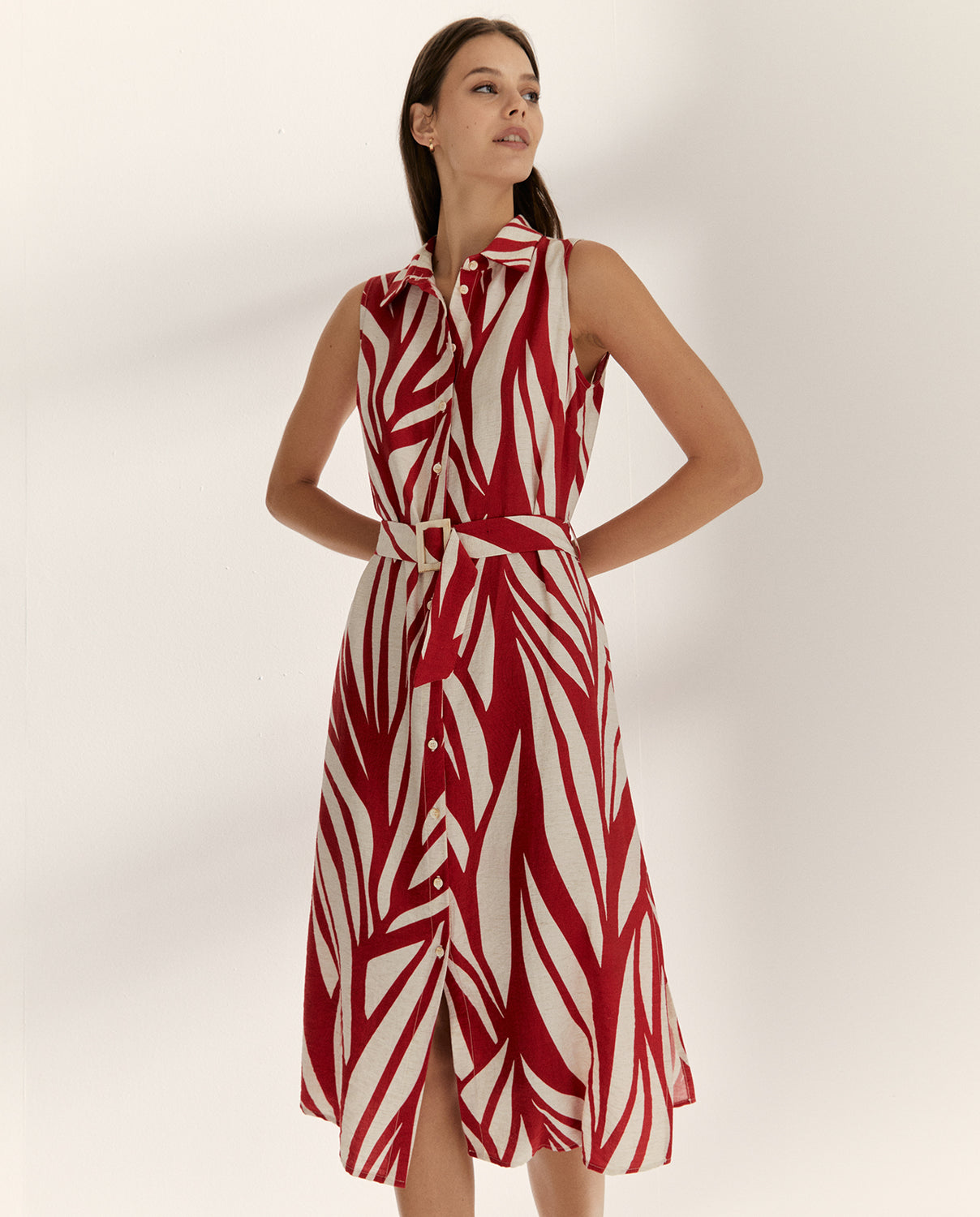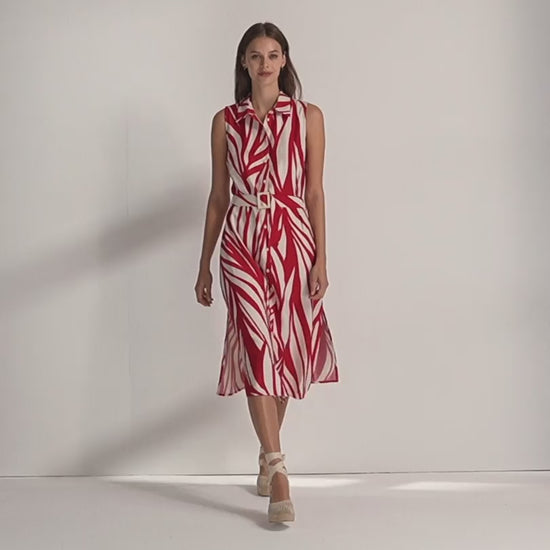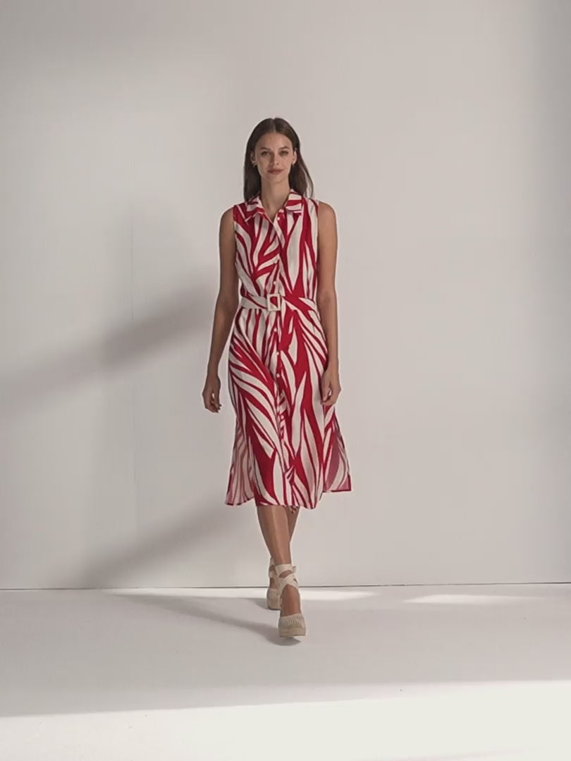 Vestido midi camisero estampado sin mangas y cuello camisero. Cierre frontal con botones y abertura laterales. Incluye cinturón con hebilla del mismo tejido. Es un vestido muy favorecedor, ideal para cualquier ocasión. Regular fit.
