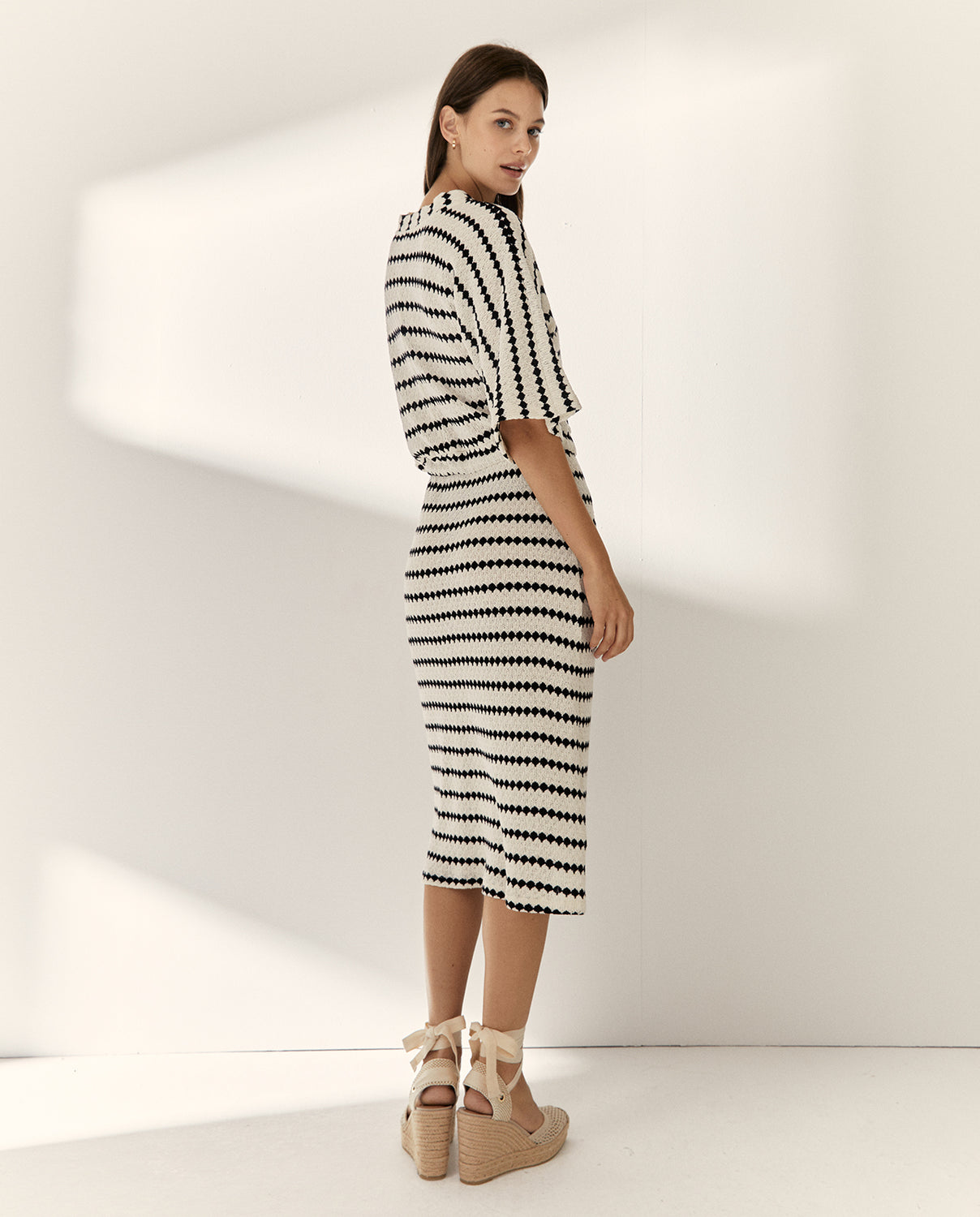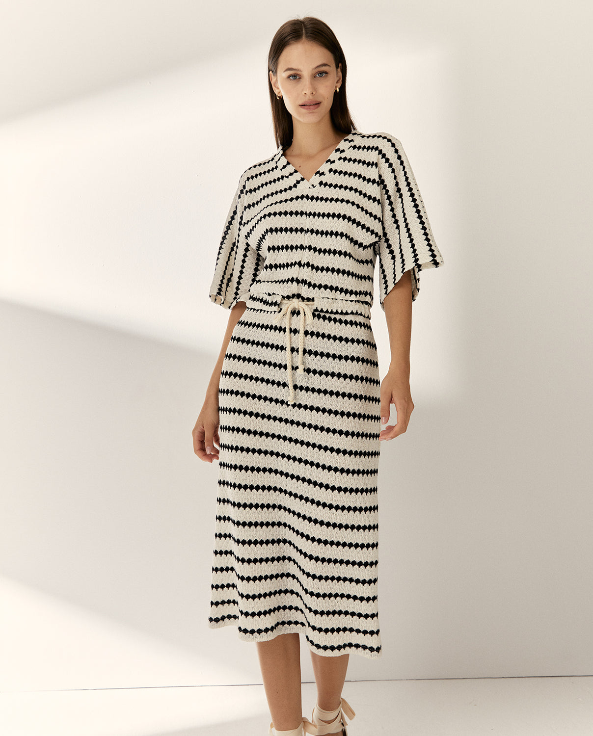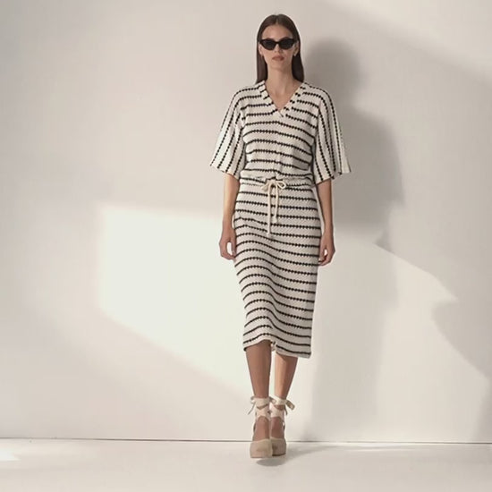 Vestido midi en punto jaquard de cuello pico y manga corta hasta codo. Cintura con cordón ajustable que crea un efecto cinturón realzando tu silueta. Su diseño combina comodidad y estilo. Regular fit.