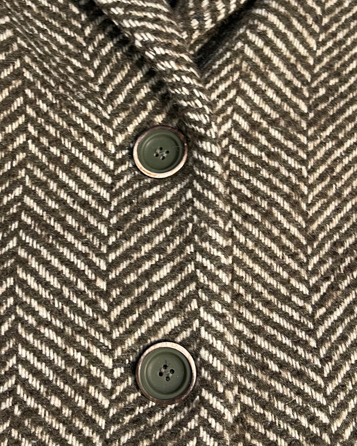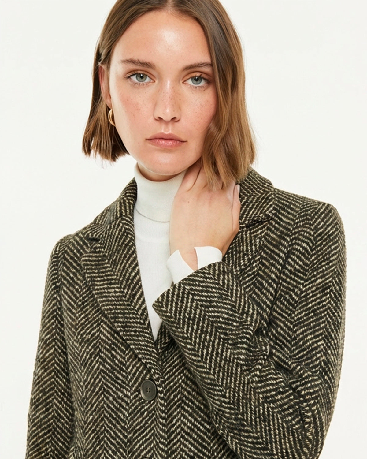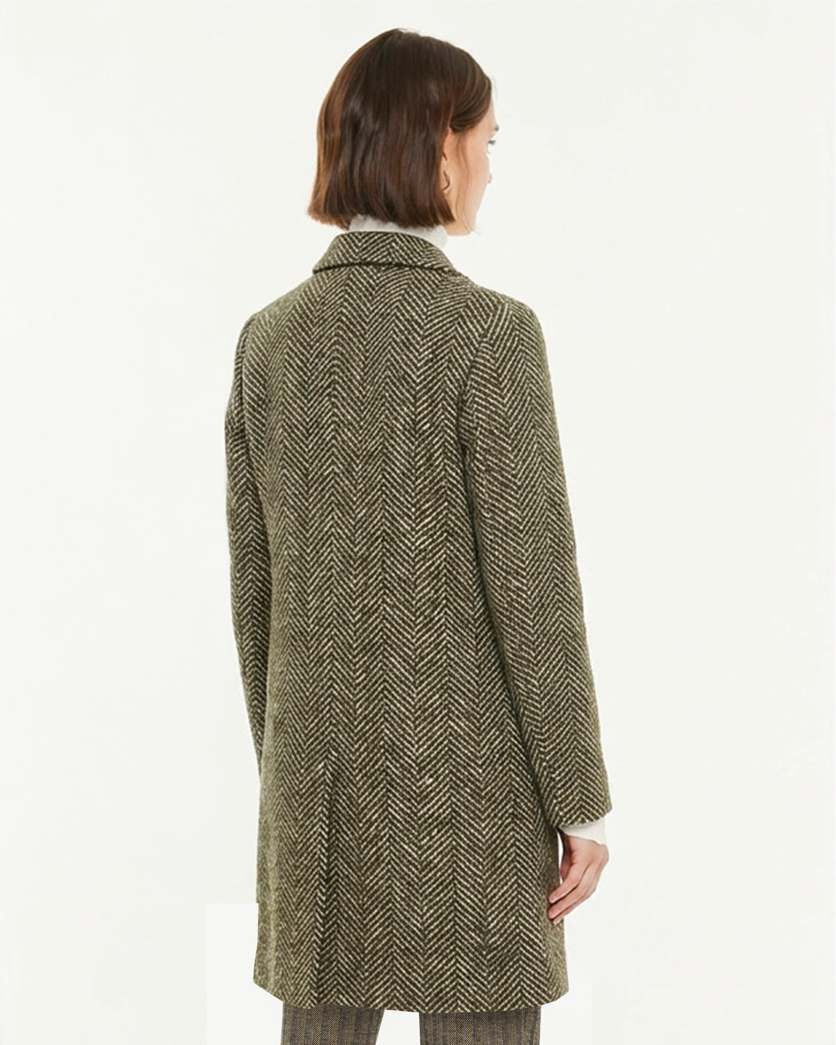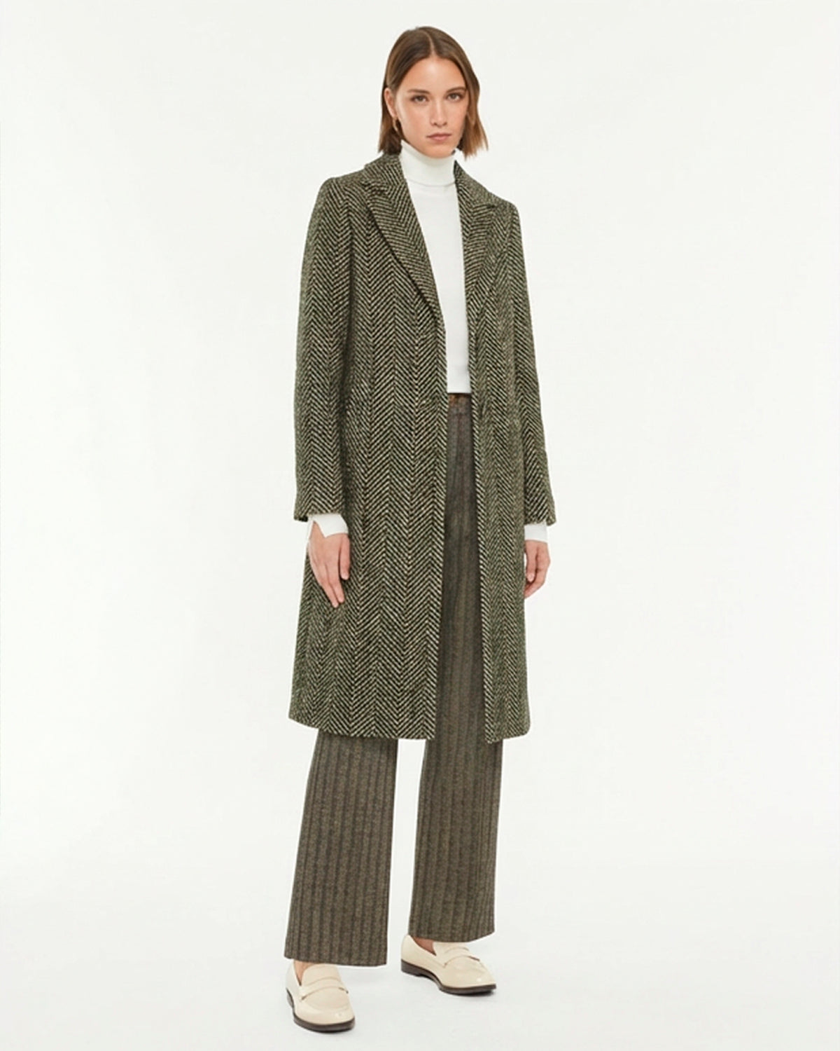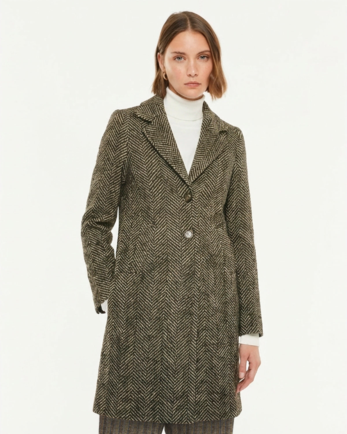 Abrigo estampado de espiga con cuello solapa, manga larga y bolsillos con tapeta. Cierre frontal con botones. Corte recto.