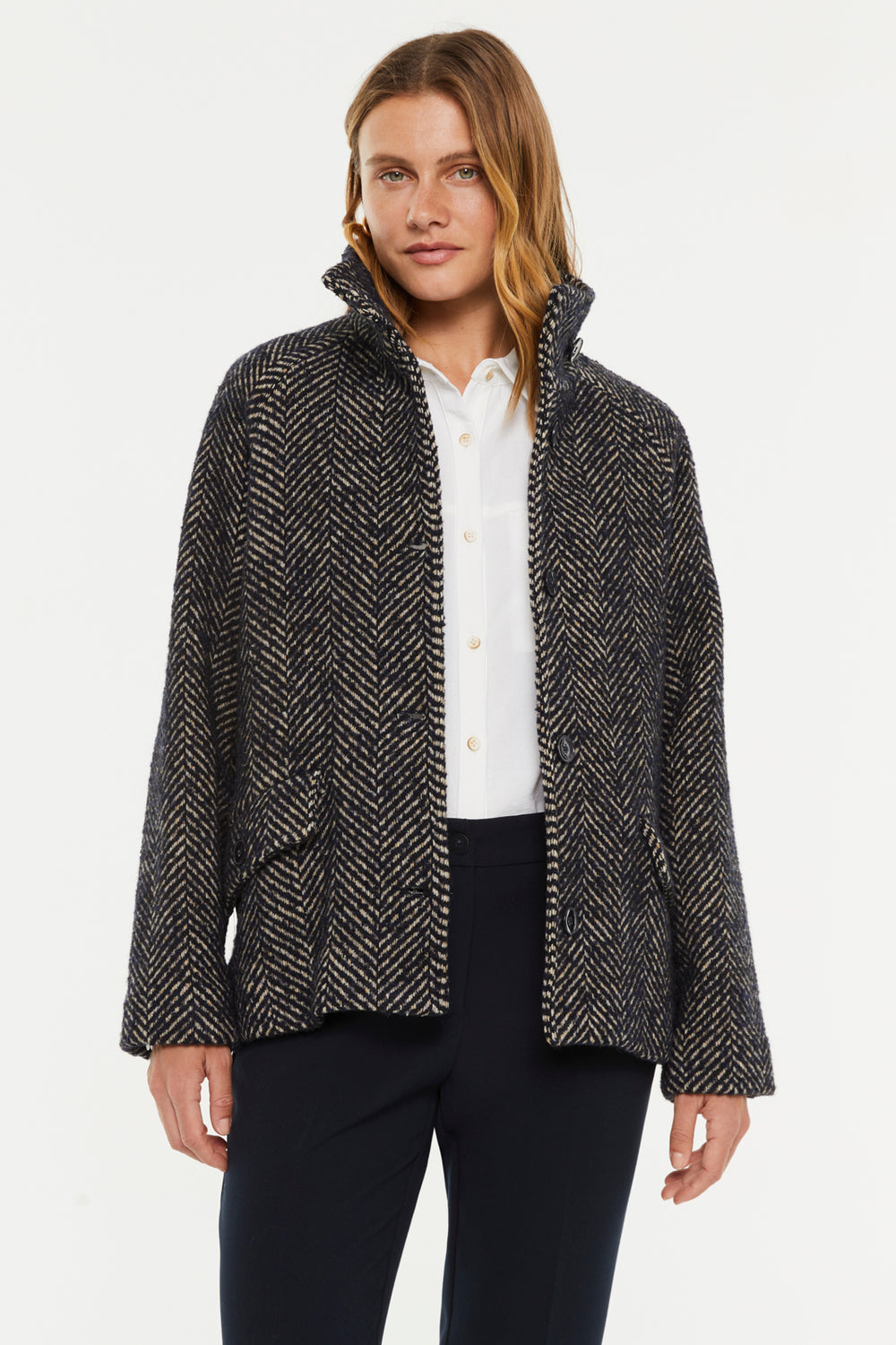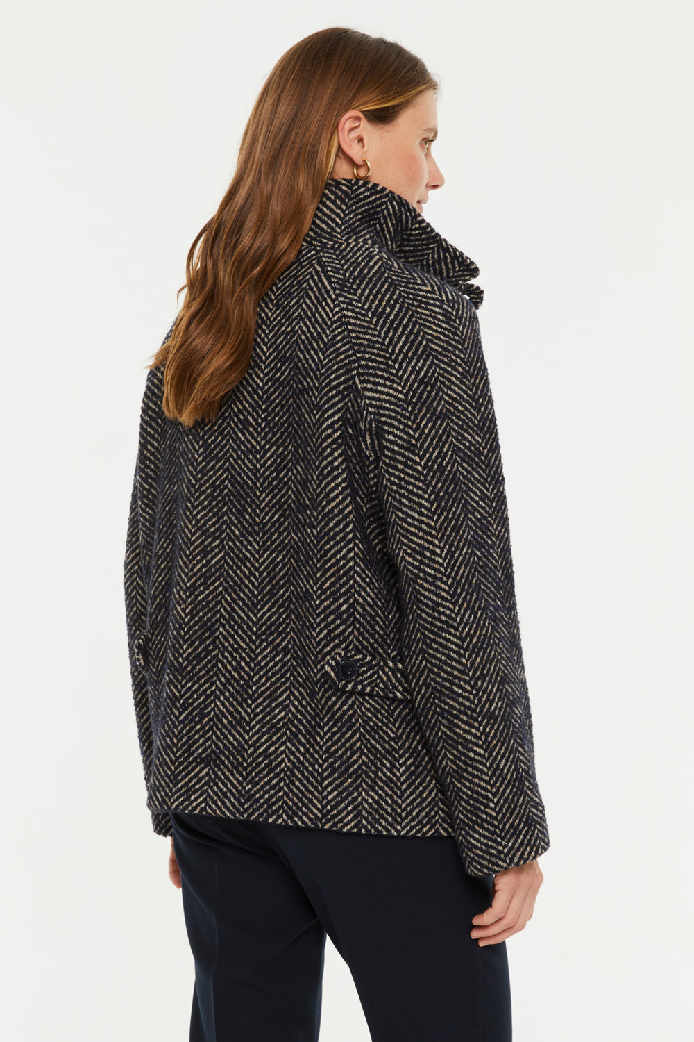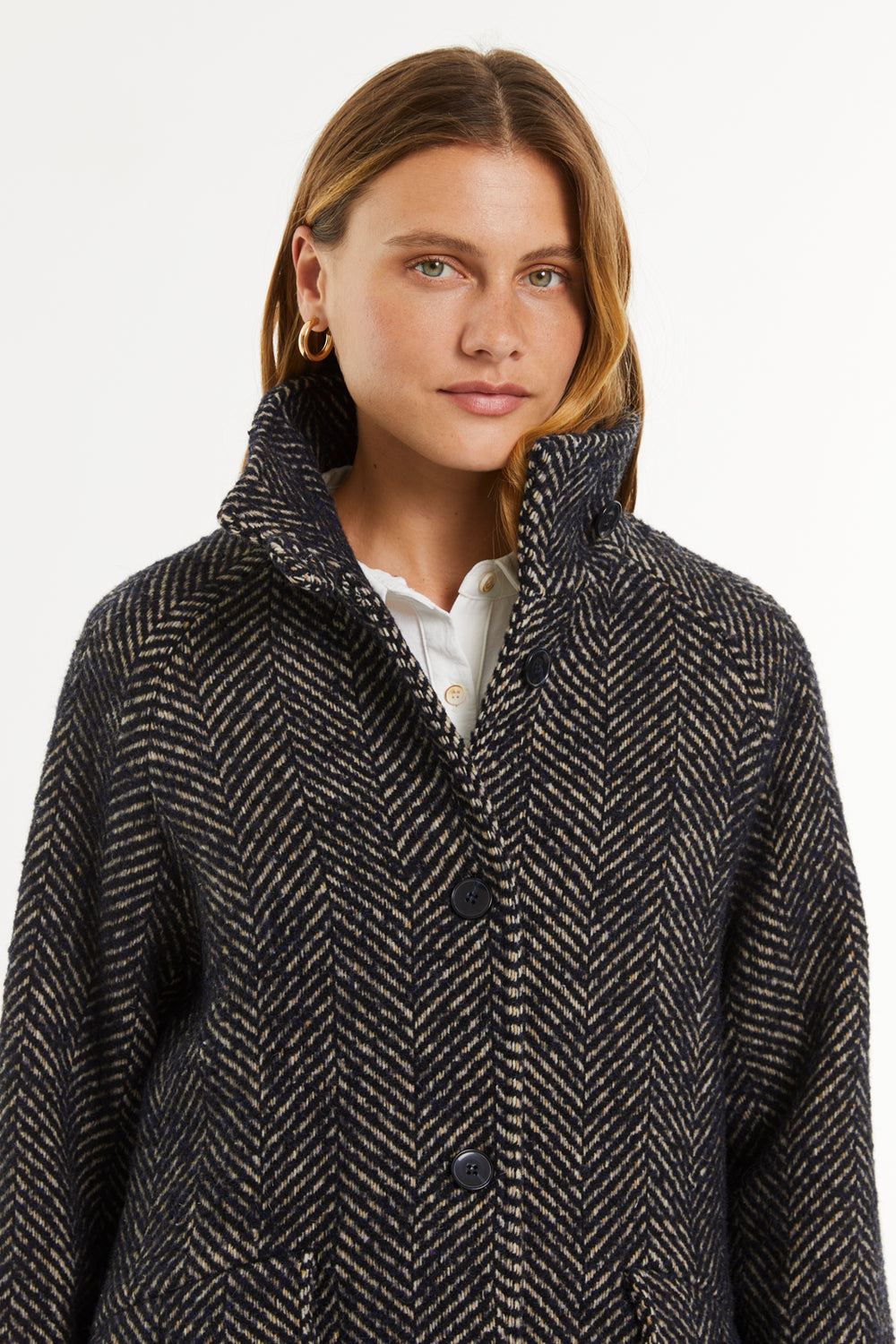 Abrigo estampado espiga cuello alto, manga ranglan y bolsillos con tapeta y botón. Cierre frontal con botones. Regular fit.