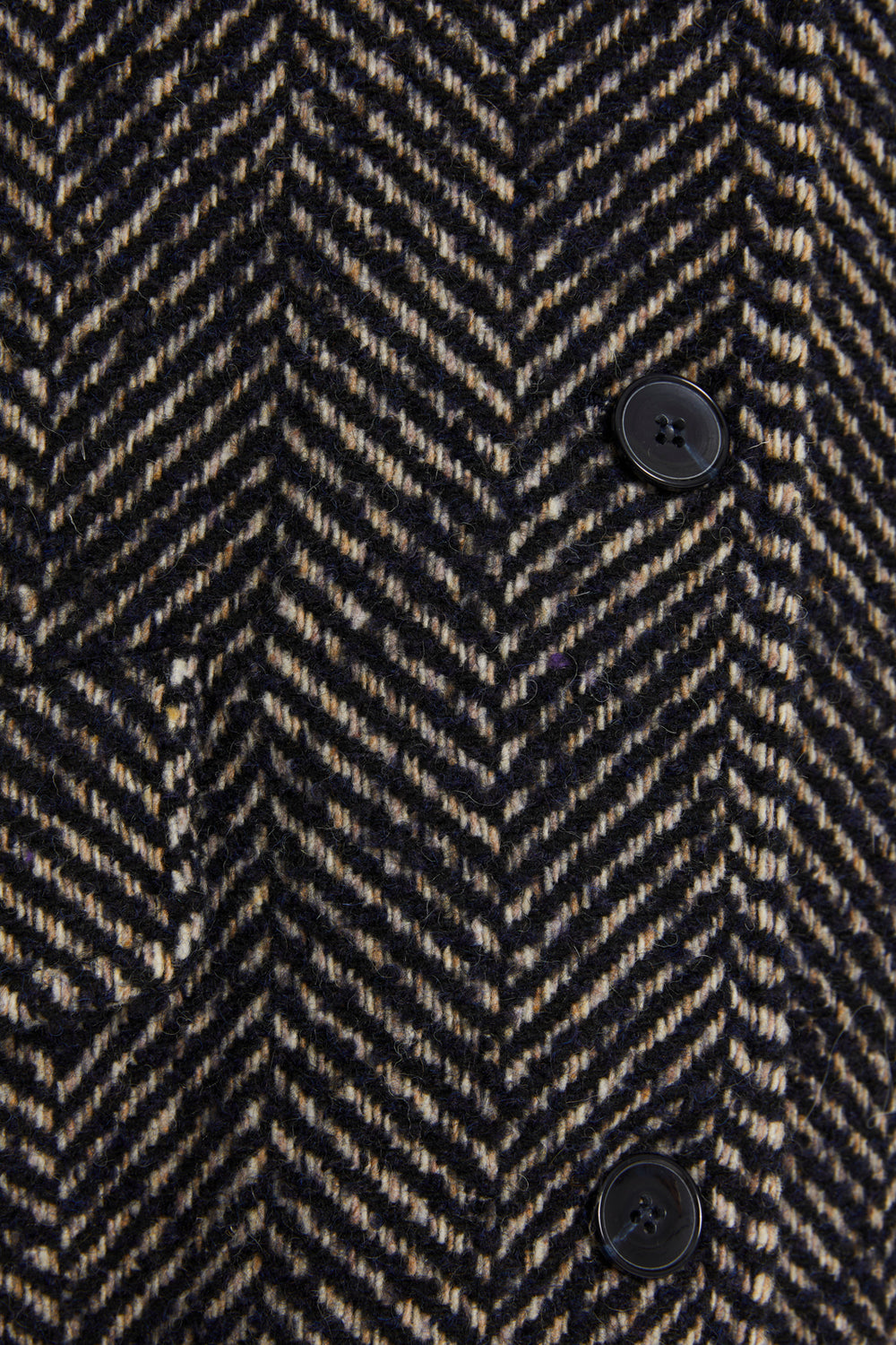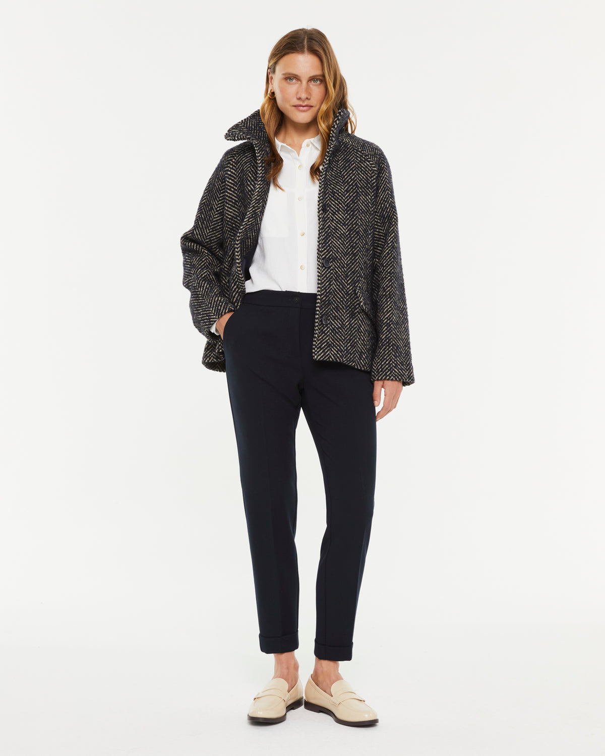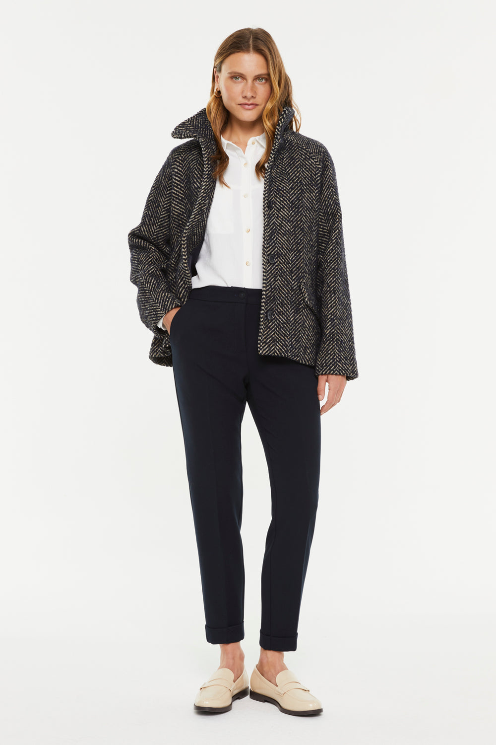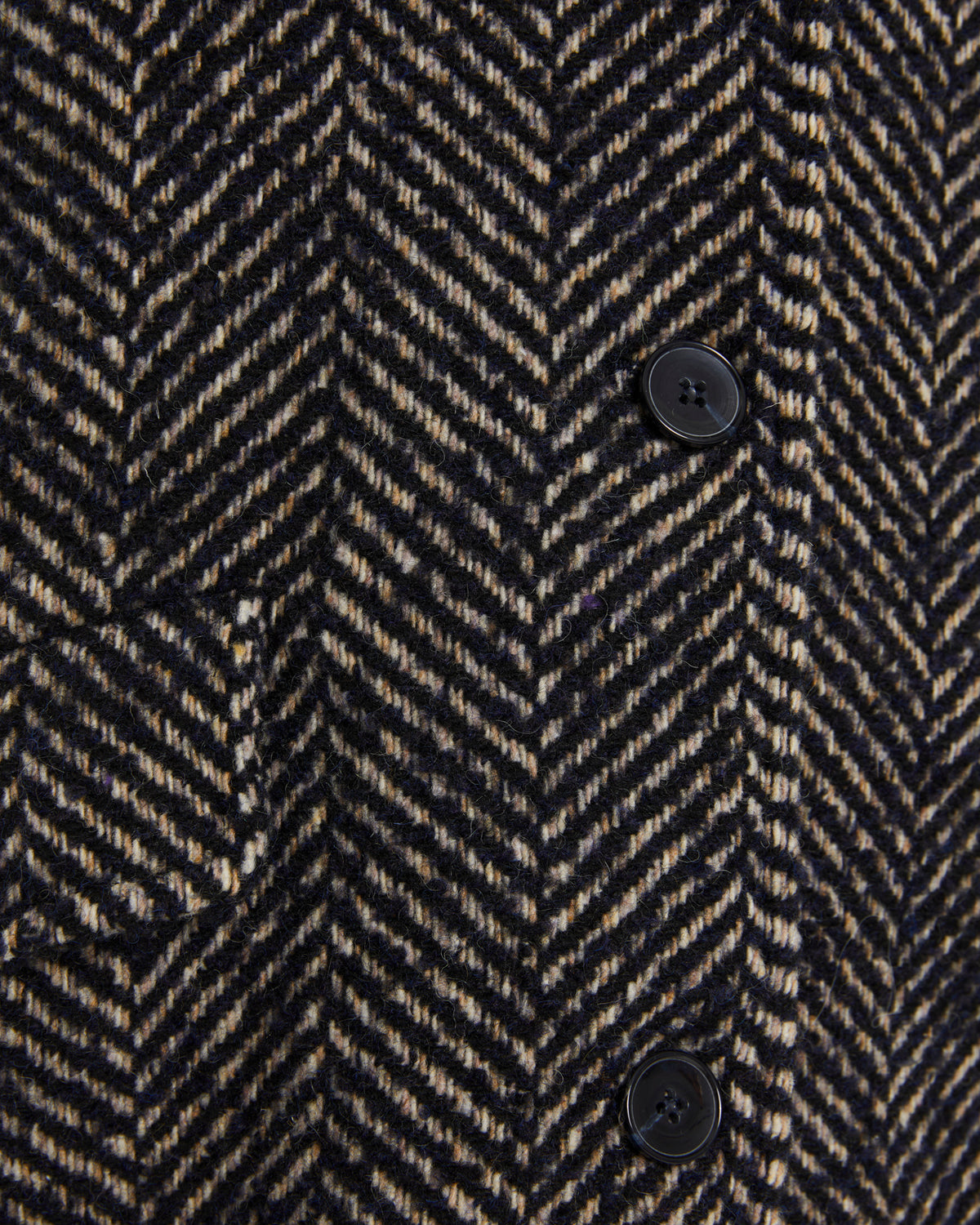 Abrigo estampado espiga cuello alto, manga ranglan y bolsillos con tapeta y botón. Cierre frontal con botones. Regular fit.