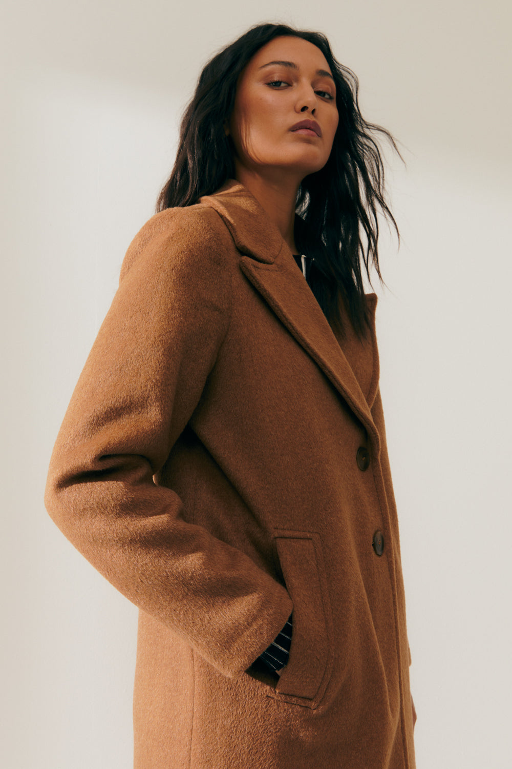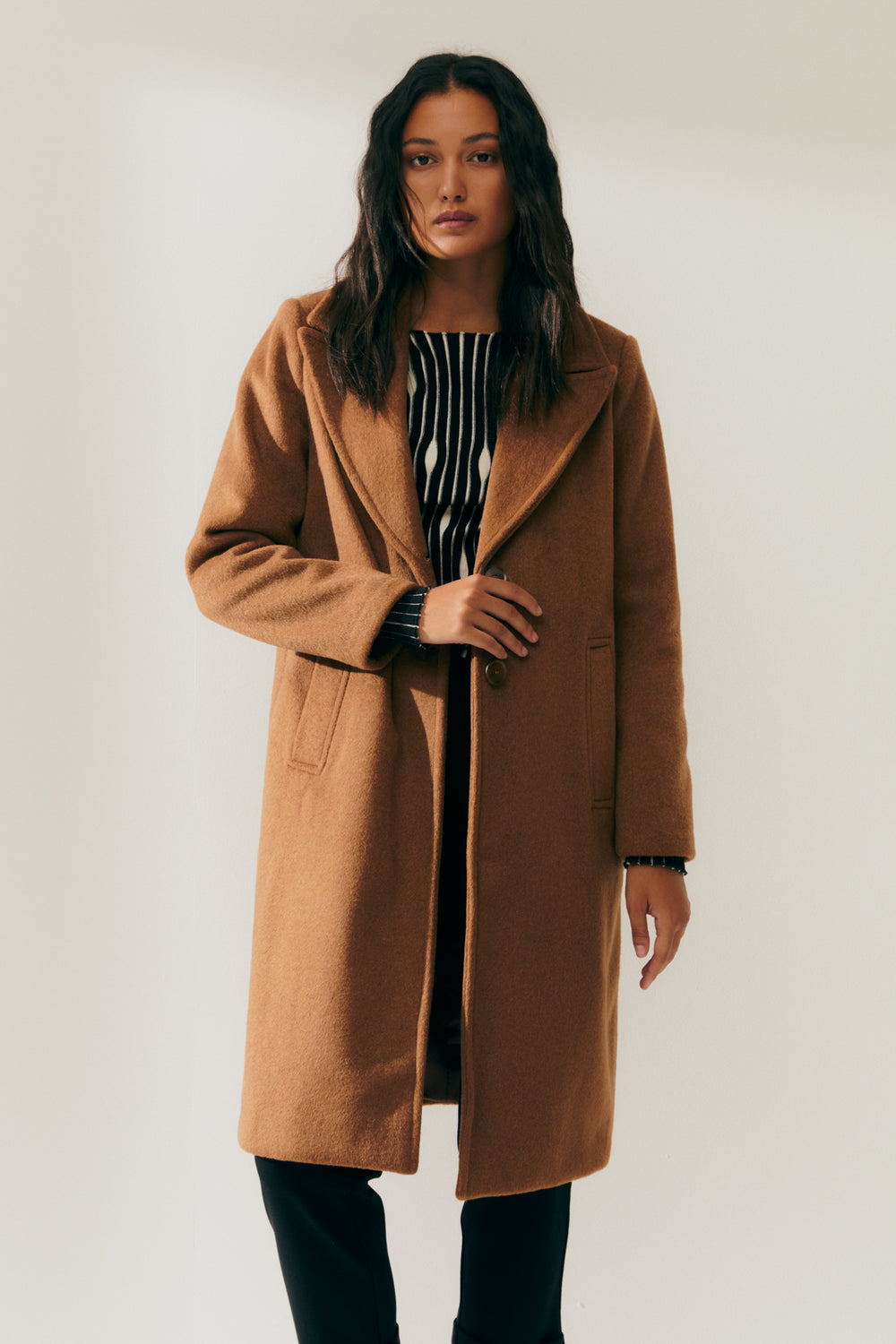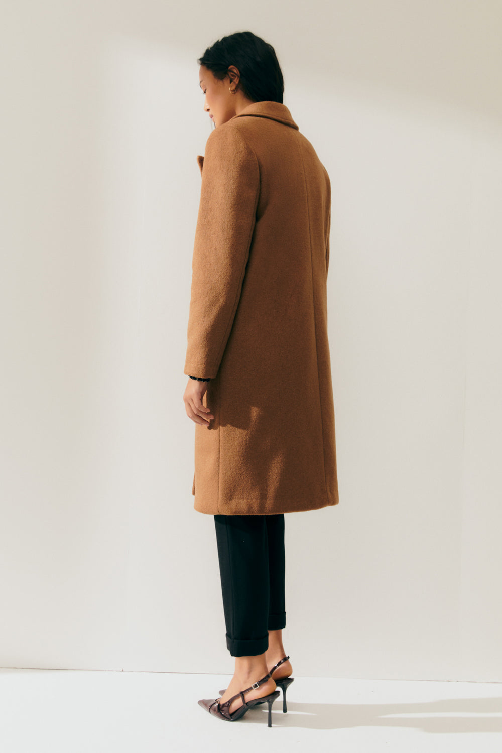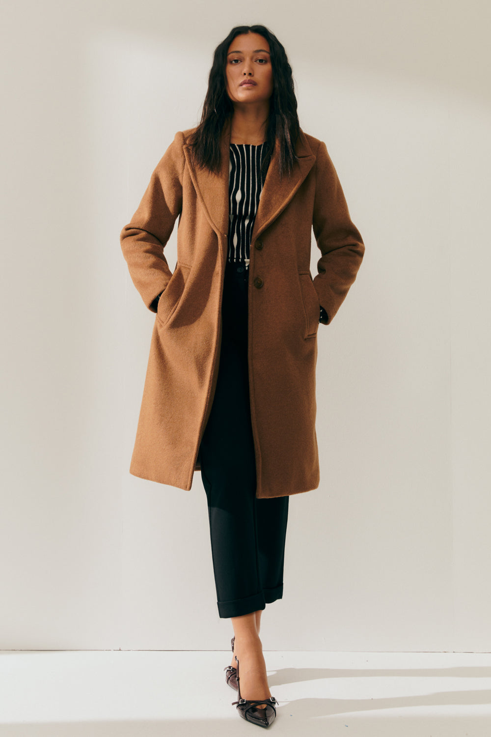 Abrigo largo y recto con cuello solapa, bolsillos laterales y forro contrastado. Cierre frontal con dos botones. Regular fit.