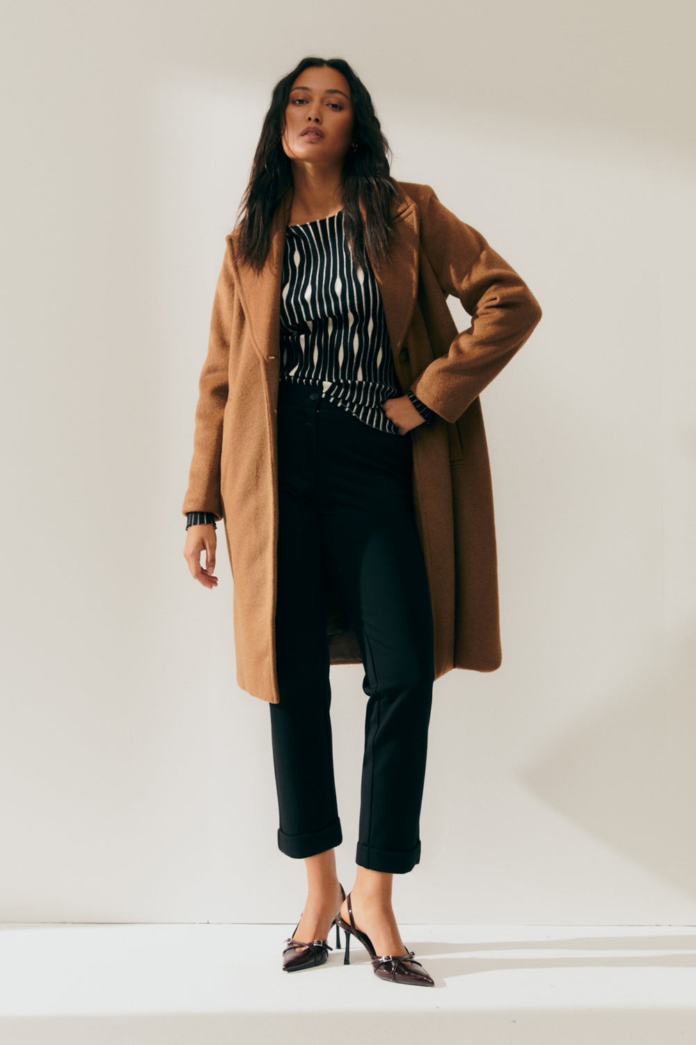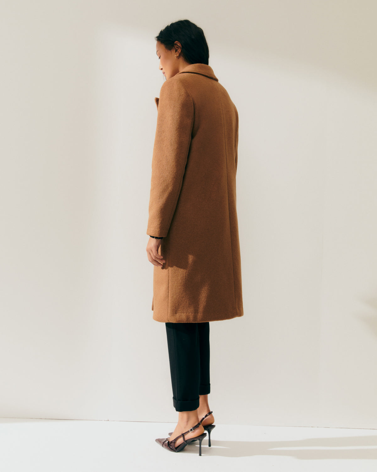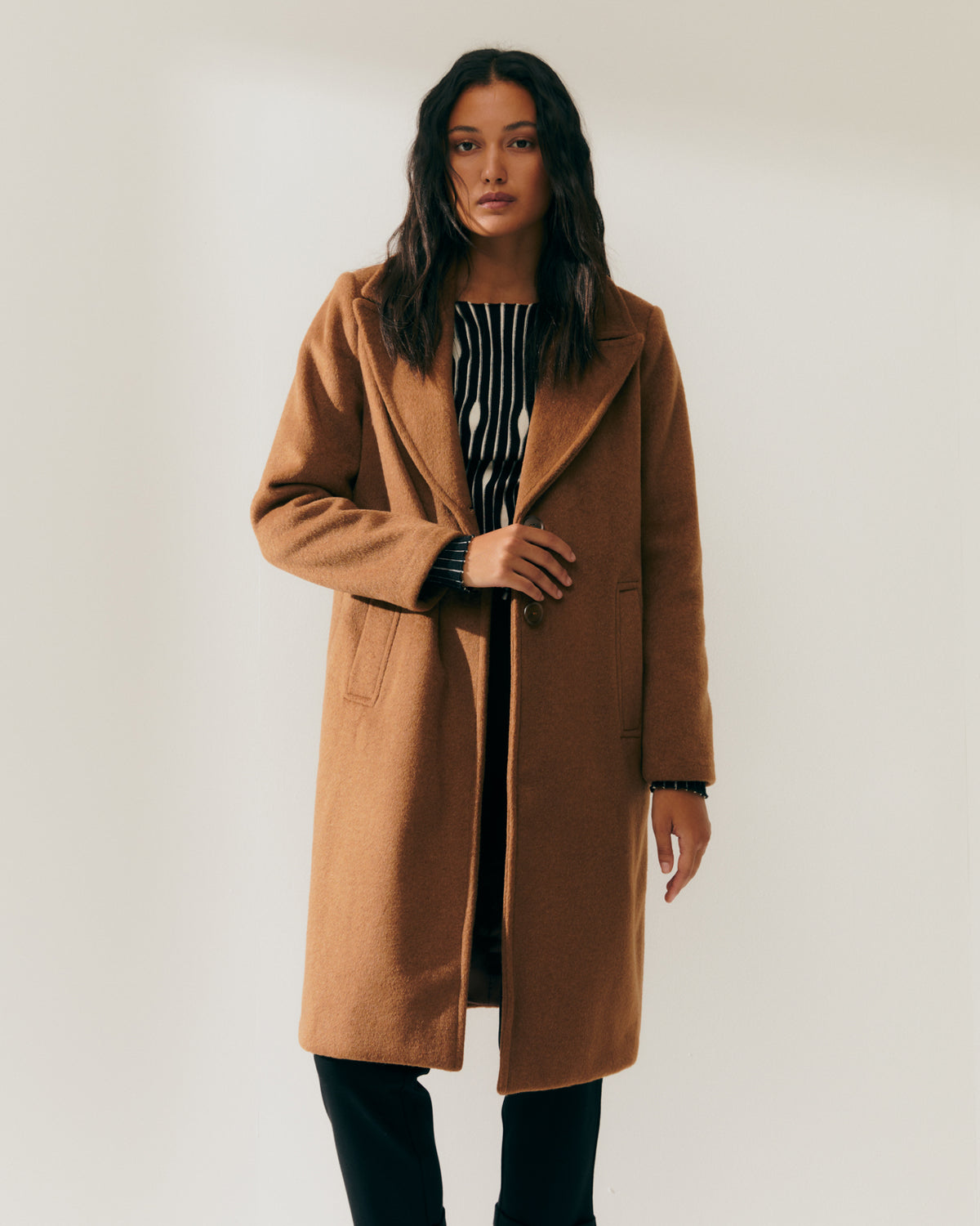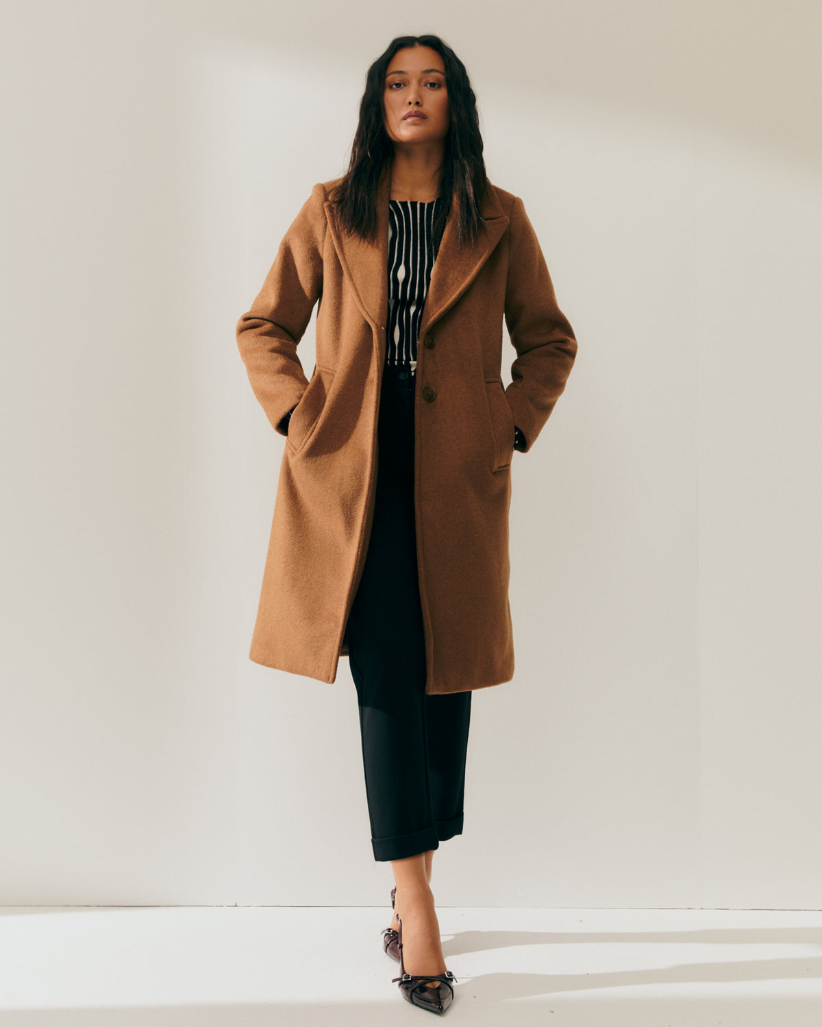 Abrigo largo y recto con cuello solapa, bolsillos laterales y forro contrastado. Cierre frontal con dos botones. Regular fit.