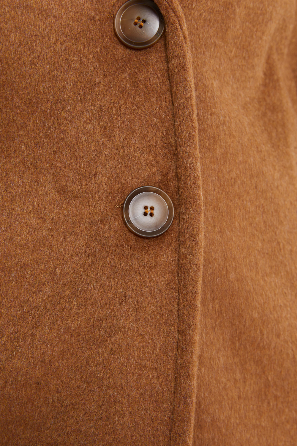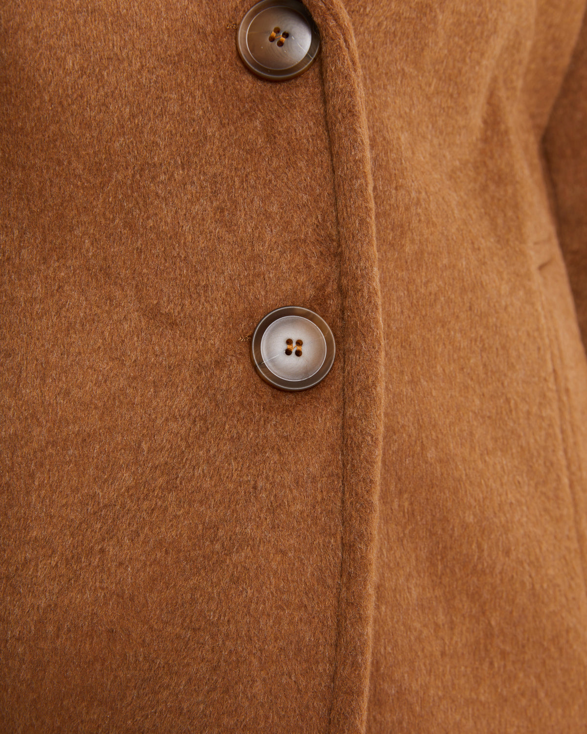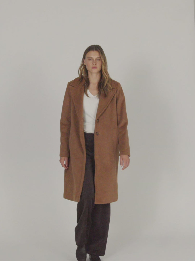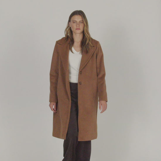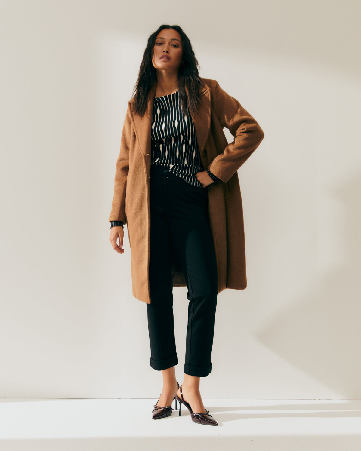 Abrigo largo y recto con cuello solapa, bolsillos laterales y forro contrastado. Cierre frontal con dos botones. Regular fit.