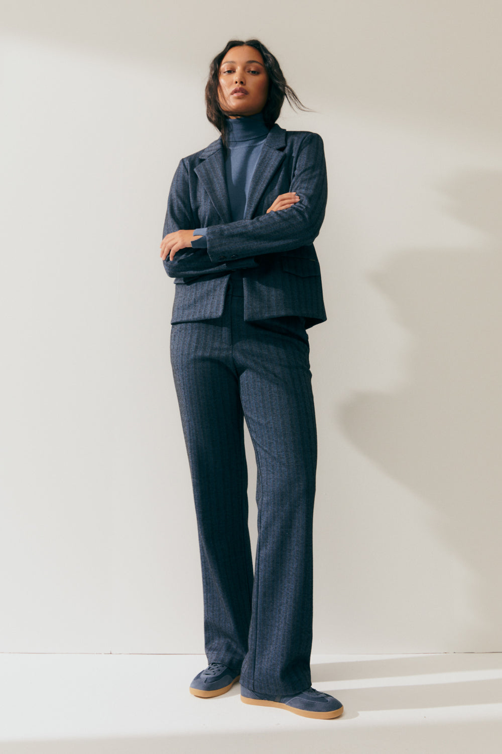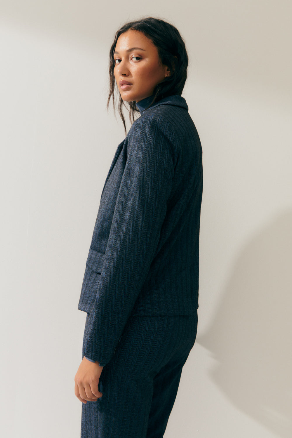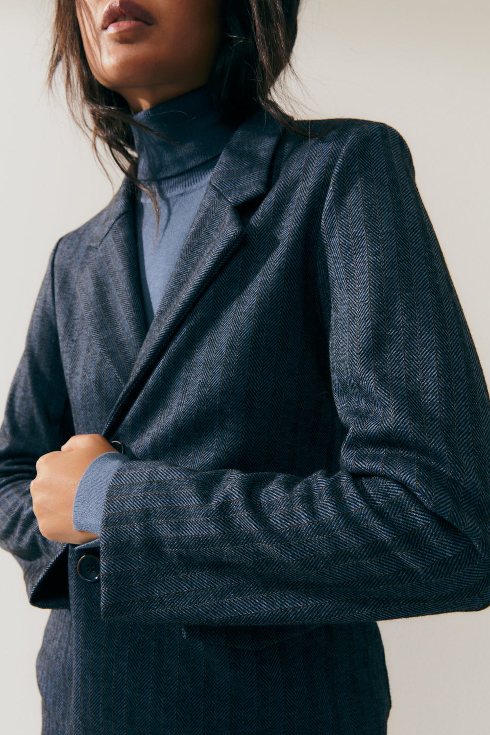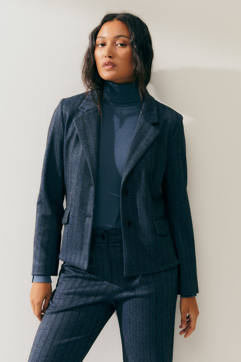 Blazer de punto sin forrar estampado rayas de espiga. Cuello solapa y bolsillos de tapeta. Cierre frontal con dos botones. Combínalo con su pantalón a juego para conseguir un look perfecto. Regular fit.