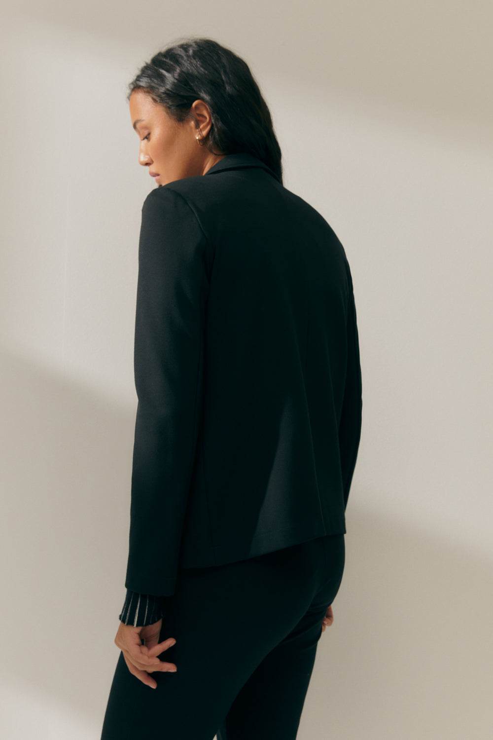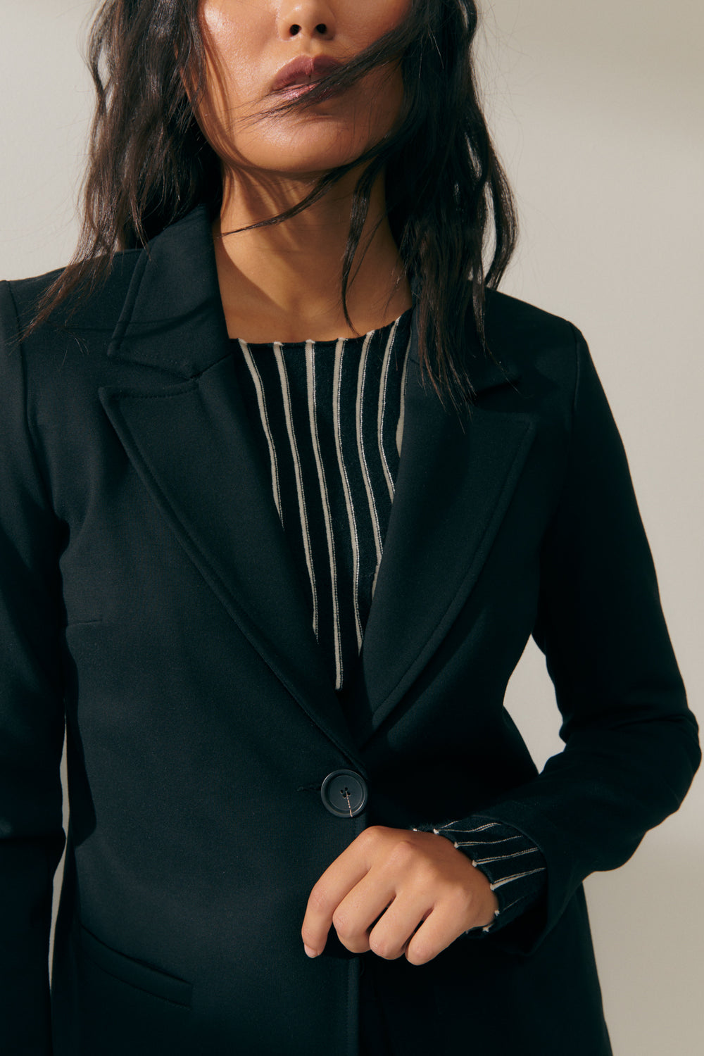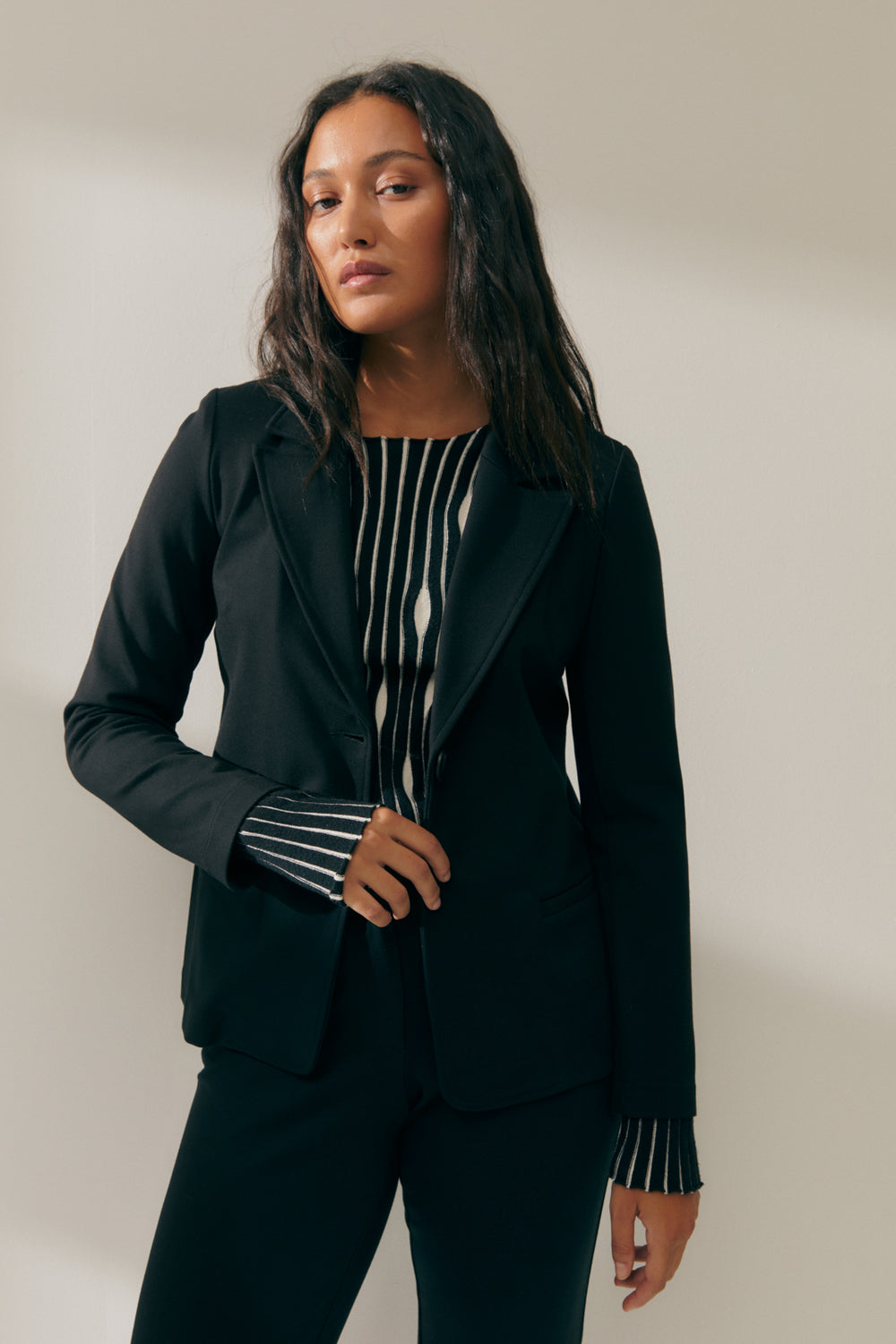 Blazer de punto roma con cuello solapa y bolsillos de vivo. Cierre frontal con un botón. Blazer con vivos interiores a contraste. Regular fit.