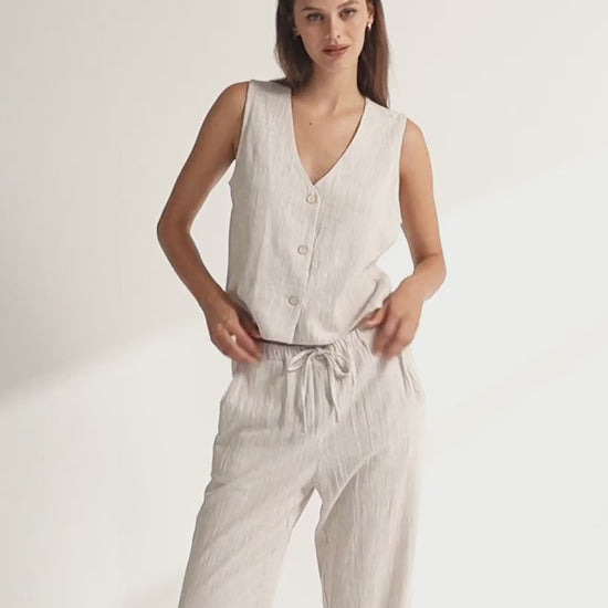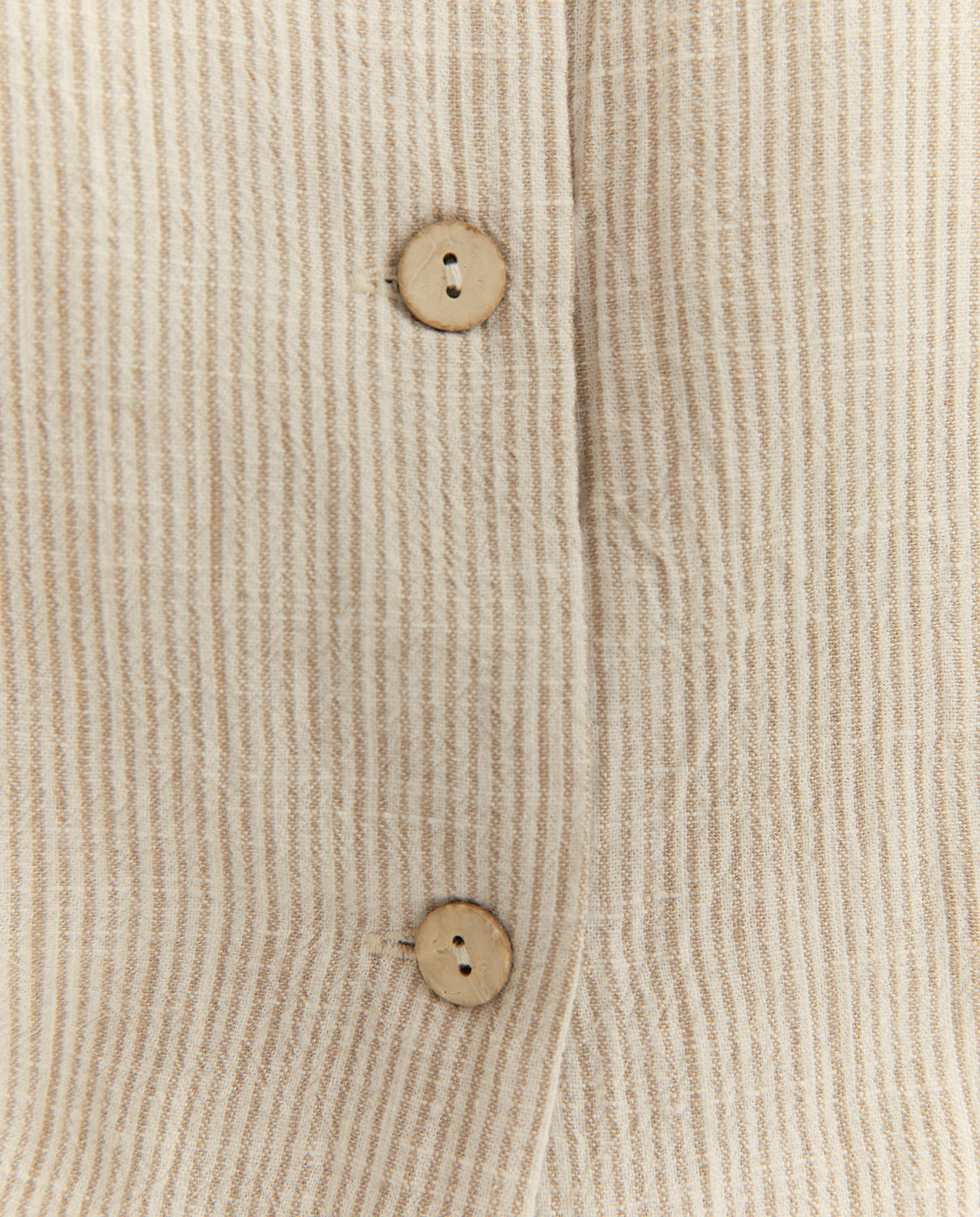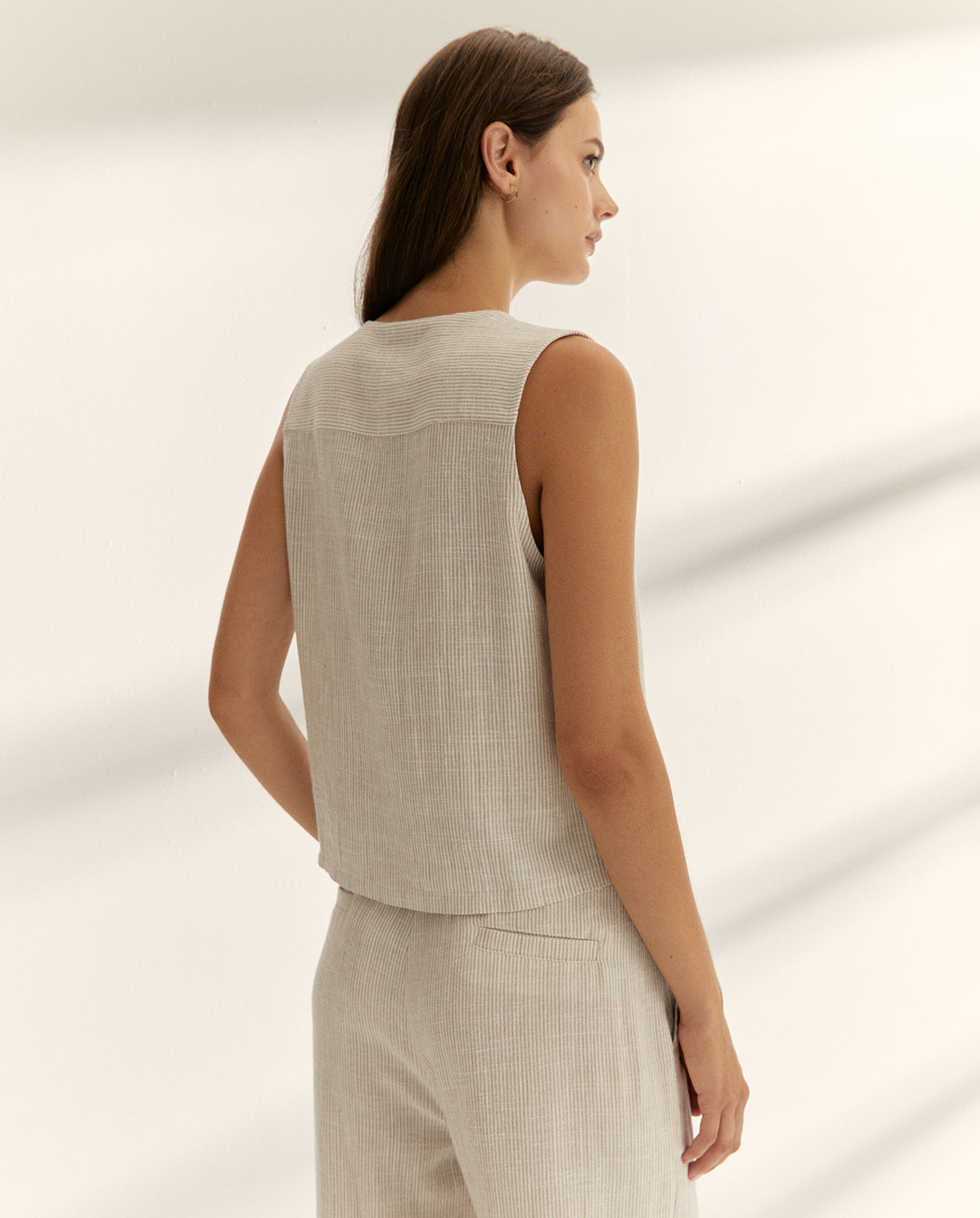 Blusa efecto chaleco confeccionado en tejido mil rayas color natural. Cierre frontal con botones. Puedes encontrar su pantalón a conjunto. Regular fit.