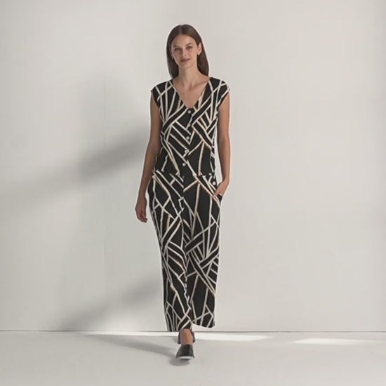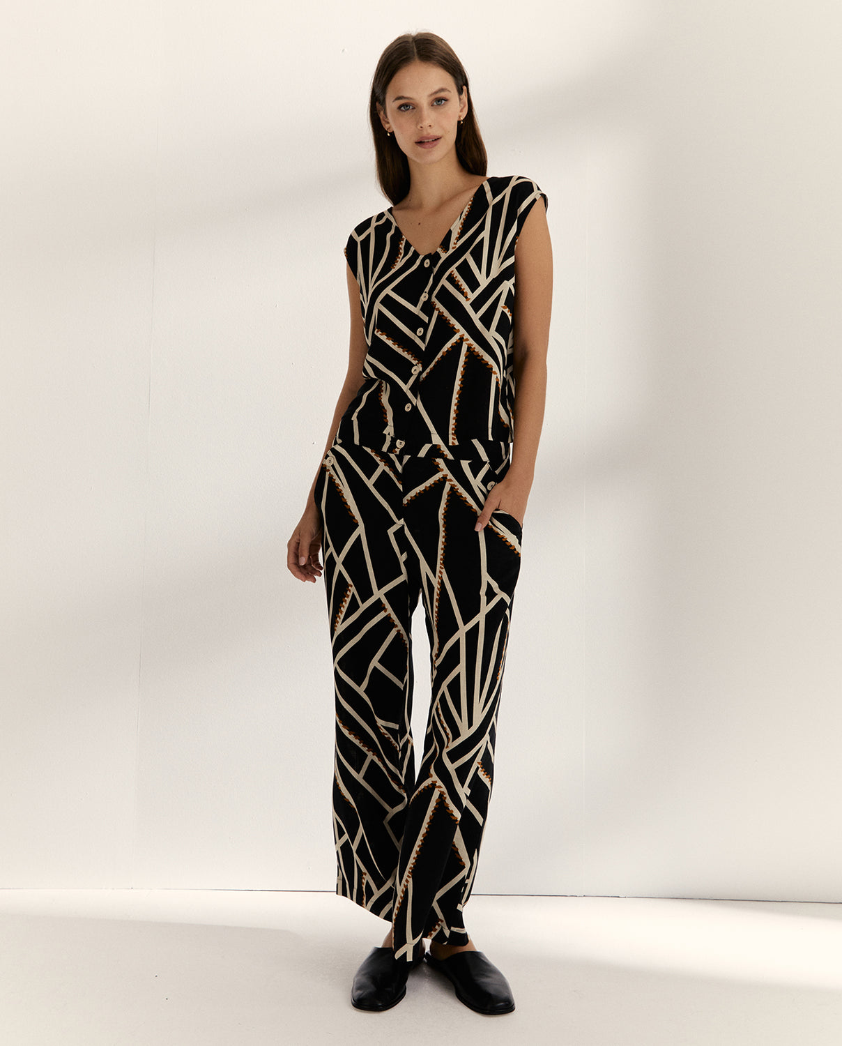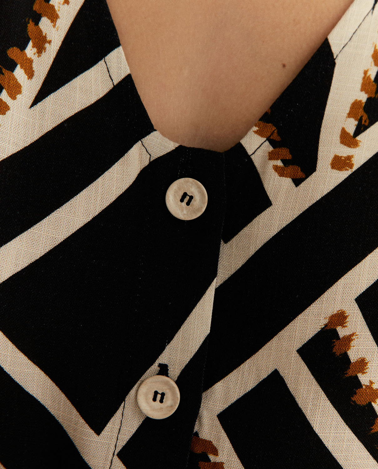 Blusa estampado geométrico efecto chaleco en cuello pico. Cierre frontal con botones. Una prenda moderna que combina la elegancia del chaleco con la ligereza de una blusa. Regular fit.