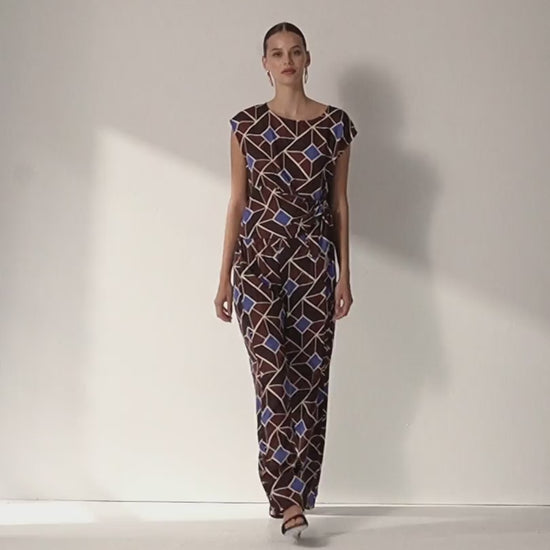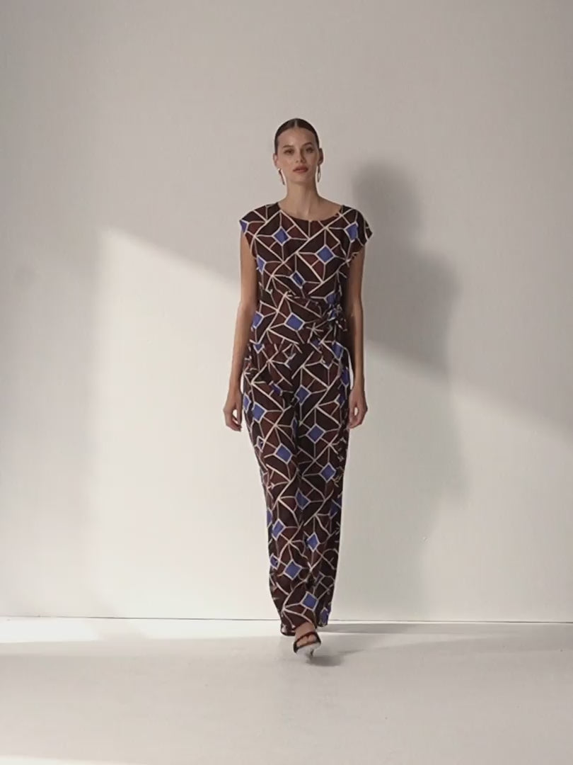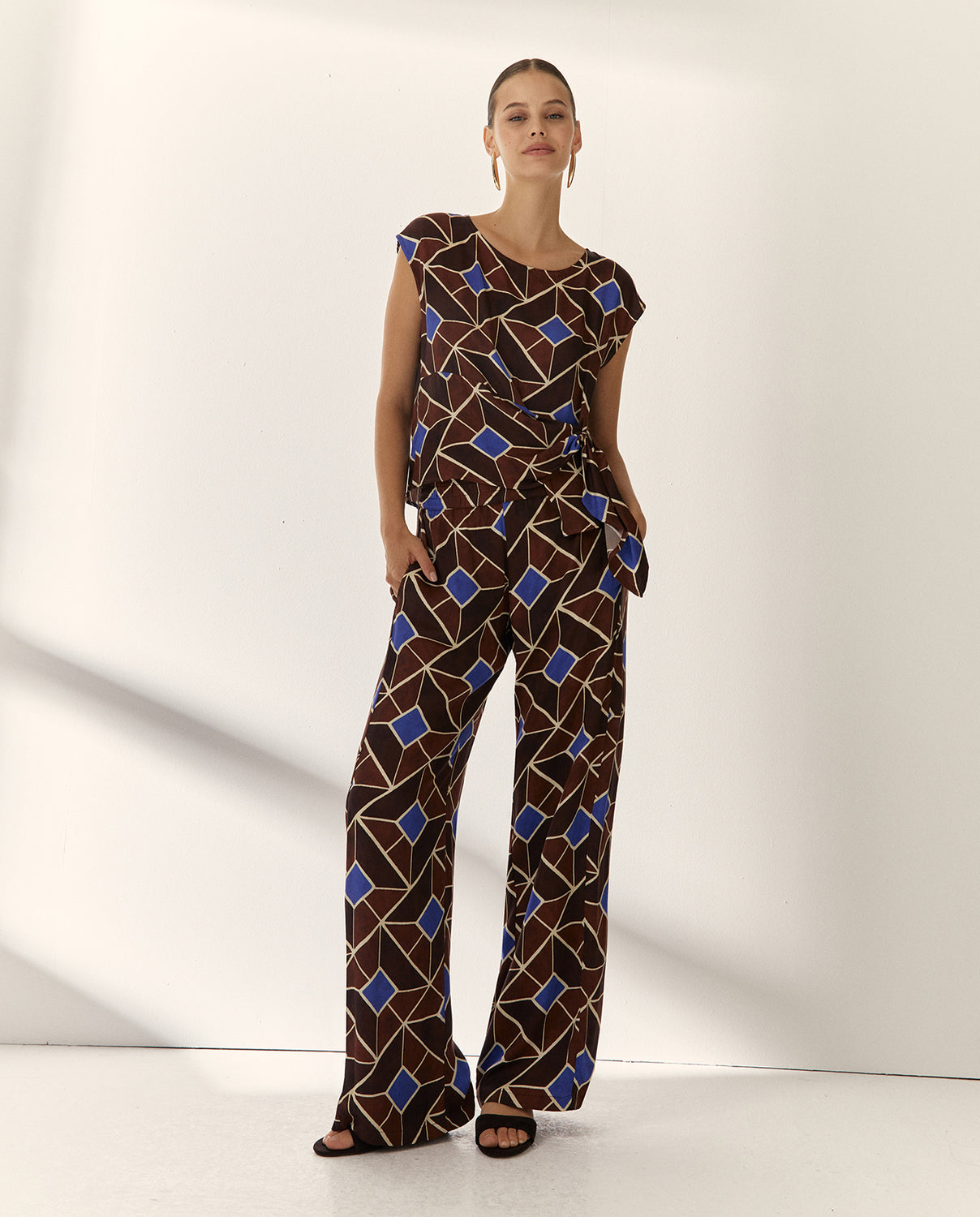 Blusa sin mangas y cuello redondo, confeccionada en tejido estampado de caída suave. Detalle de una pieza lateral con recogido y efecto lazada, que aporta un toque distintivo y femenino. Regular fit.