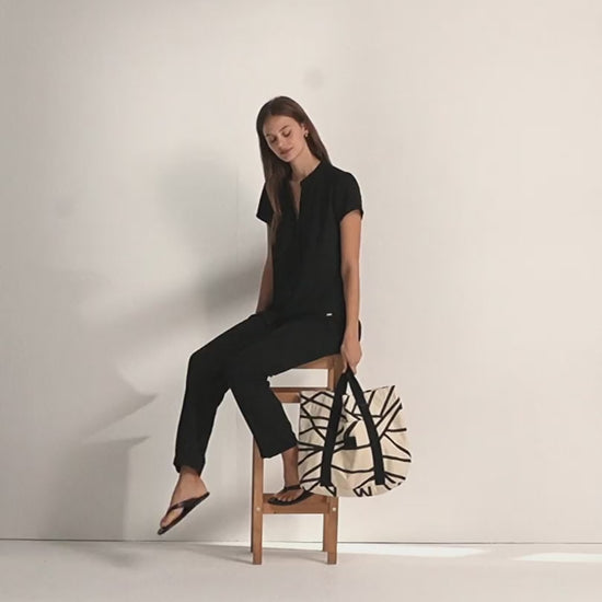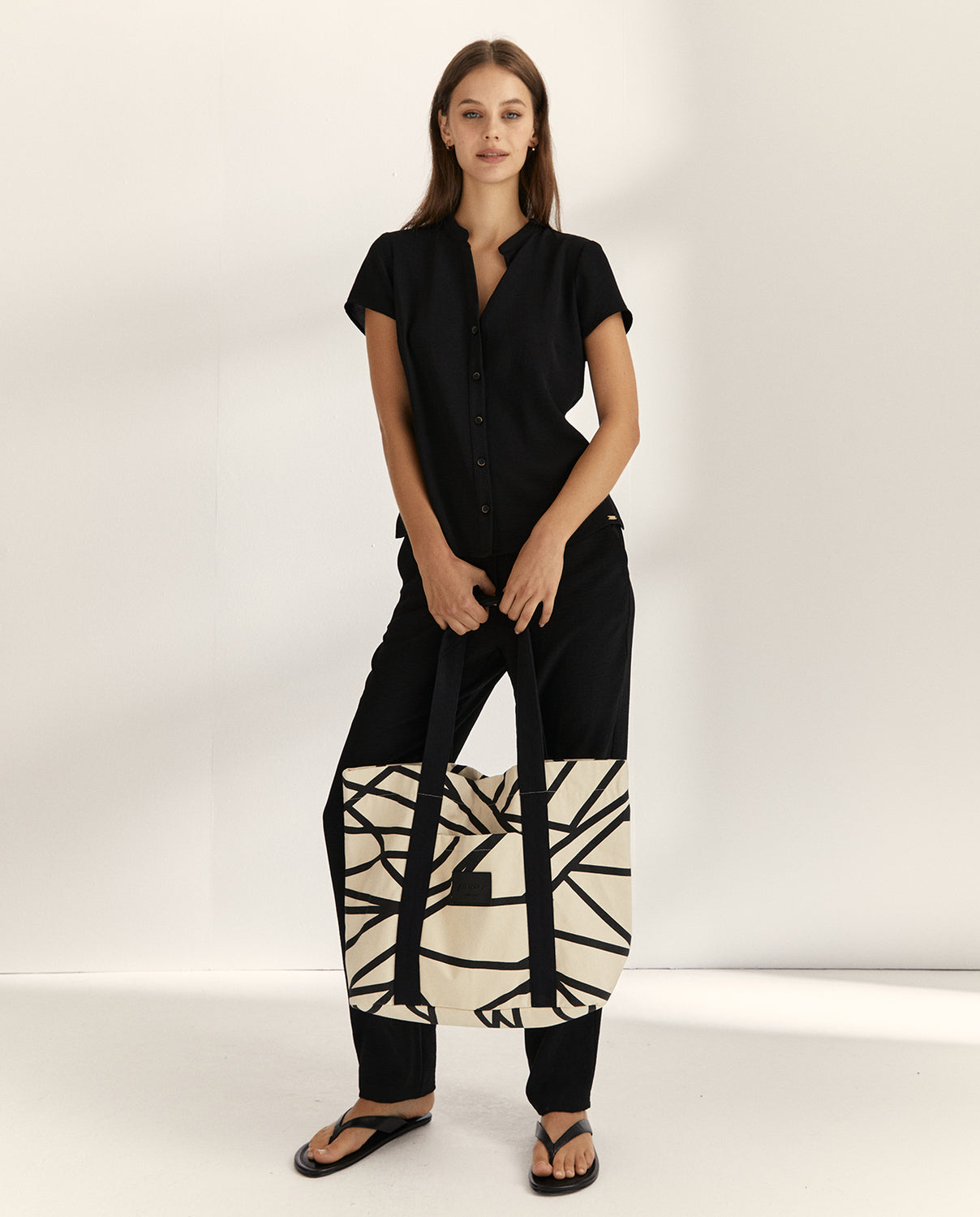 Bolso de hombro shopping estampado geométrico y forrado. Cierre con botón automático a presión y pequeño bolsillo interior. Asas contrastadas en color negro.