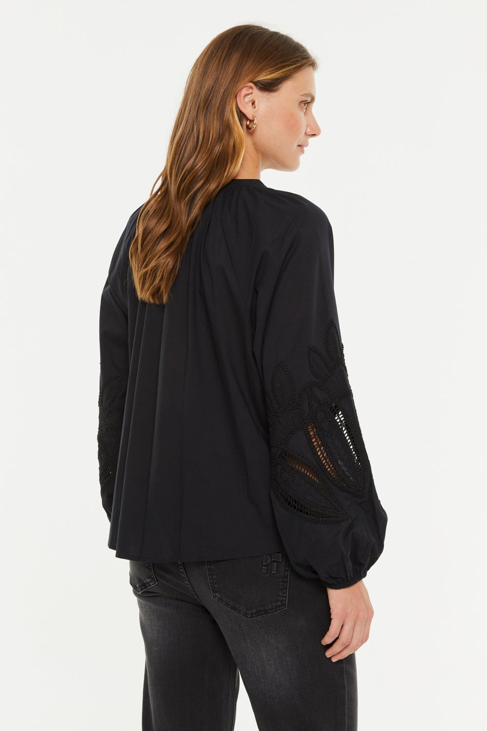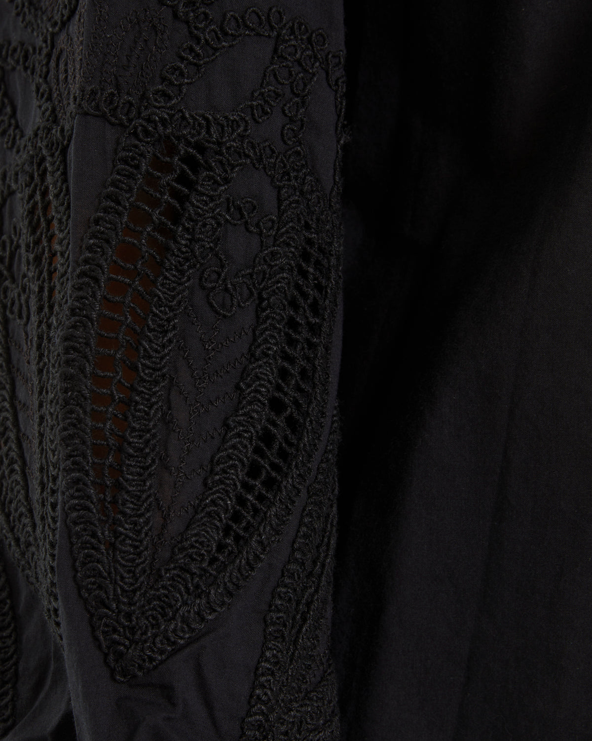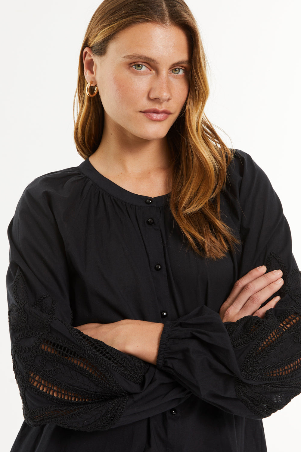 Camisa sin cuello y mangas ligeramente abullonadas en bordado suizo. Goma elástica en los puños. Cierre frontal con botones. Confeccionada en un tejido 100% algodón. Regular fit.