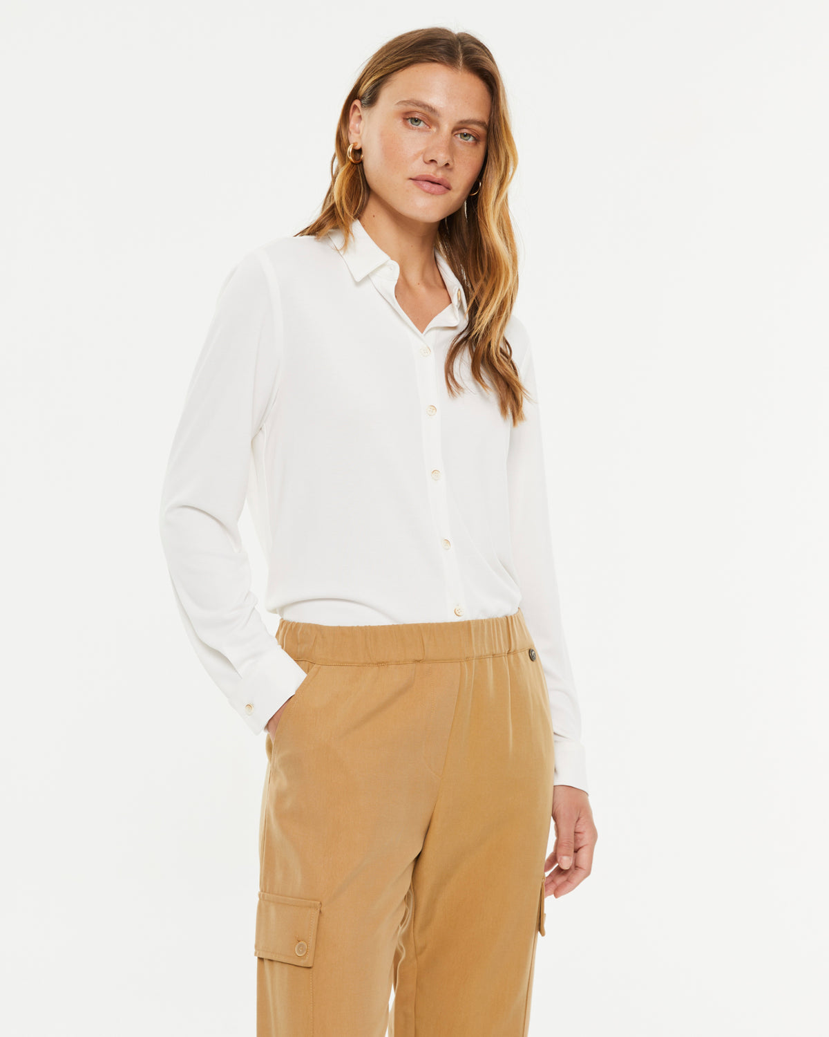 Camisa en punto liso de manga larga y cuello camisero. Cierre frontal con botones. Confeccionada en un tejido de modal lo que le aporta a la prenda suavidad, fluidez y comodidad. Regular fit.