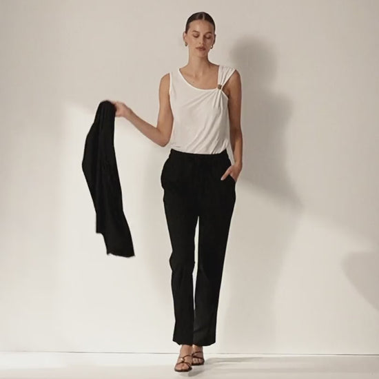 Camiseta asimétrica, formada por un tirante ancho en un lado y un recogido con pieza metálica dorada en el otro, aportando un toque distintivo y moderno. Una prenda versátil y elegante con un guiño sofisticado en cada detalle. Regular fit.