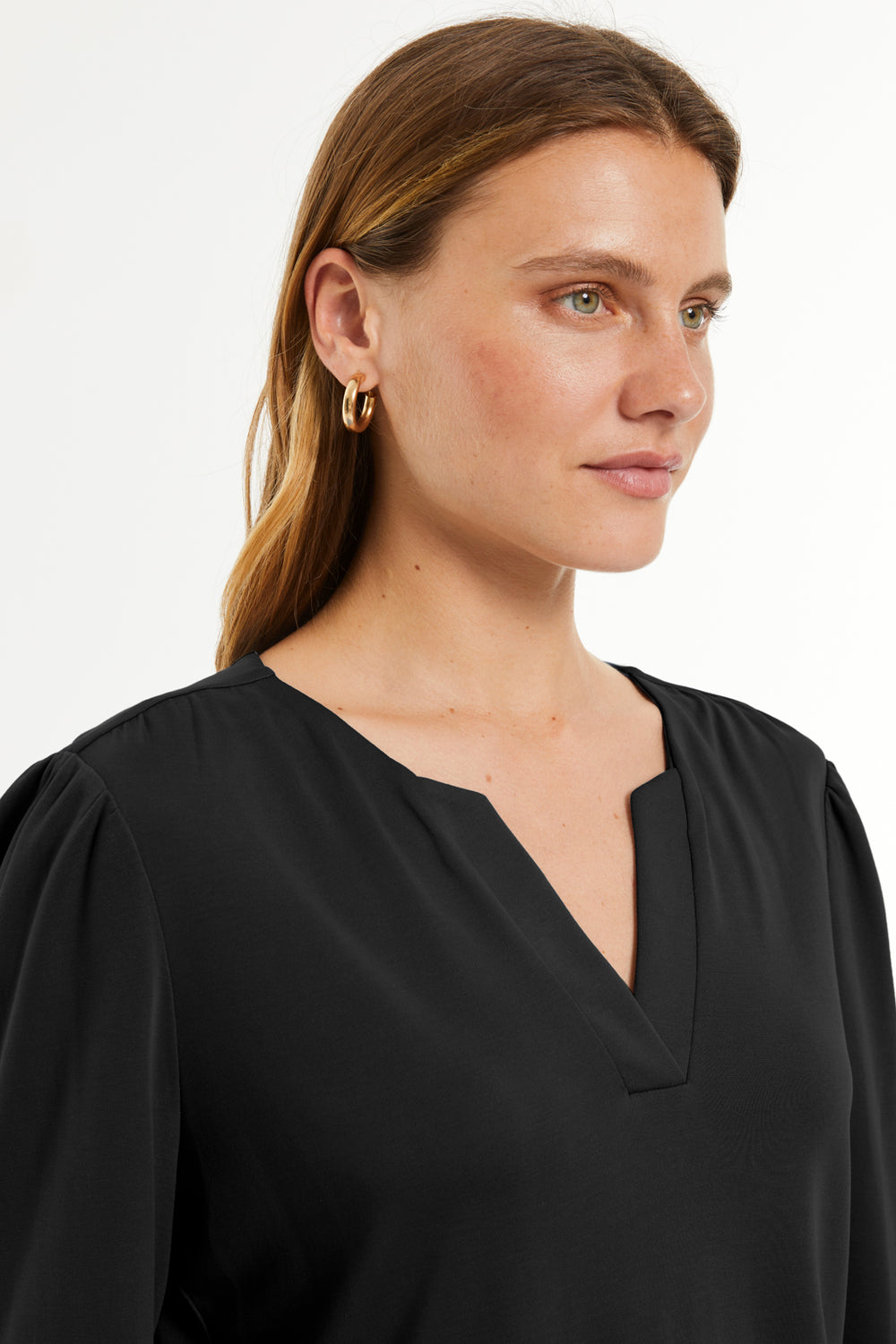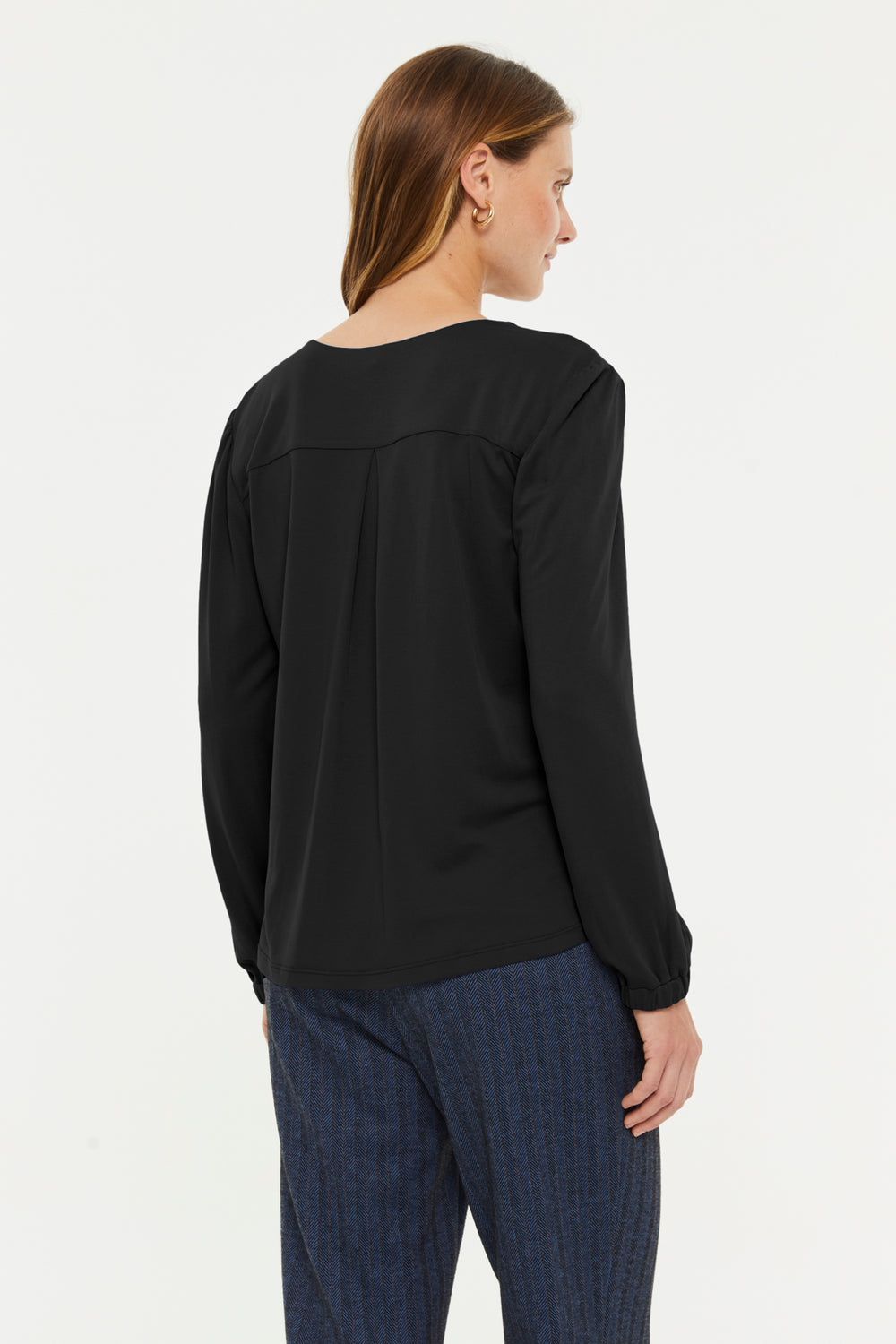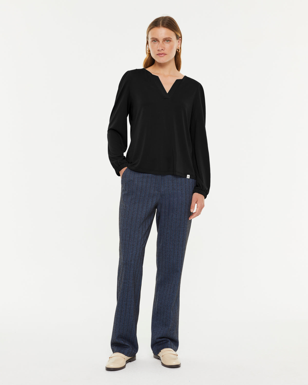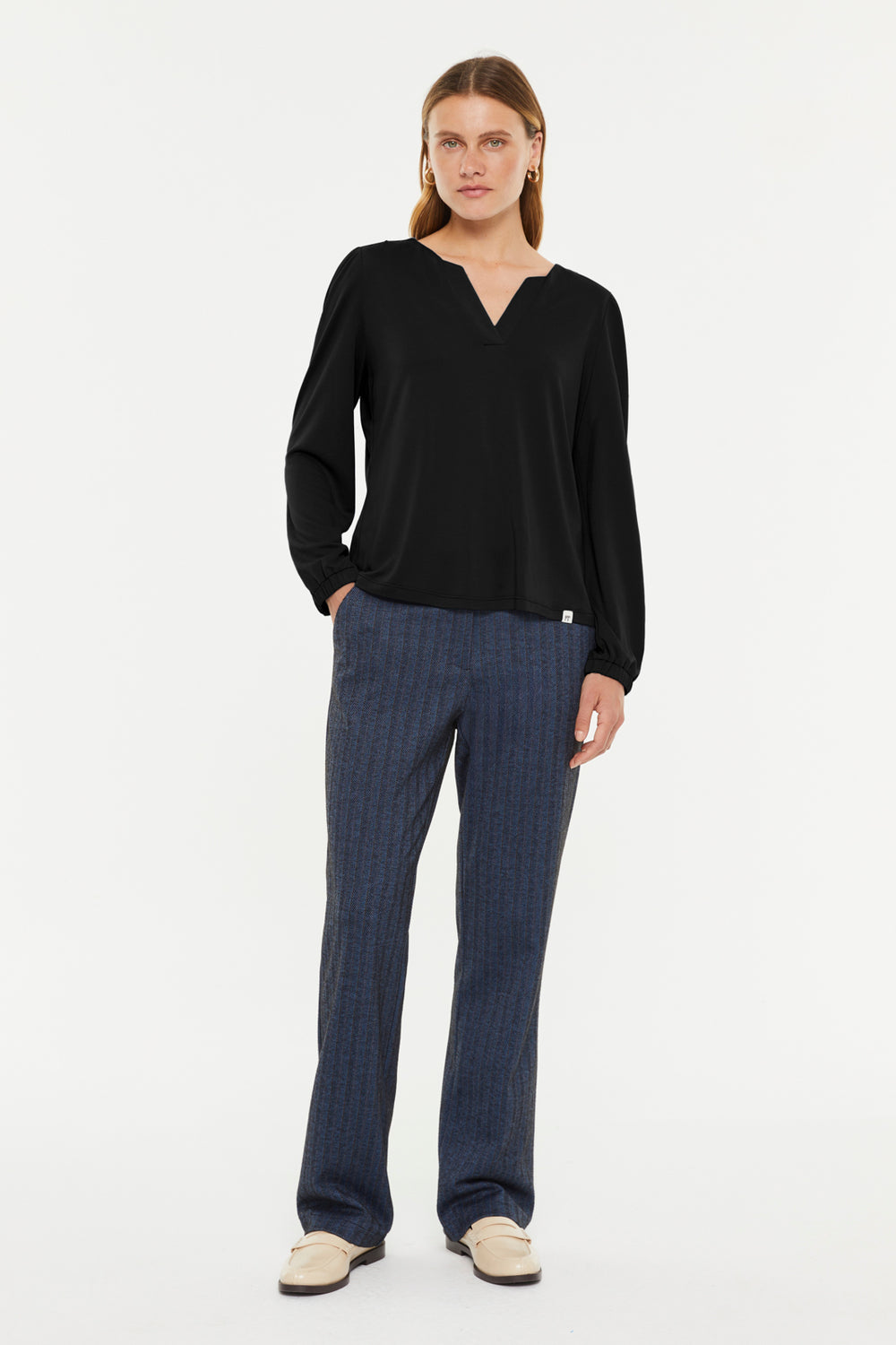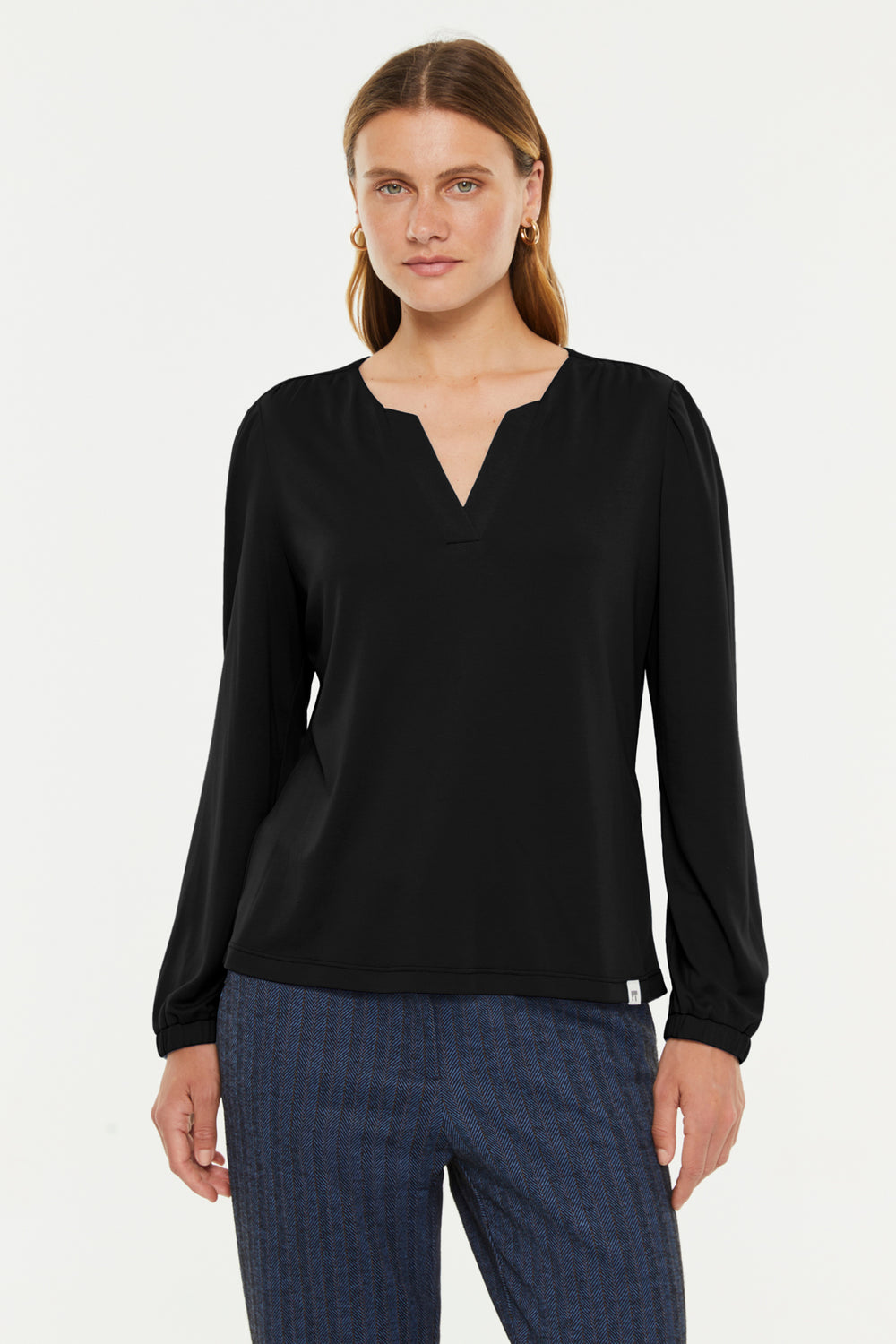Camiseta escote pico y manga larga. Puños con goma elástica. Confeccionada en un tejido de modal lo que le aporta suavidad, fluidez y comodidad a la prenda. Regular fit.