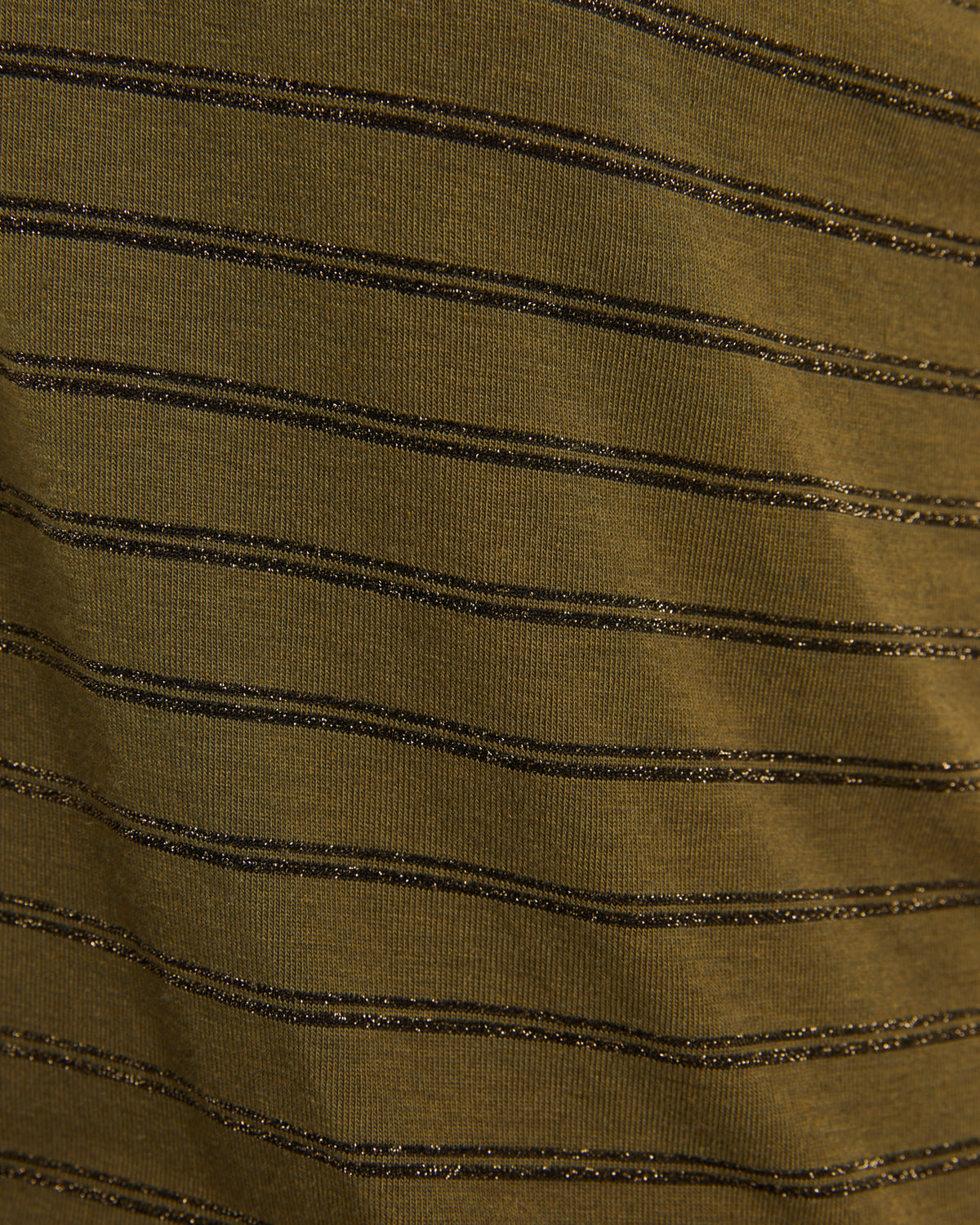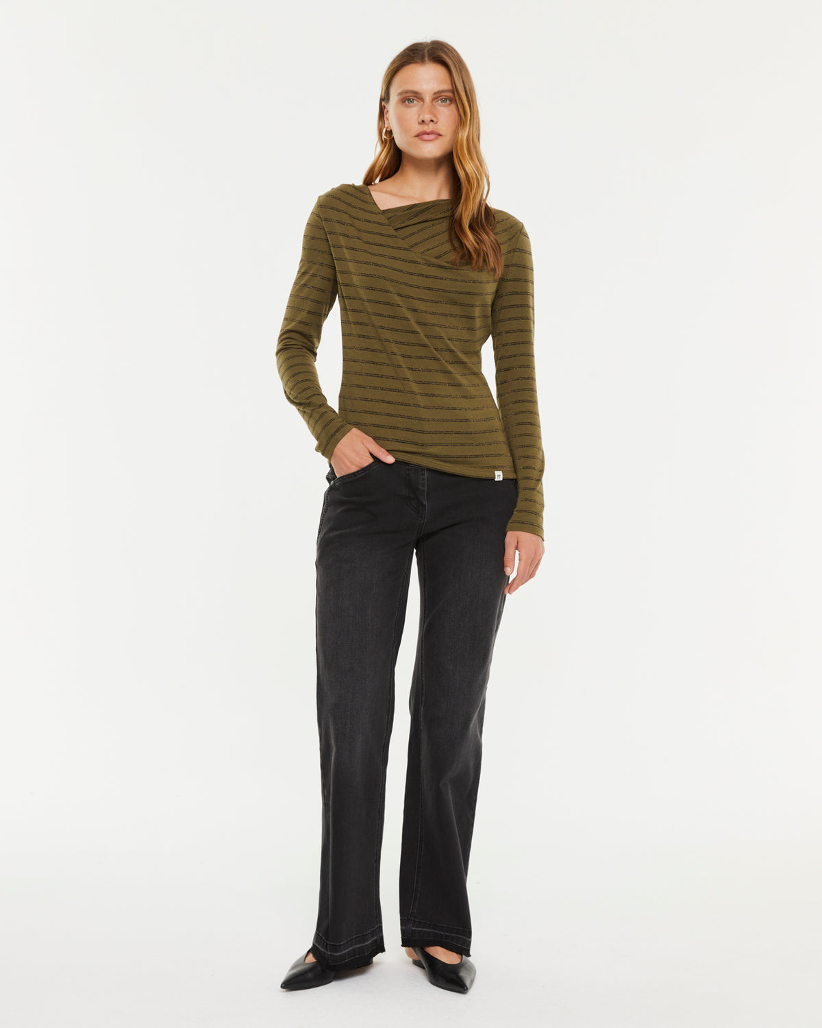 Camiseta estampado rayas lurex. Escote asimétrico y manga larga. Regular fit.