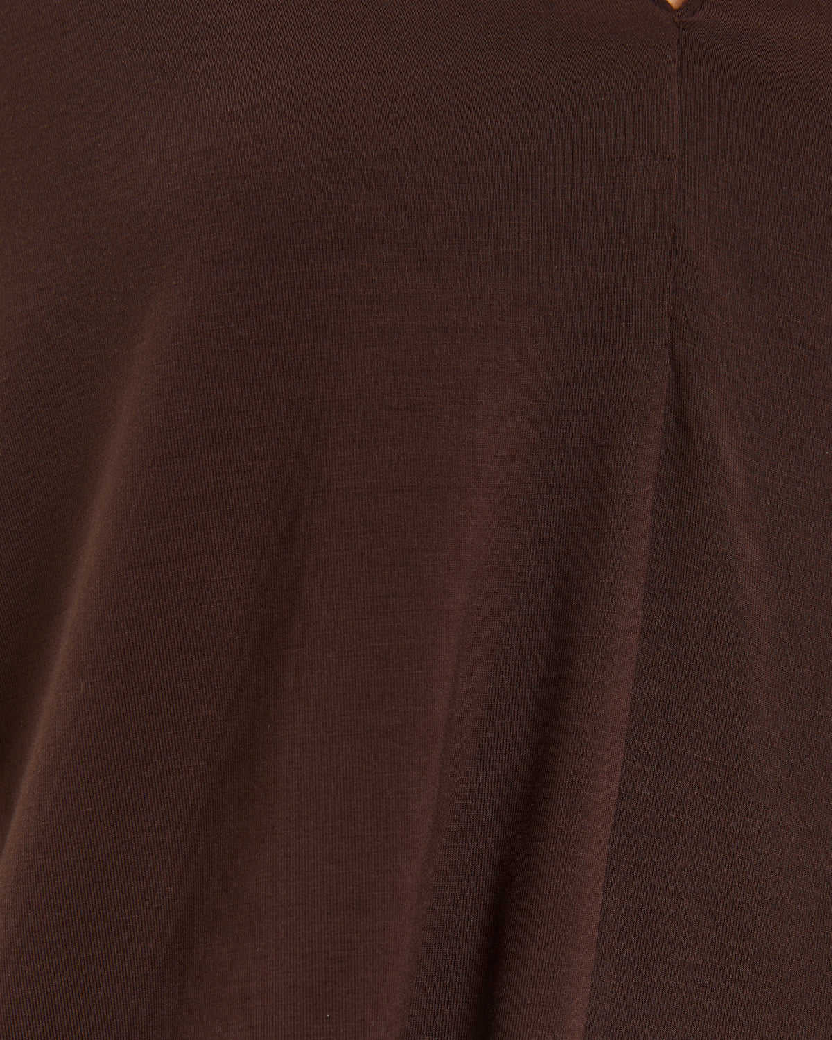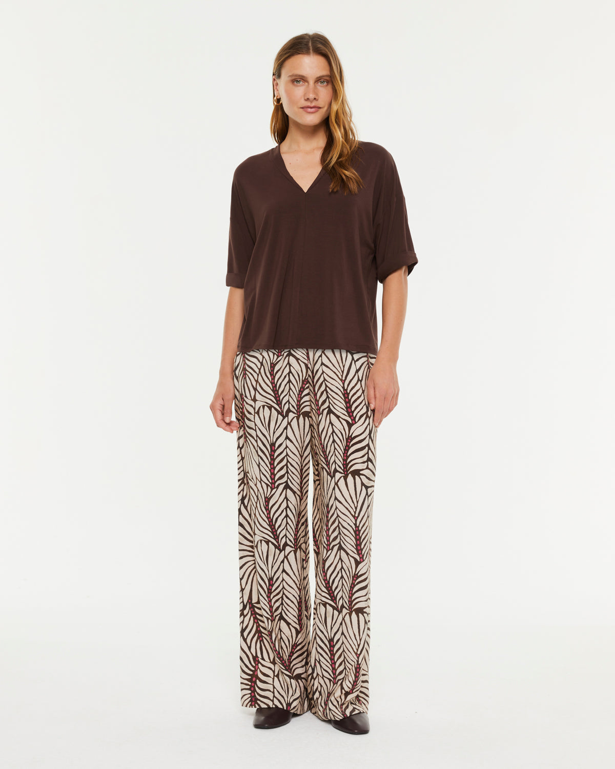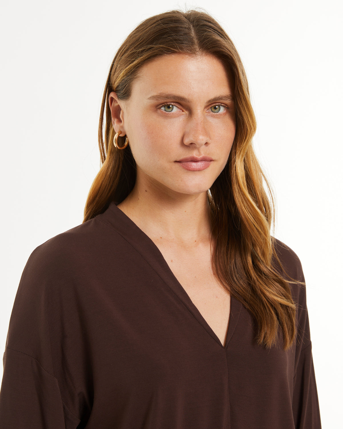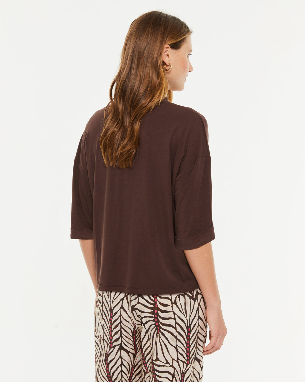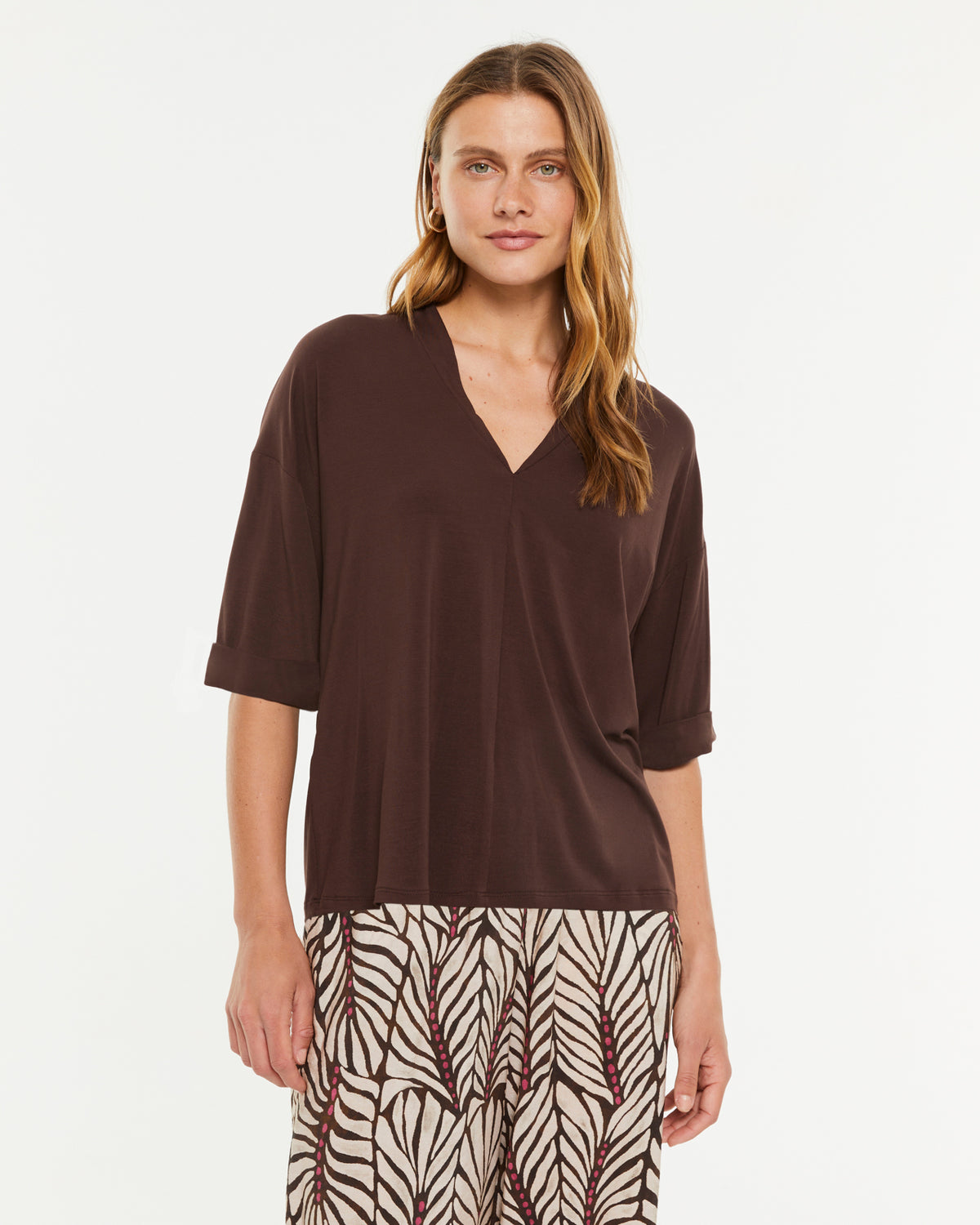 Camiseta fluida de manga corta y escote pico. Realizada en un tejido de bambú. Una prenda básica muy cómoda que no puede faltar en nuestro armario. Regular fit.
