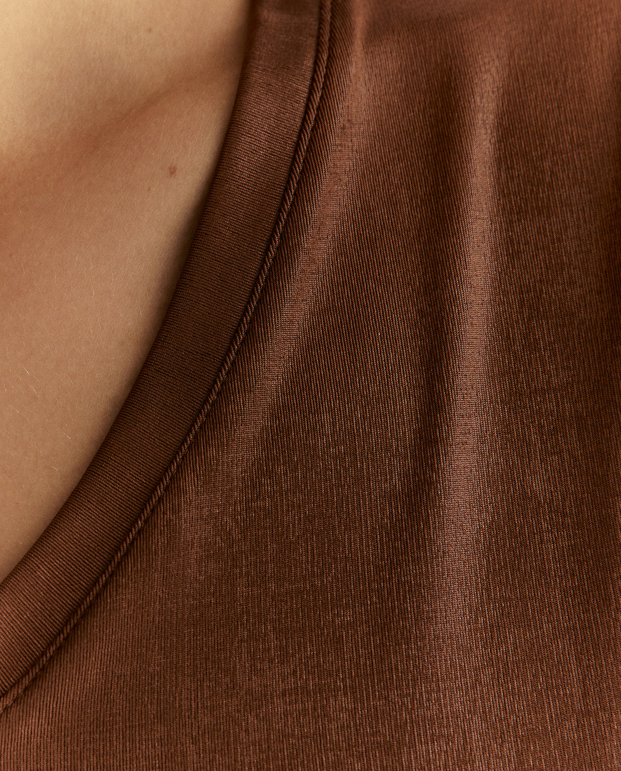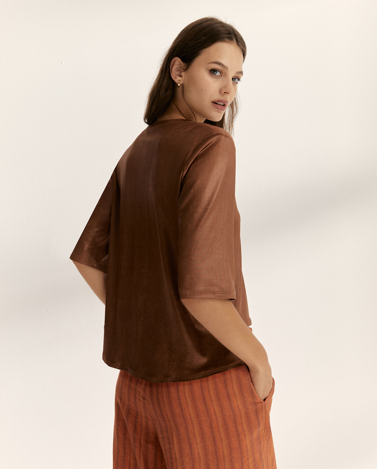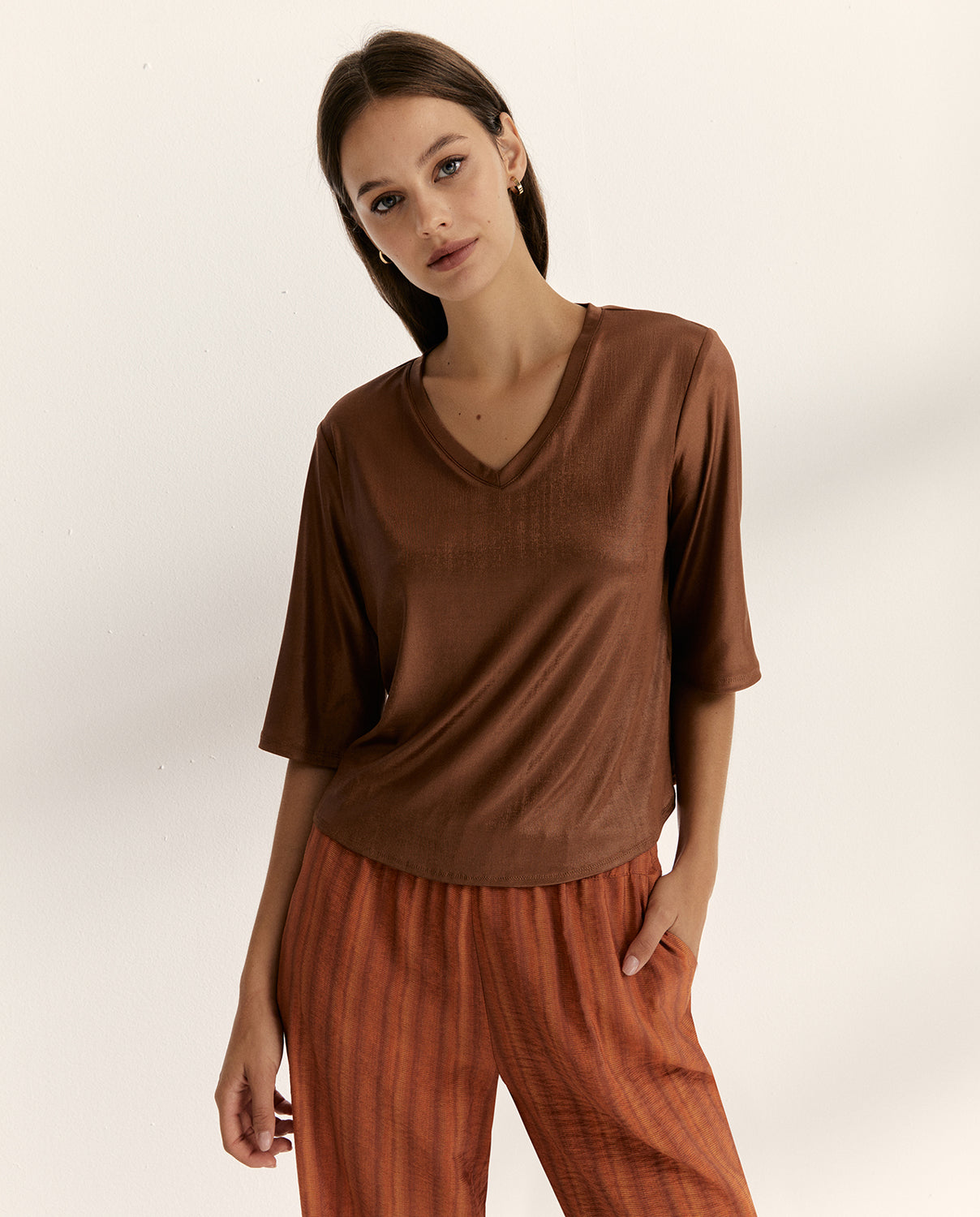 Camiseta con cuello de pico y manga tres cuartos. Con tejido satinado que aporta un acabado elegantne y ligero, ideal para cualquier ocasión. Regular fit.