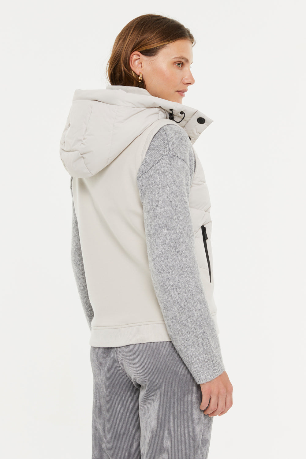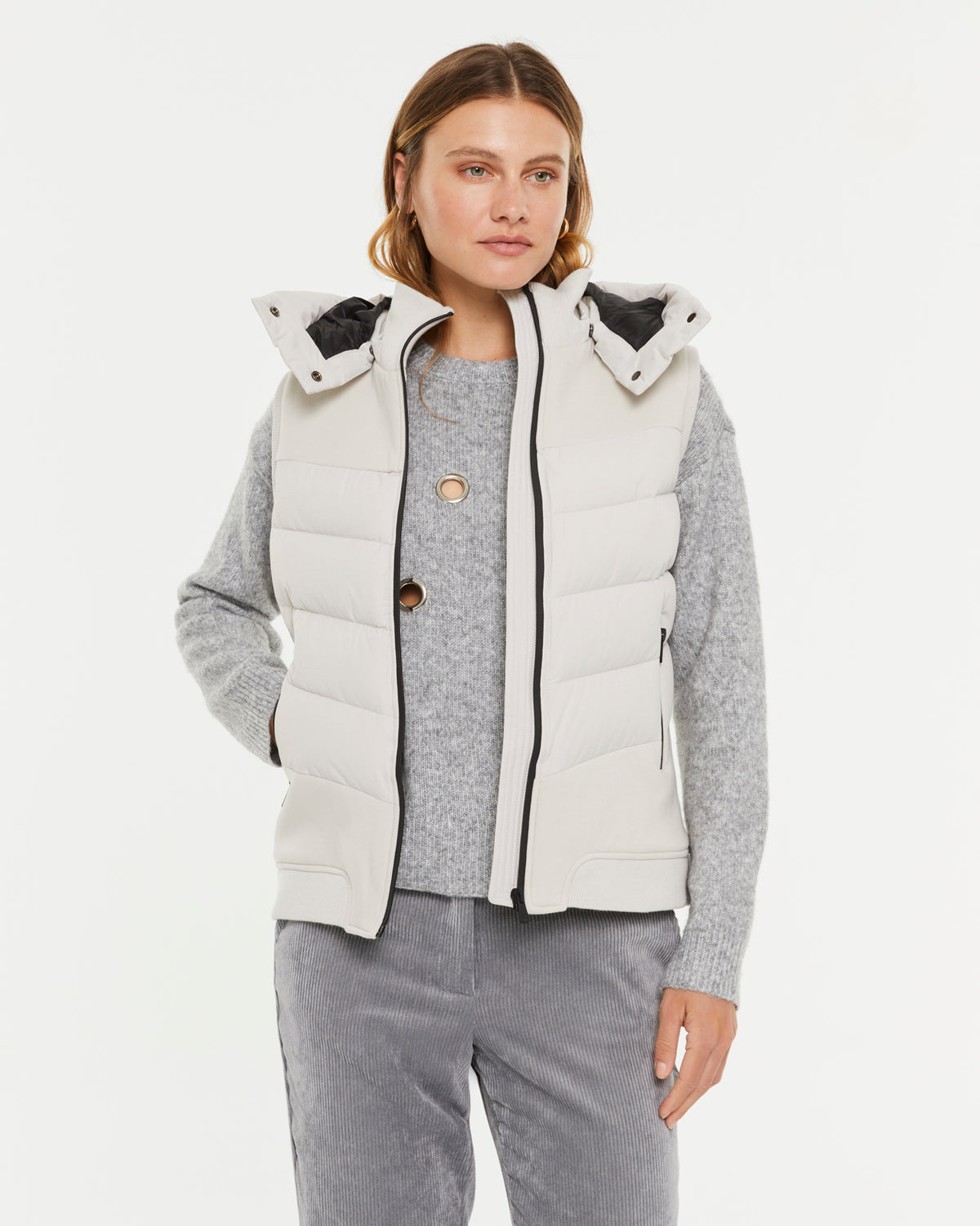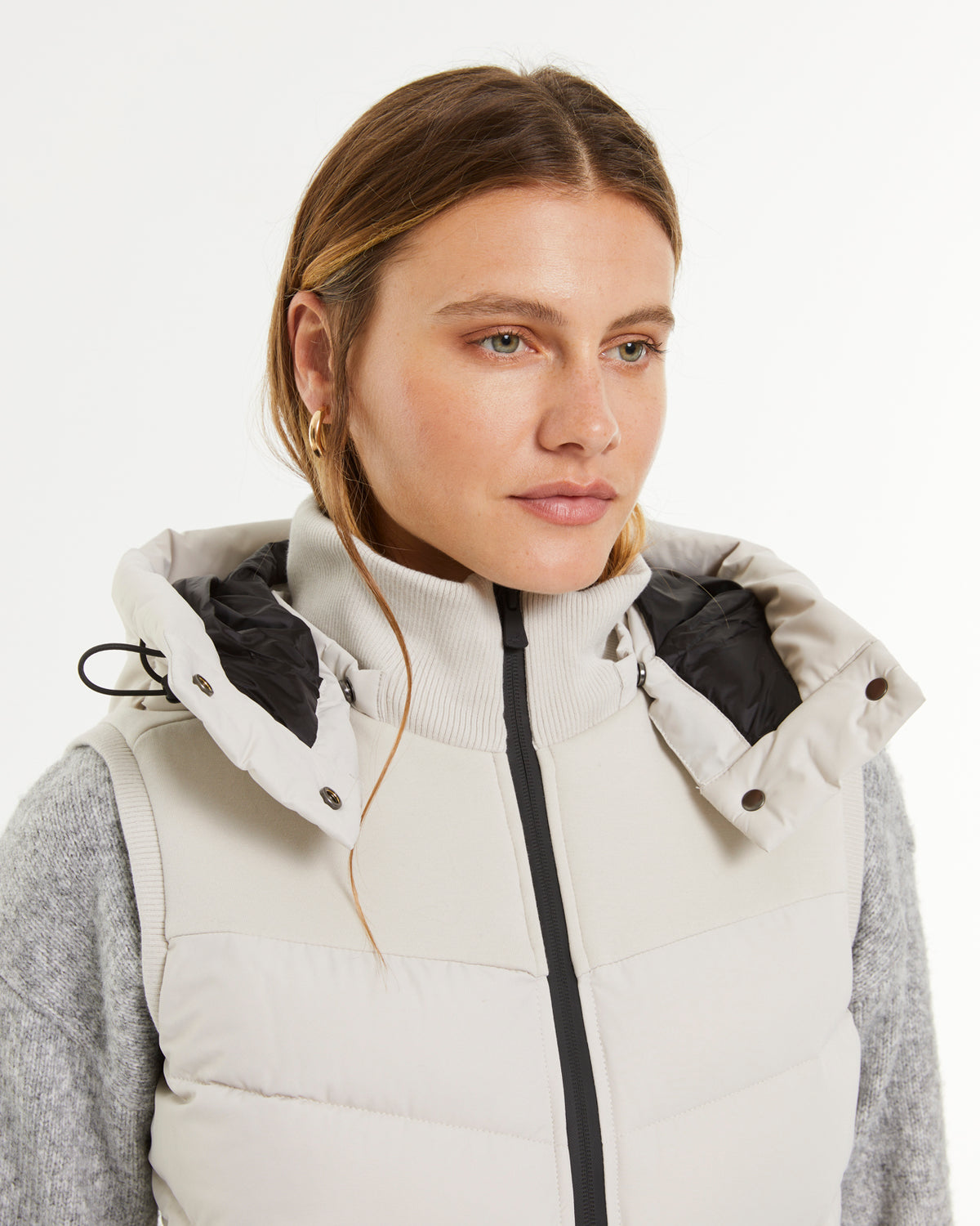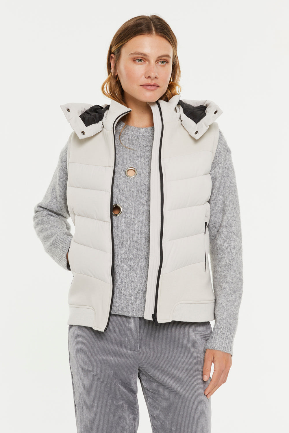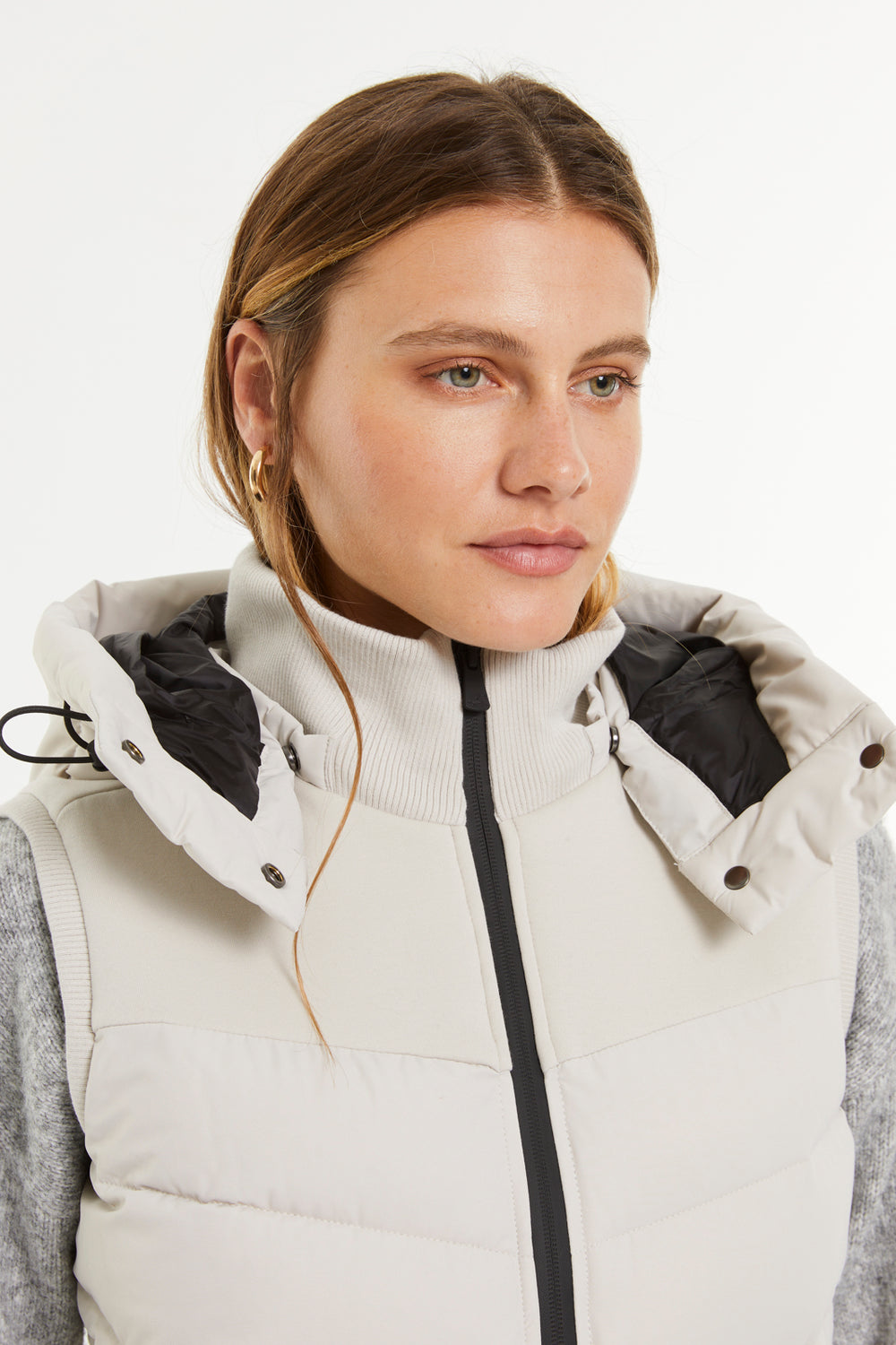 Chaleco corto acolchado con cuello alto de punto, capucha desmontable, broches a presión y bolsillos de cremallera contrastado. Confeccionado delantero tejido técnico y espalda de punto. Cierre frontal con cremallera. Regular fit.