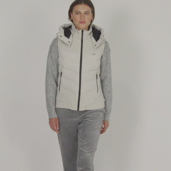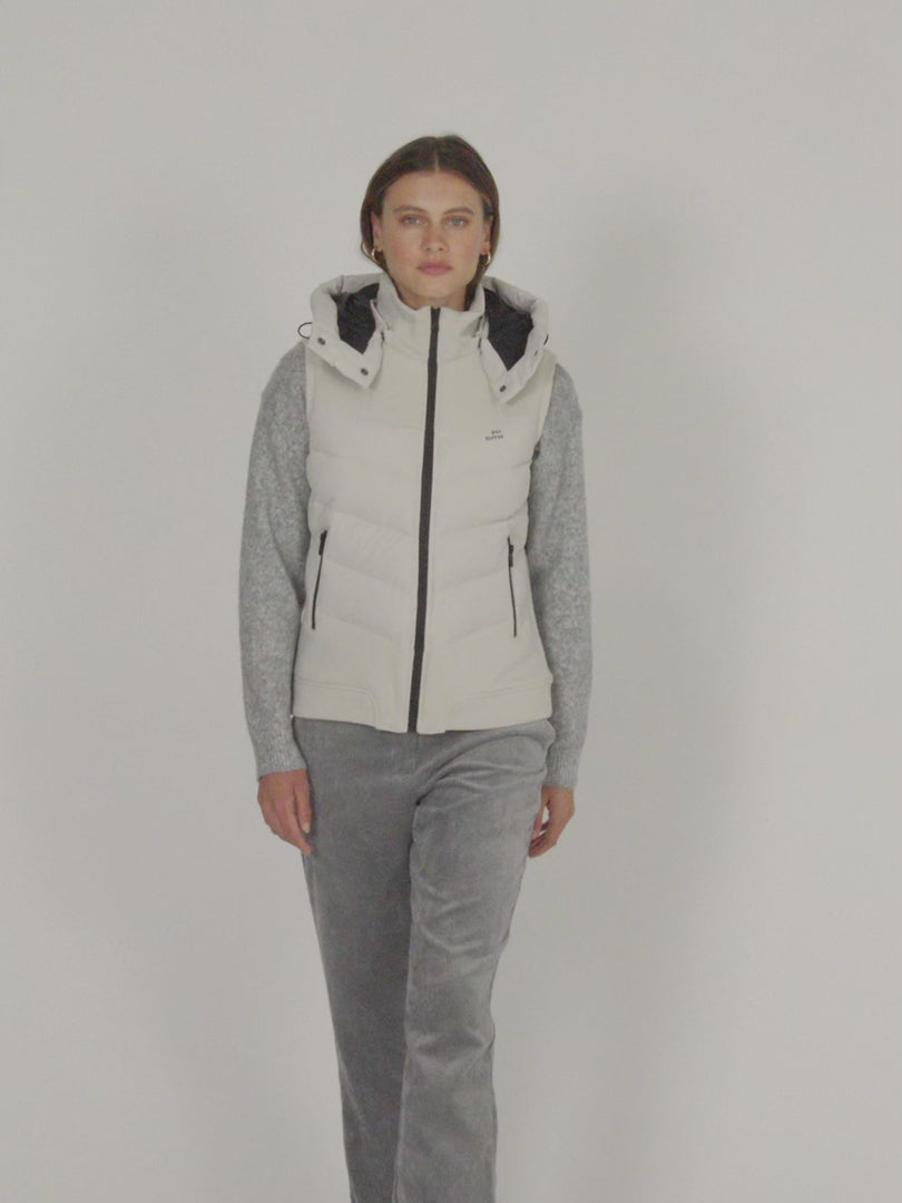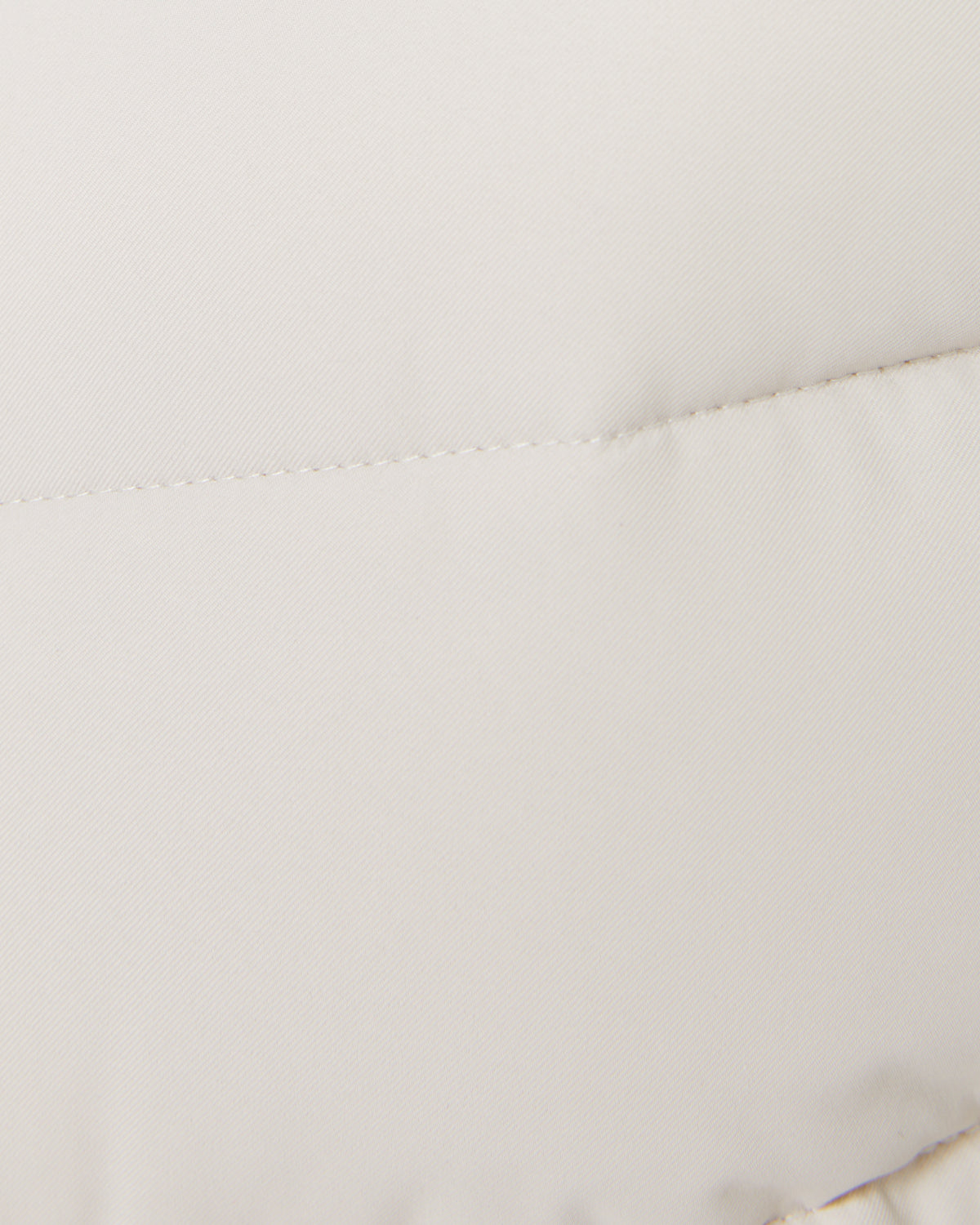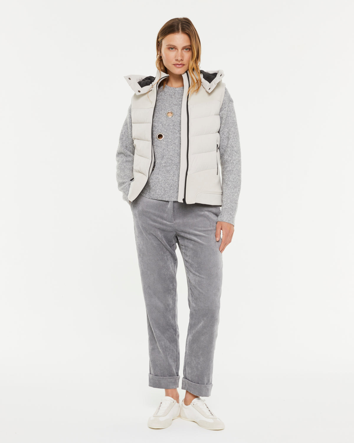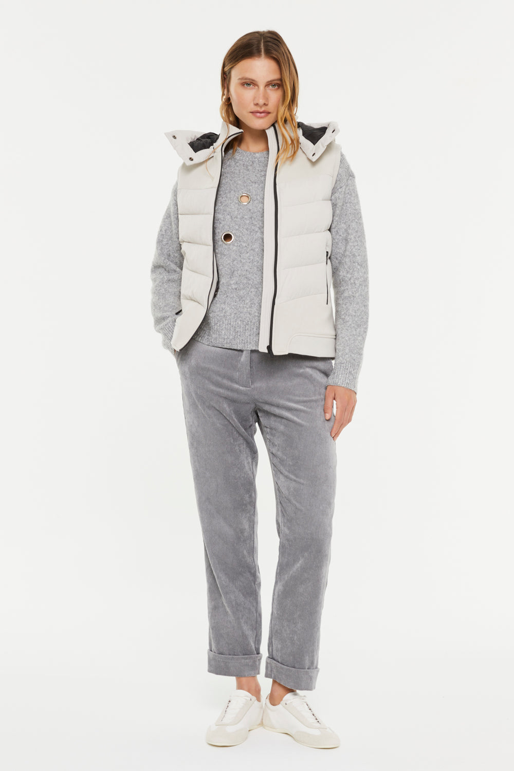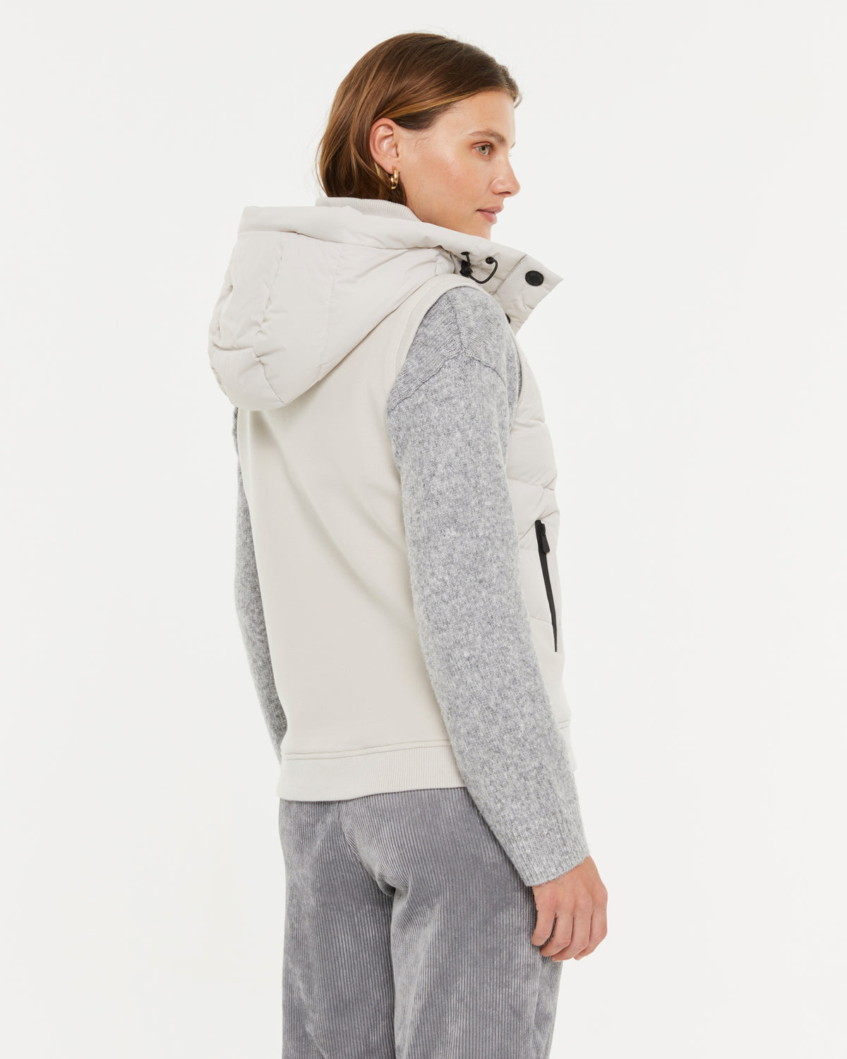 Chaleco corto acolchado con cuello alto de punto, capucha desmontable, broches a presión y bolsillos de cremallera contrastado. Confeccionado delantero tejido técnico y espalda de punto. Cierre frontal con cremallera. Regular fit.
