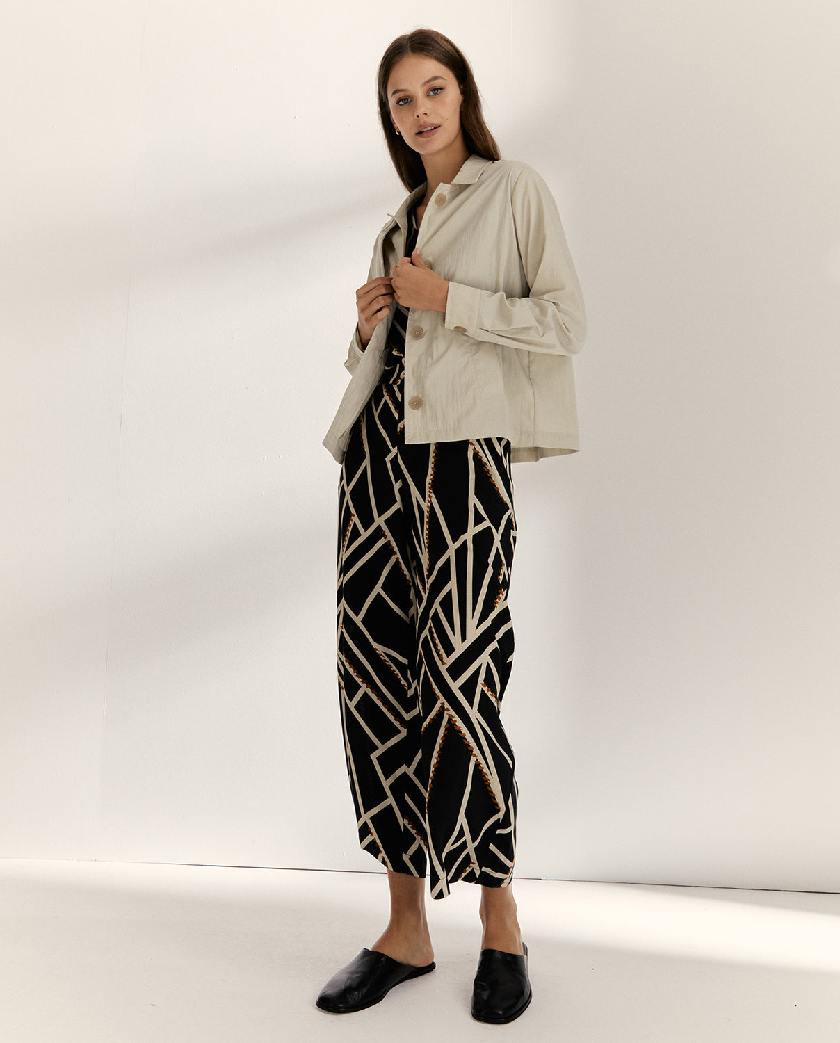 Chaqueta de corte básico, en lado derecho delantero con canesú y un botón, cuello camisero y manga larga. Cierre frontal con botones y bolsillos laterales con tapeta. Una prenda versátil ideal para completar looks casuales con toque natural y moderno.