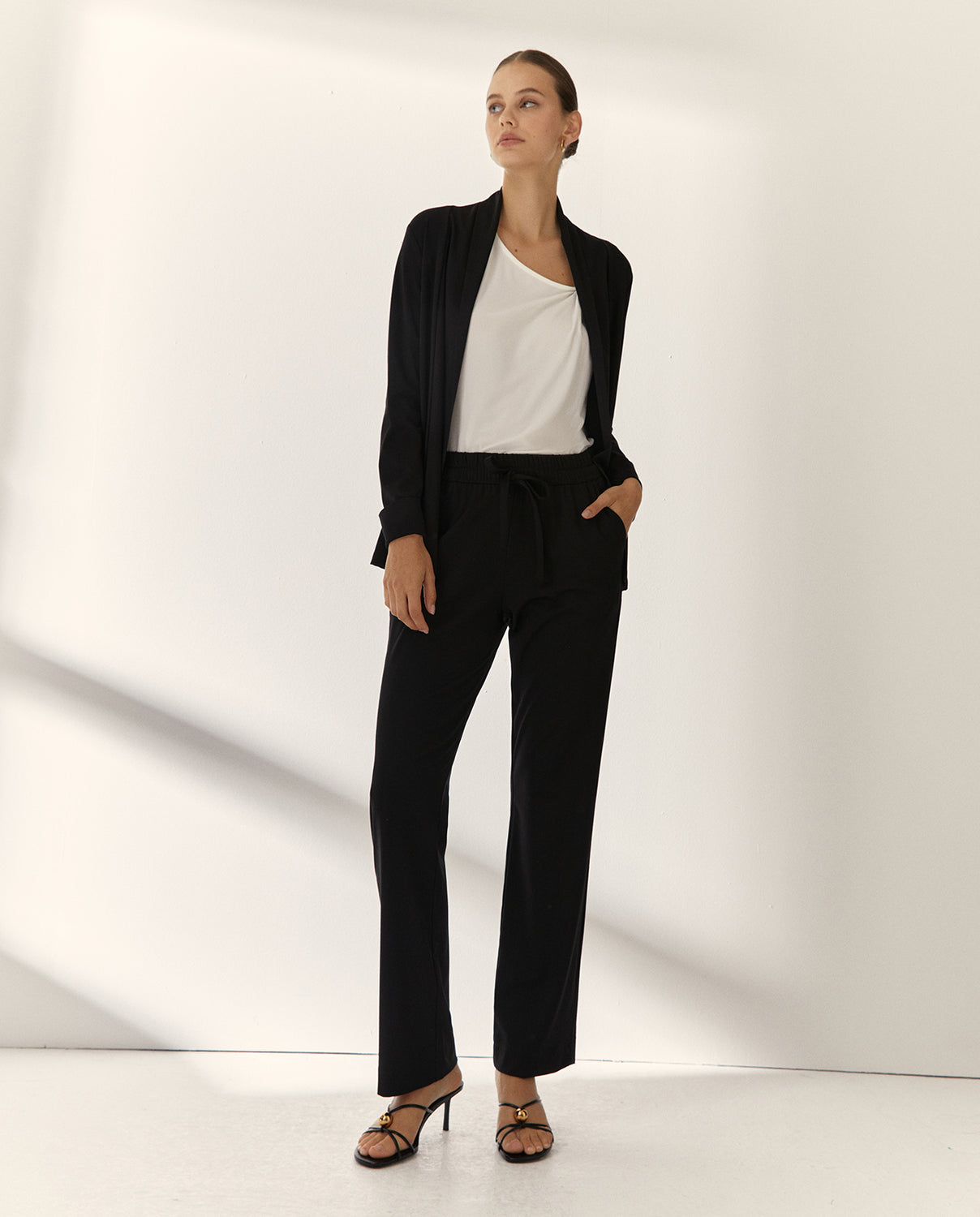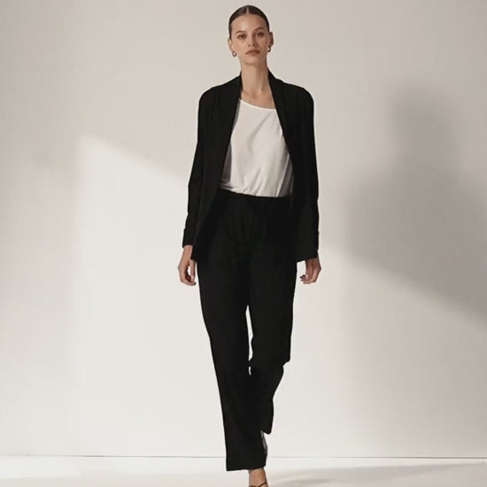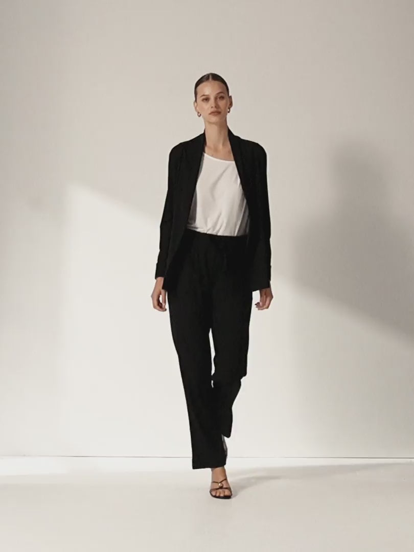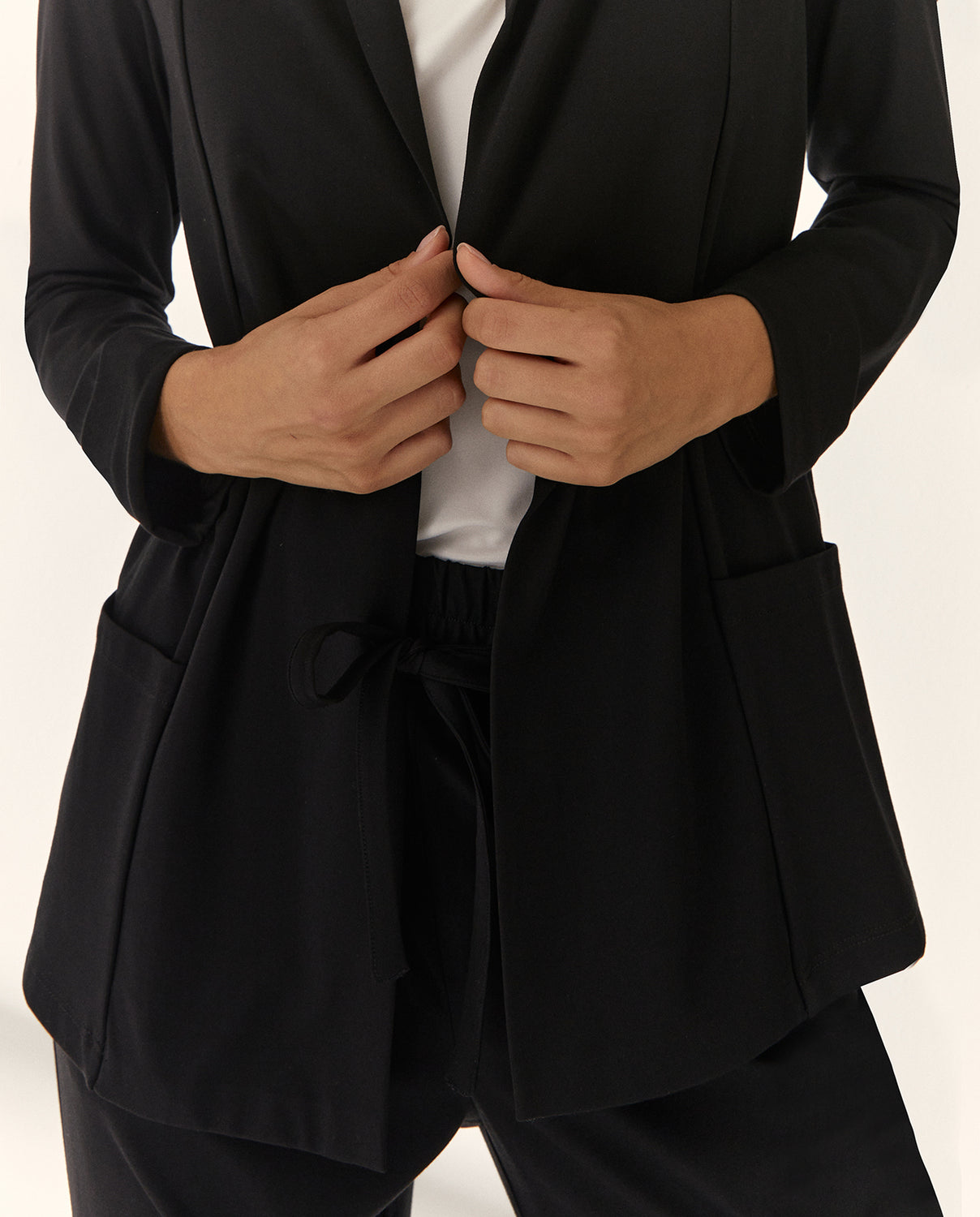 Chaqueta de punto liso con manga larga y puños con vuelta para un acabado pulido y moderno. Incorpora cuello tipo smoking que aporta un toque sofisticado, bolsillos frontales prácticos y discretos. Una prenda versátil y estilosa. Regular fit.