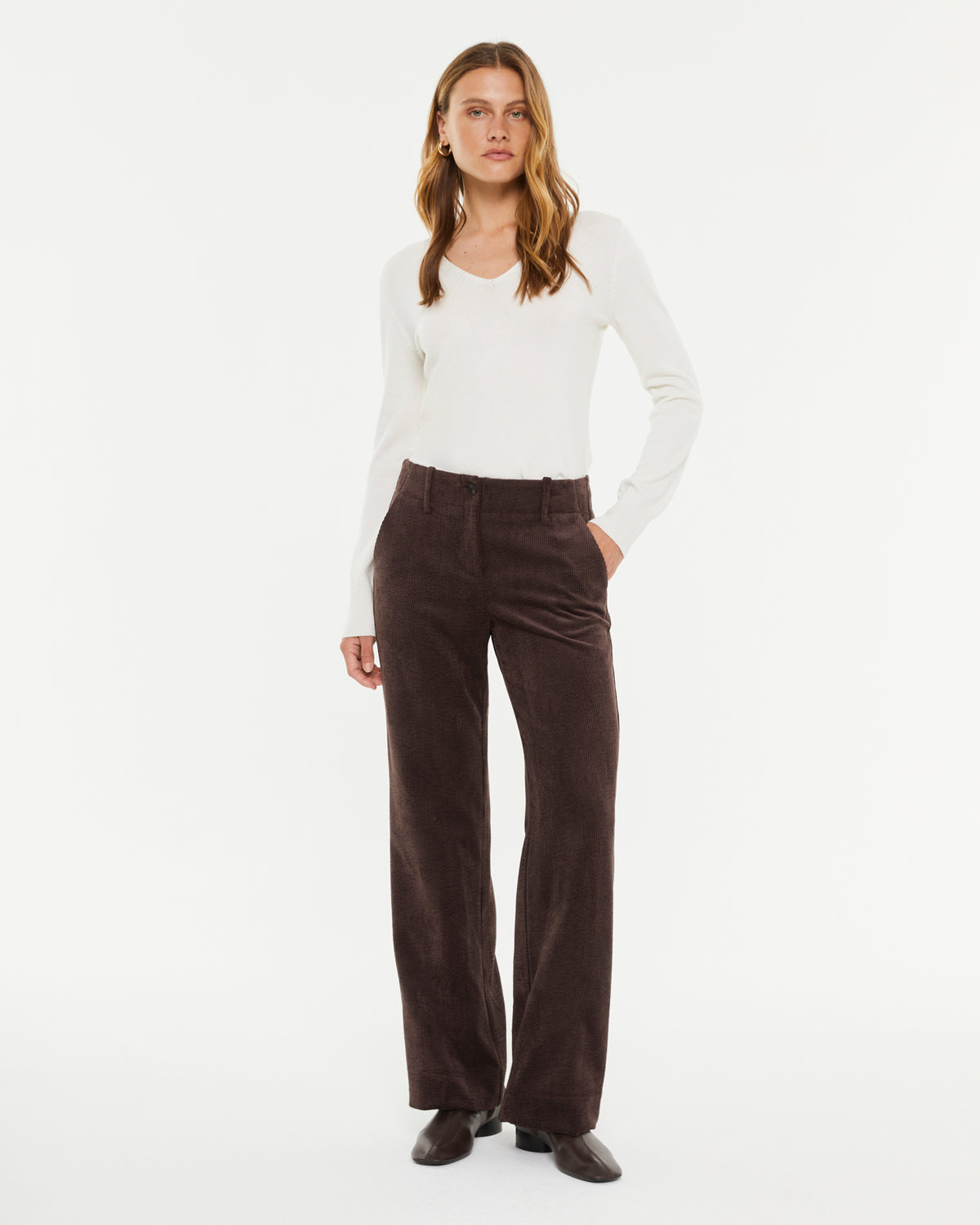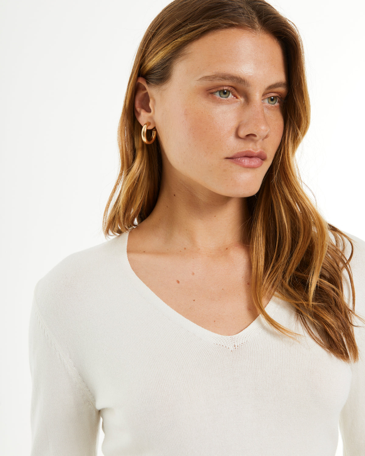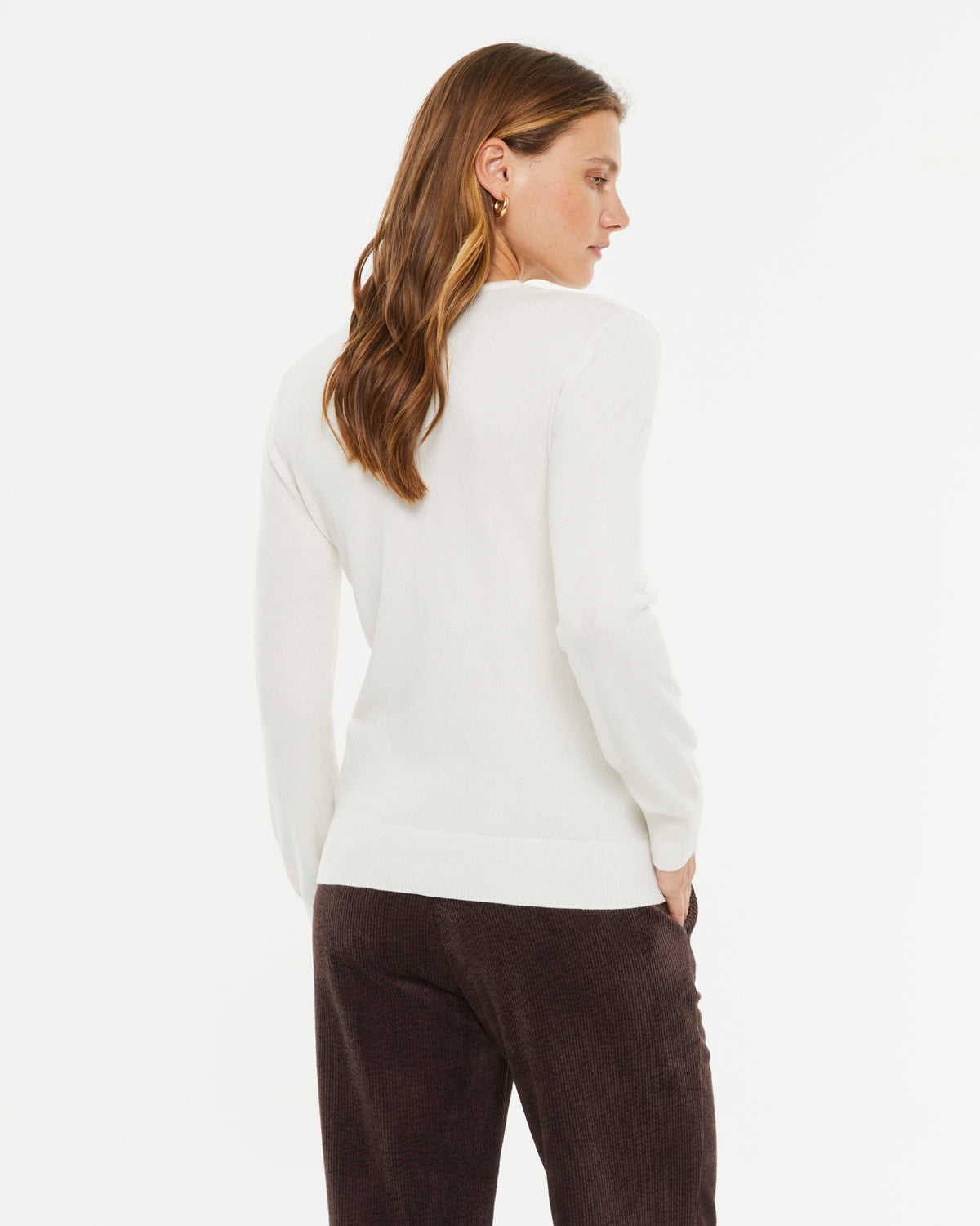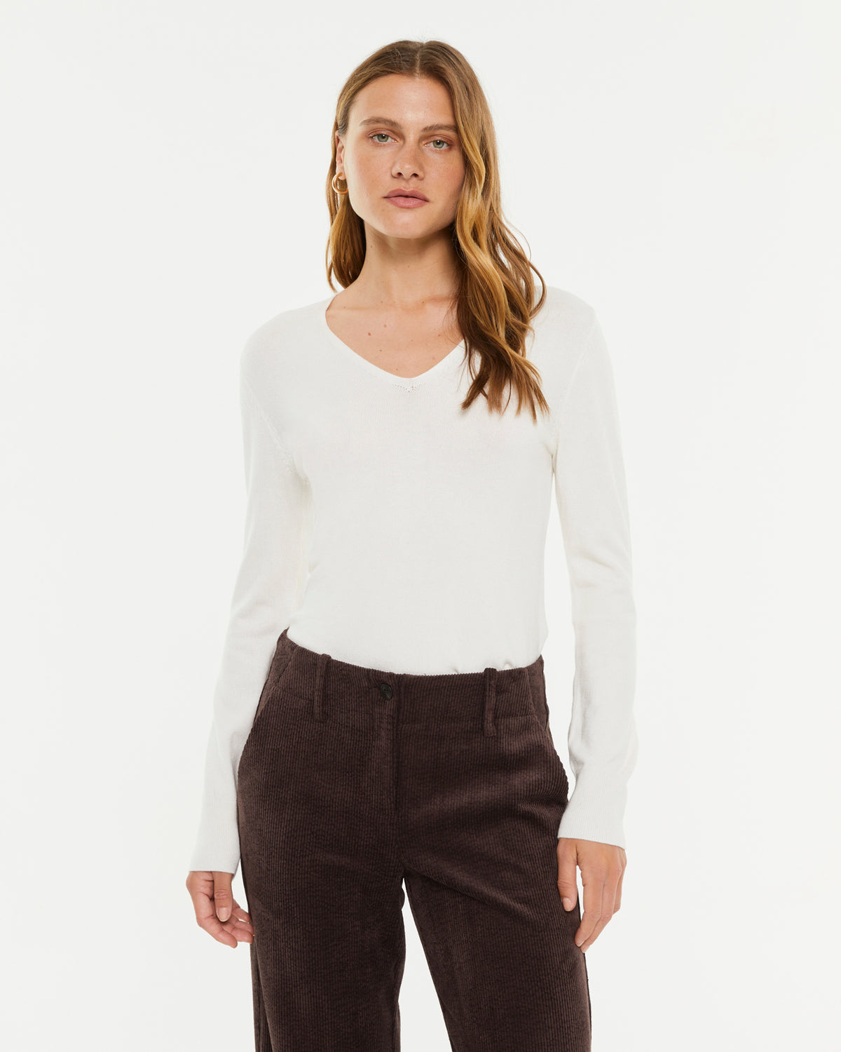 Jersey de punto liso, cuello pico y manga larga. Textura suave. Un básico imprescindible. Regular fit.