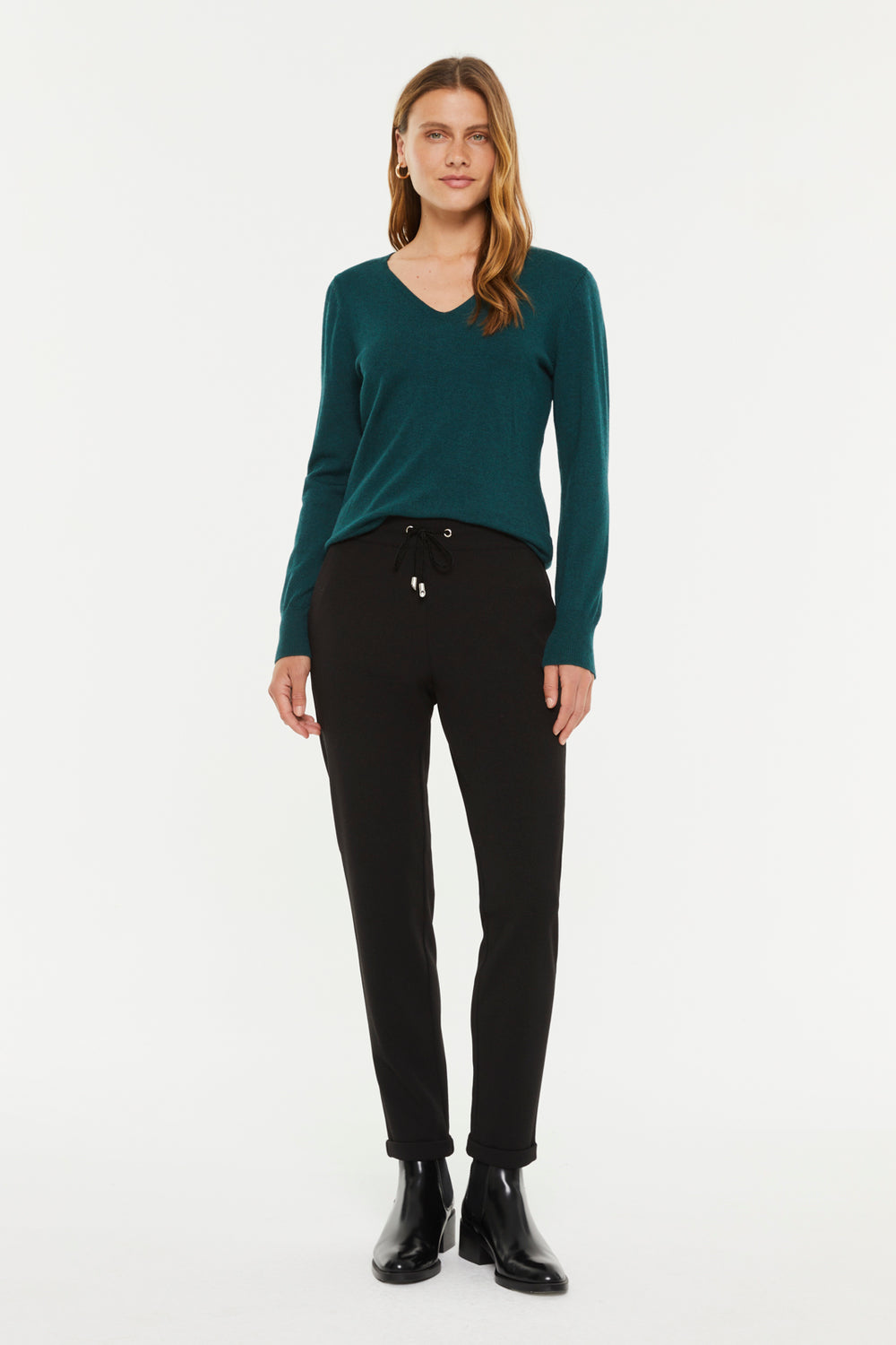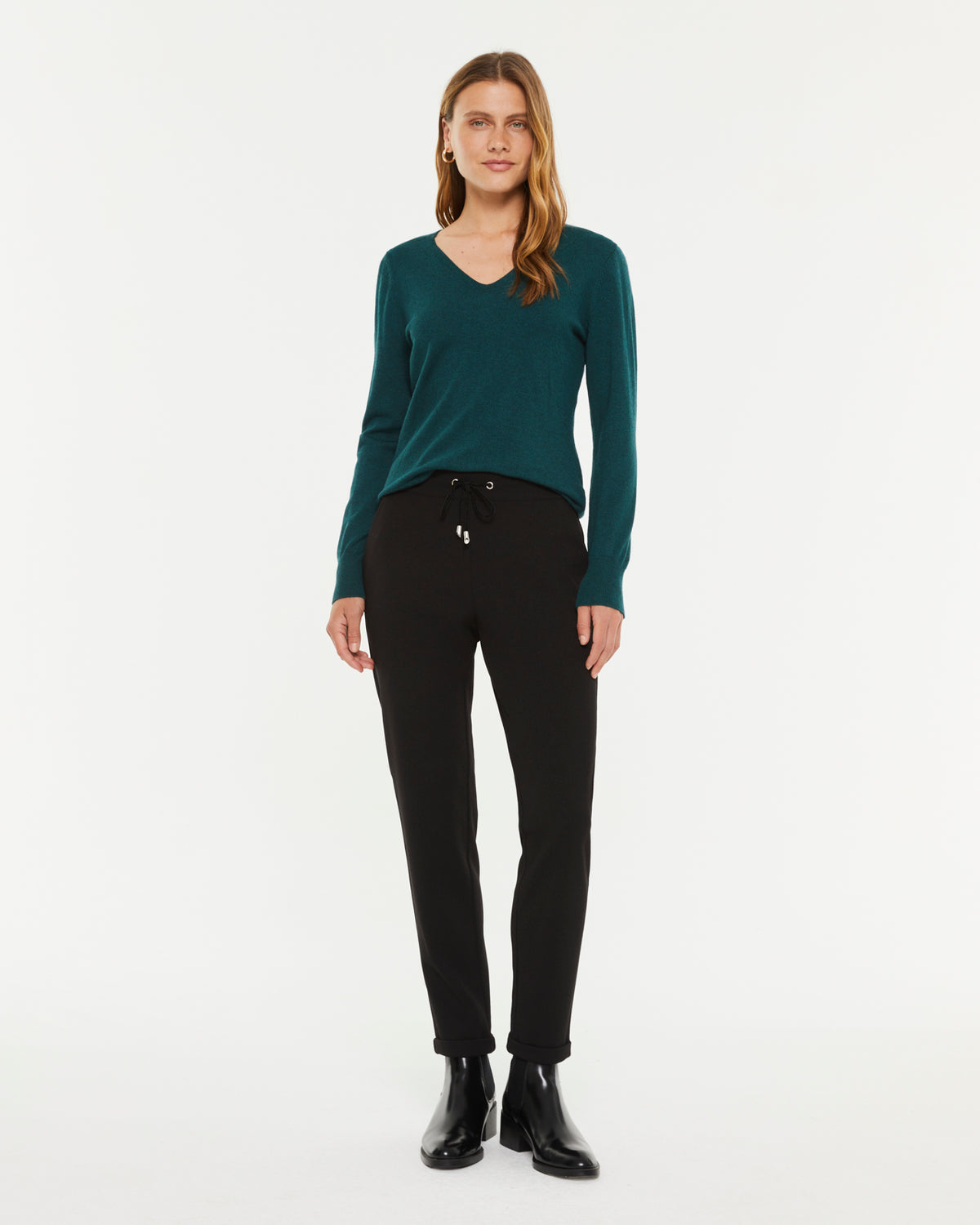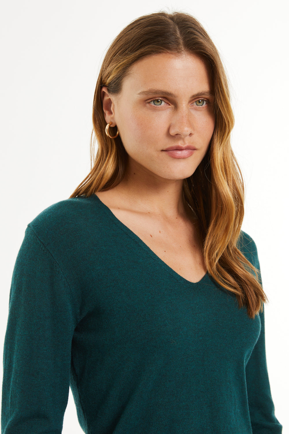 Jersey de punto liso, cuello pico y manga larga. Textura suave. Un básico imprescindible. Regular fit.