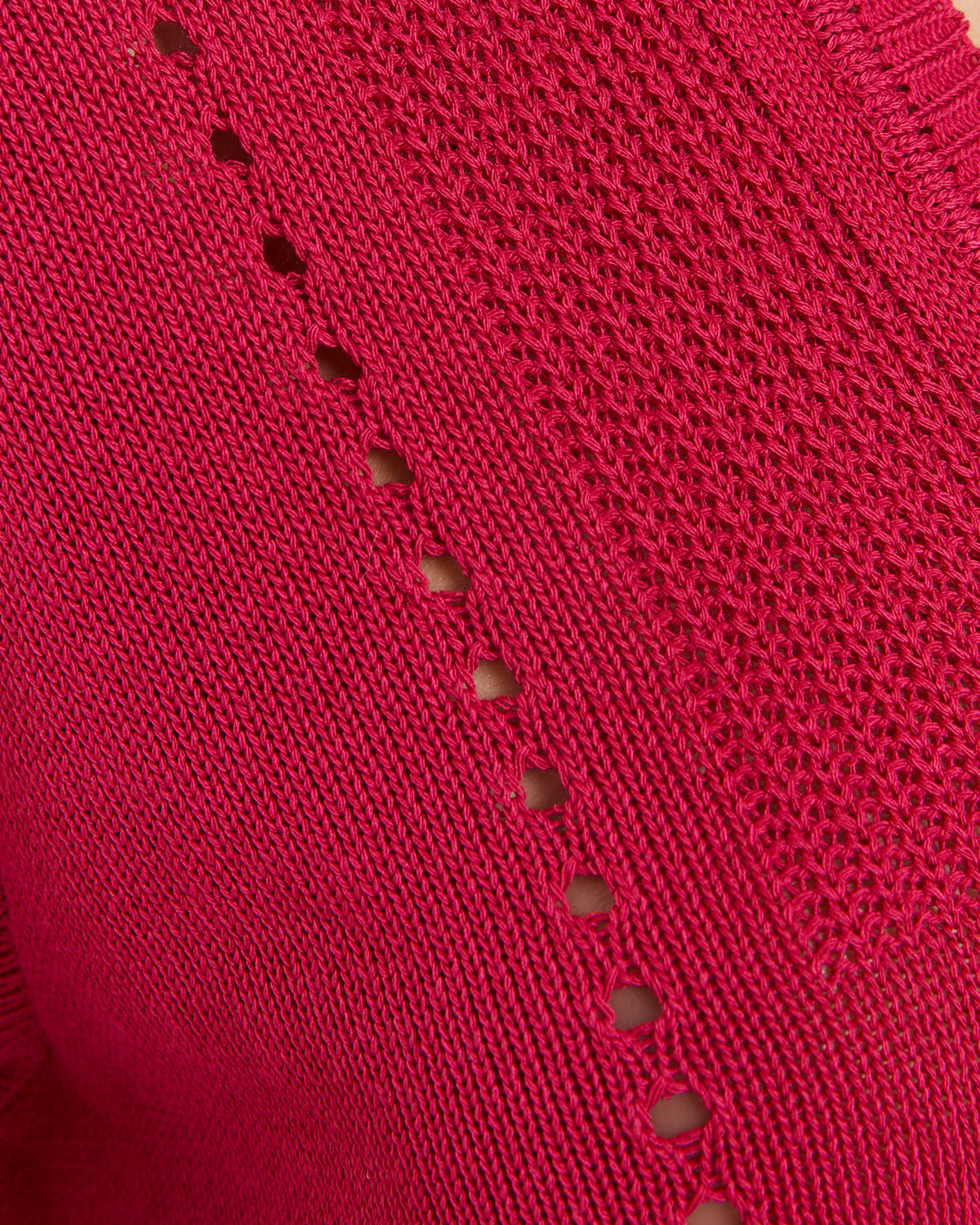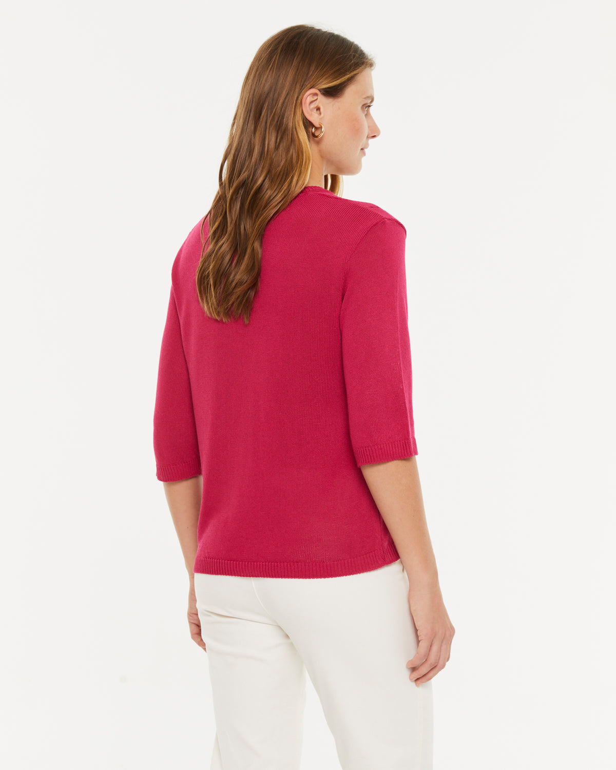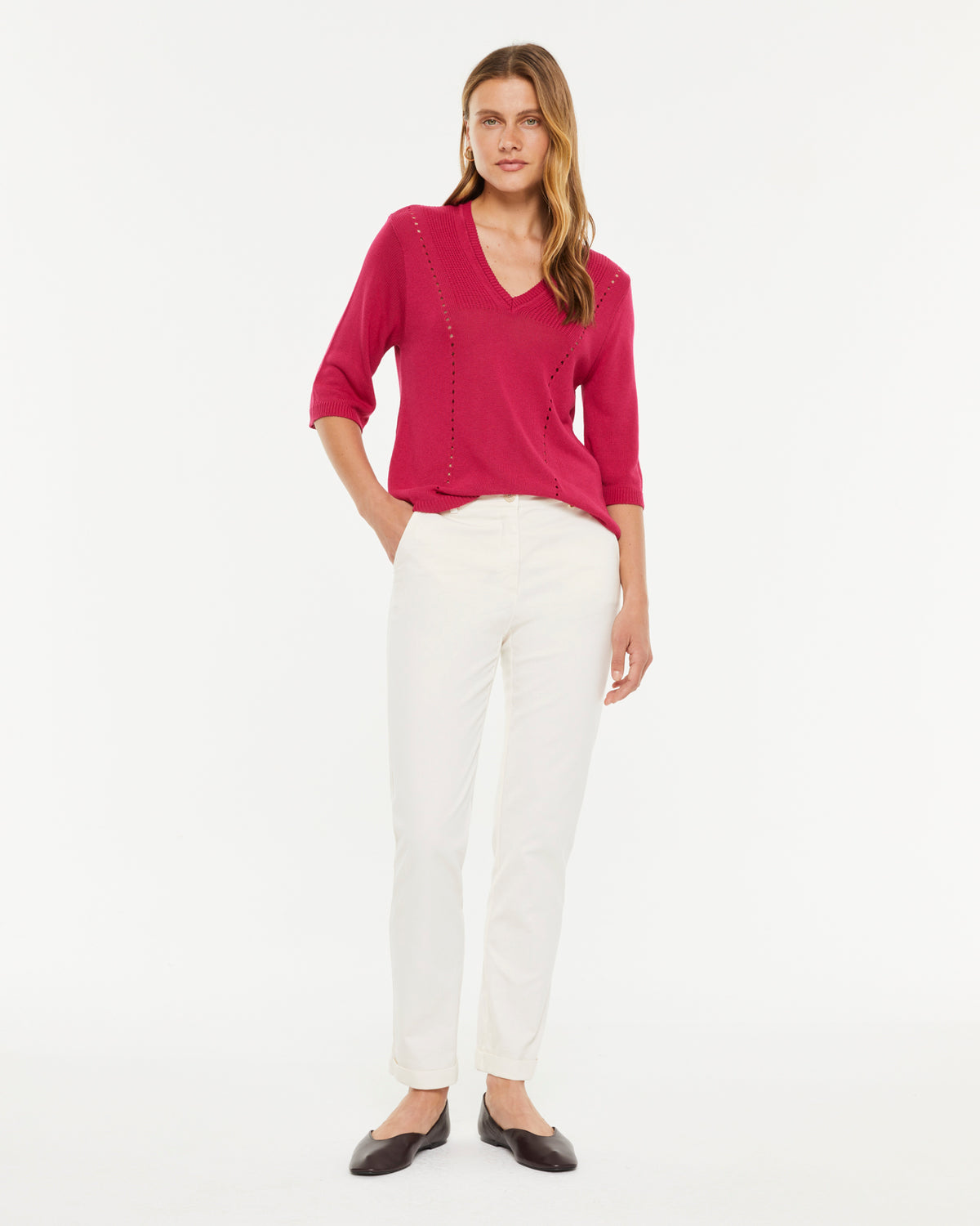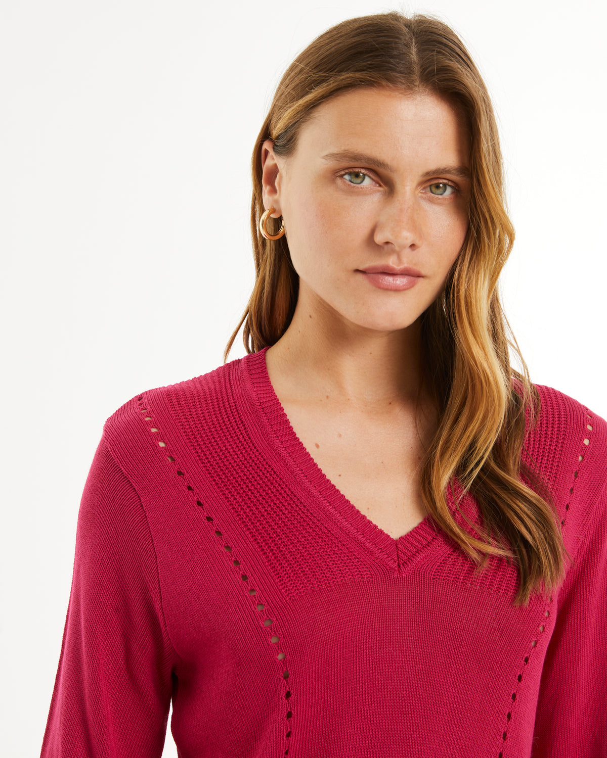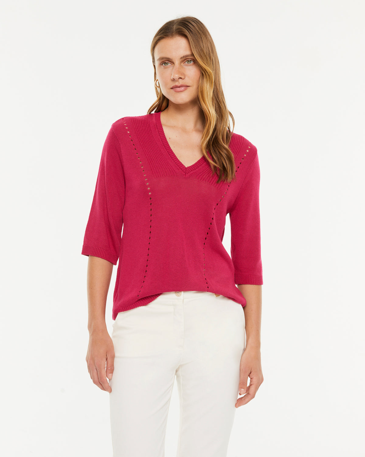 Jersey de cuello pico y manga a codo. Detalle de calados en parte delantera. Es un jersey muy femenino y confortable. Regular fit.