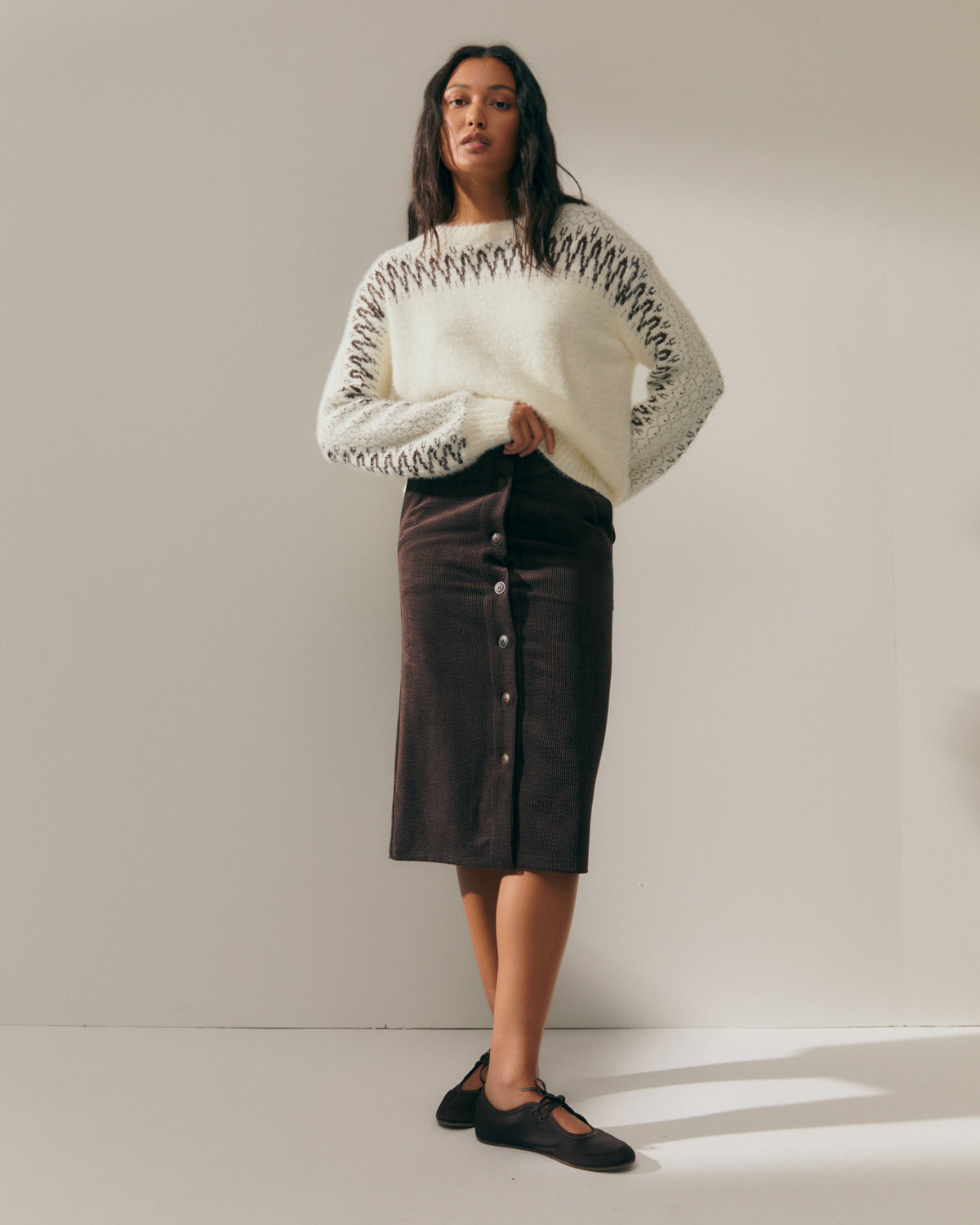 Jersey efecto pelo en jacquard con hilo metalizado, cuello redondo y manga larga. Regular fit.