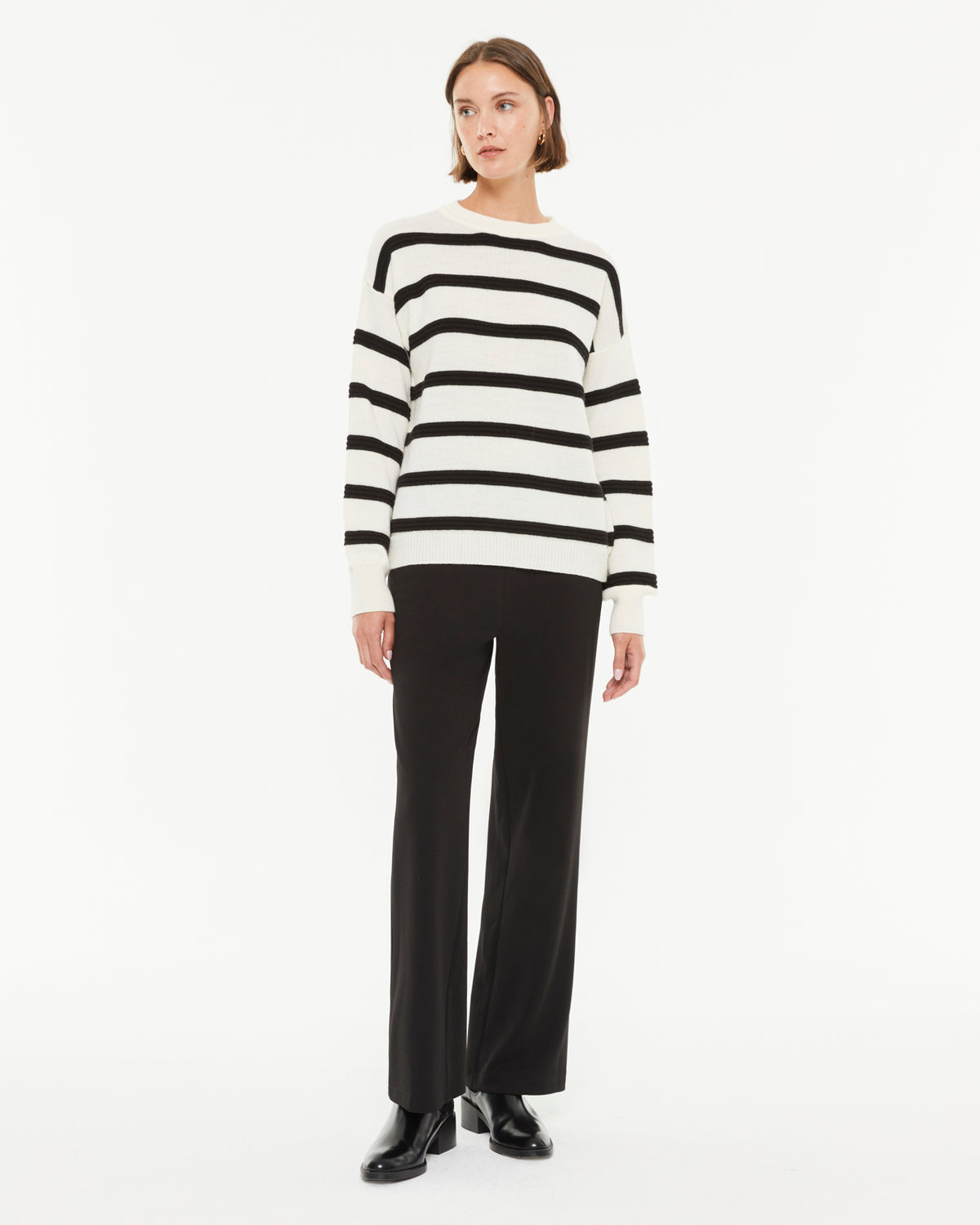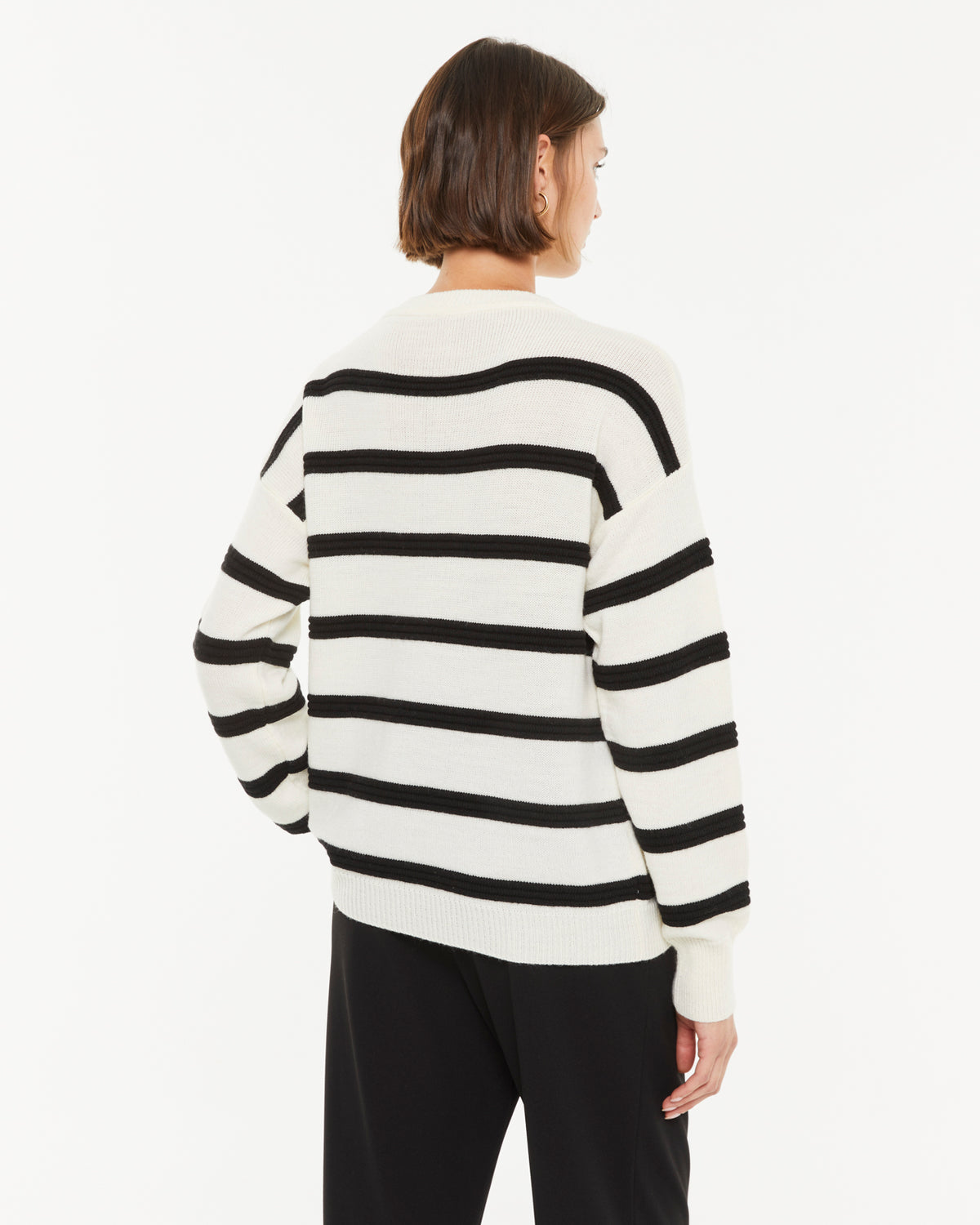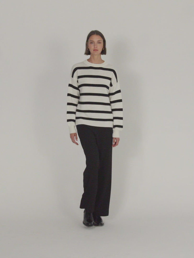 Jersey bicolor de rayas manga larga y cuello redondo. Confección de canalé en cuello puños y bajo. Regular fit.