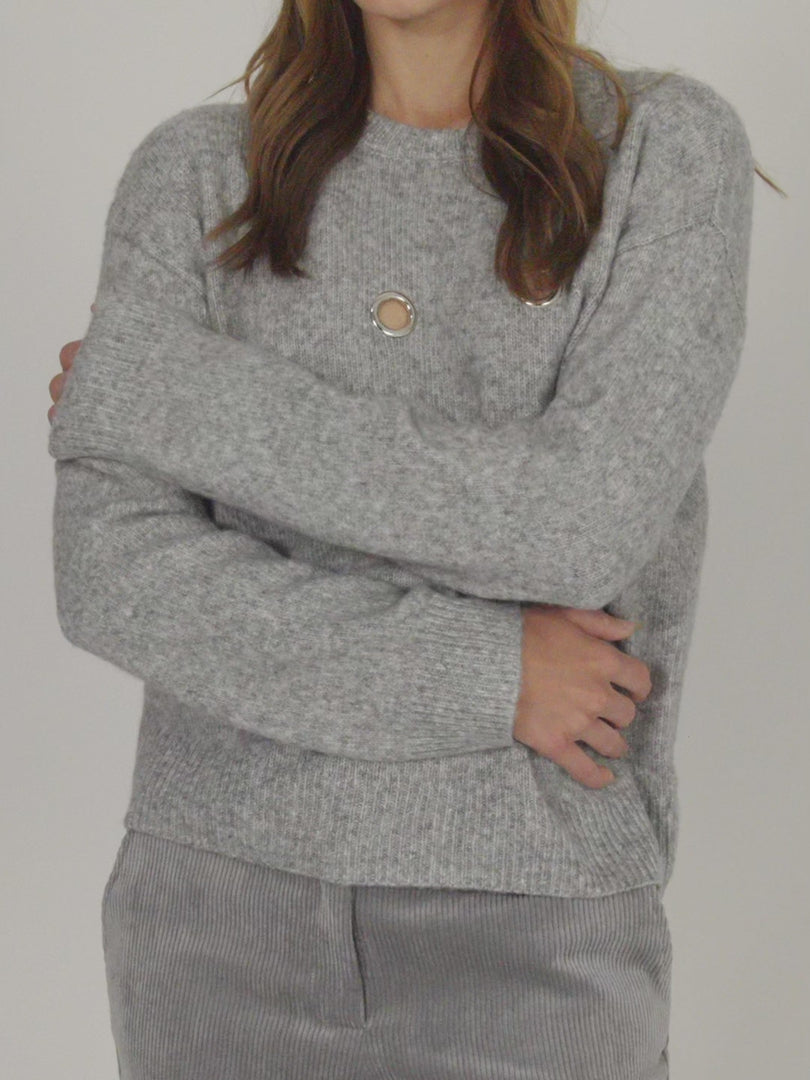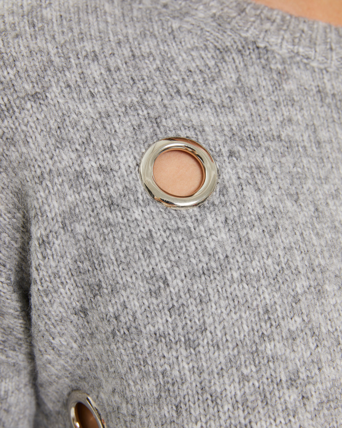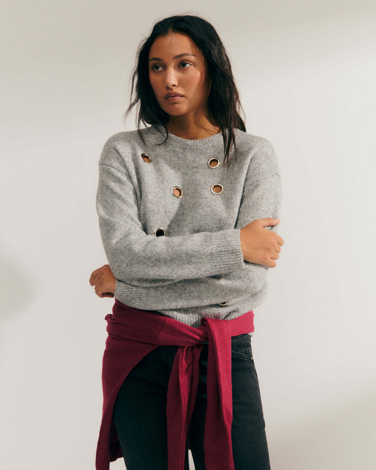 Jersey de manga larga y cuello redondo. Detalle de arandelas metálicas en acabado níquel.Confección de canalé en cuello, puños y bajo. Regular fit.
